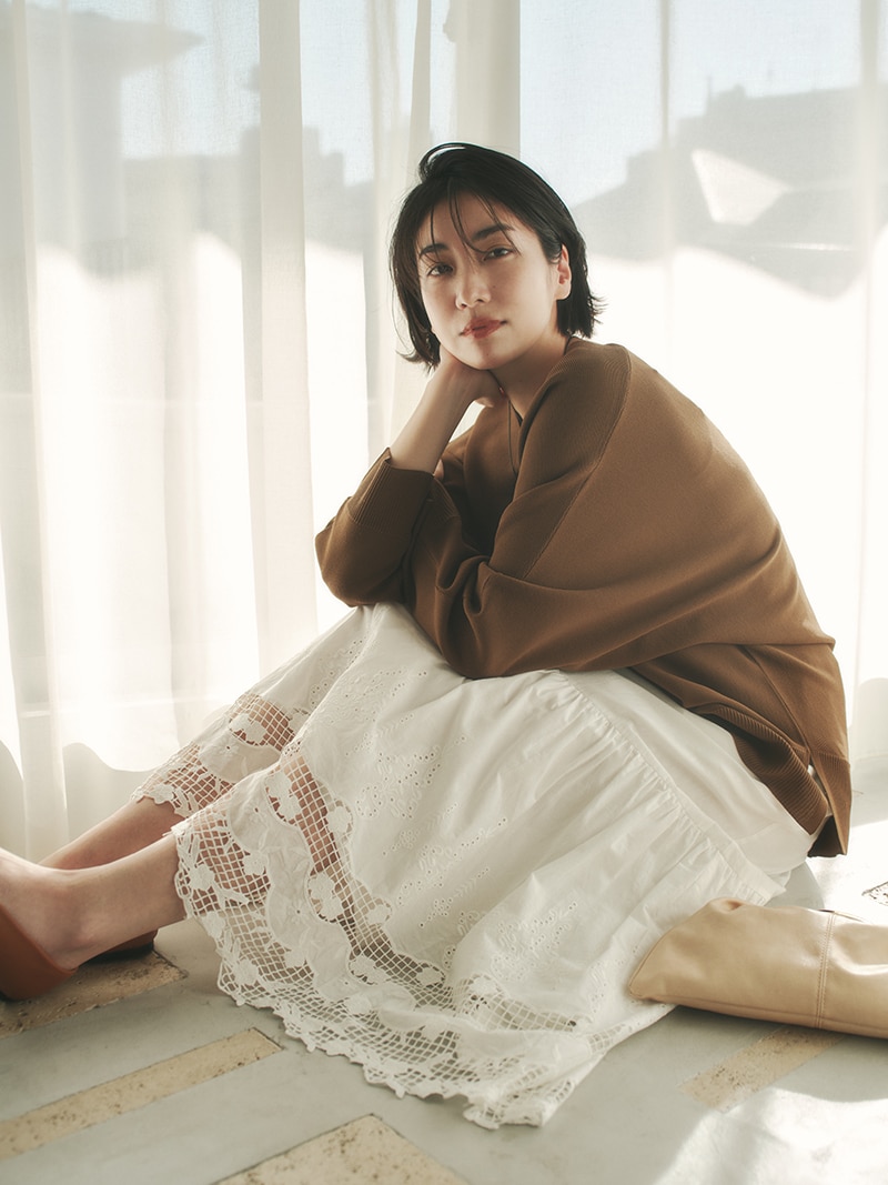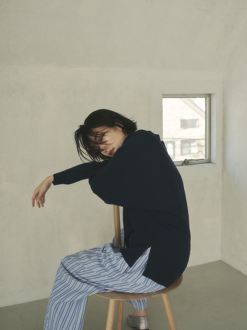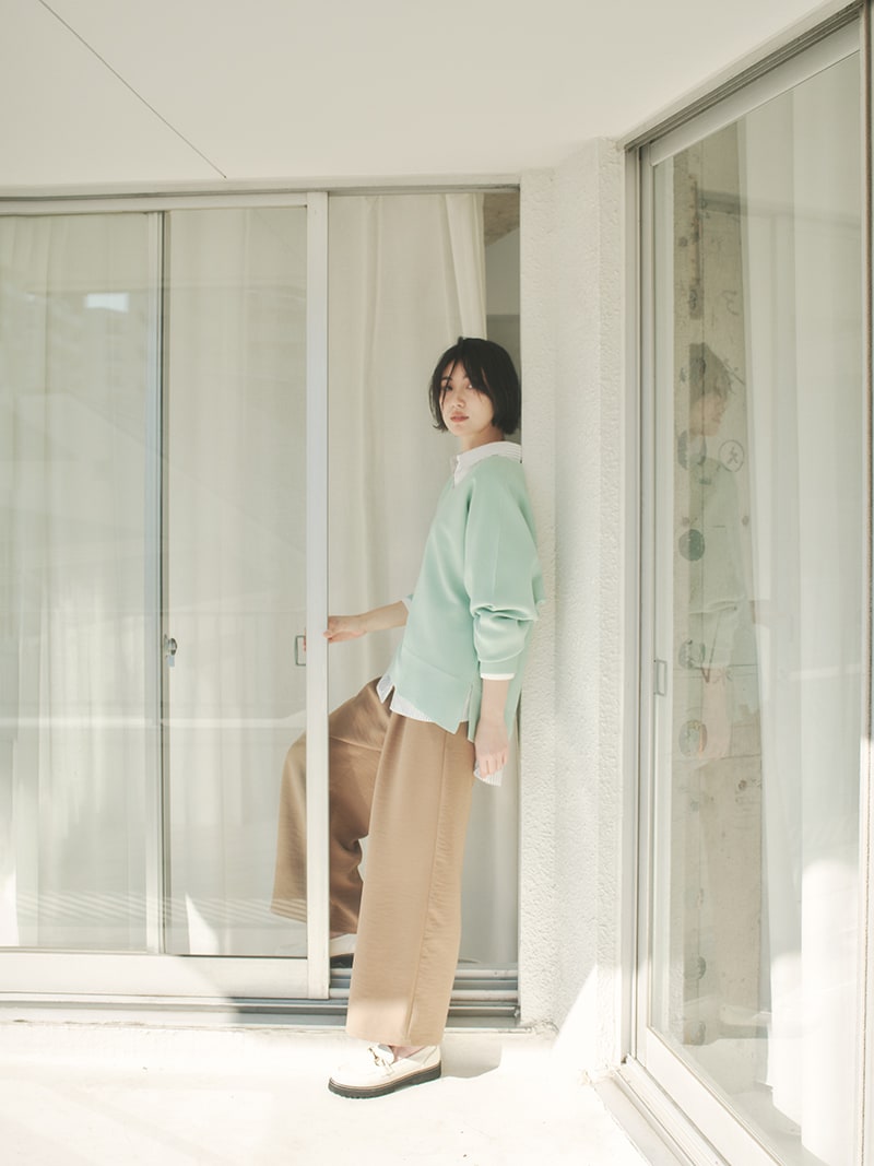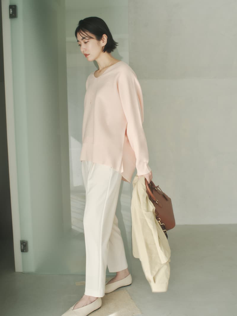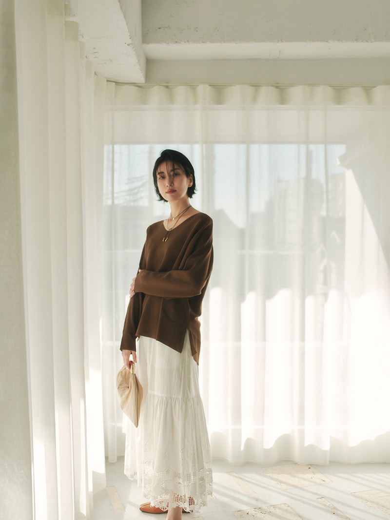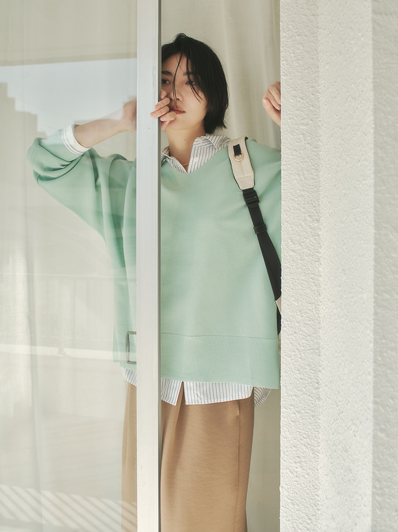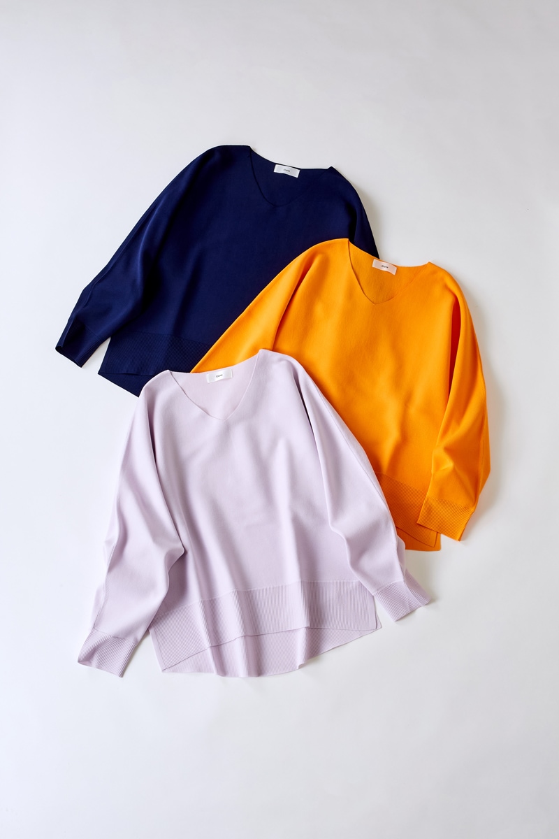 緩やかなシルエットが完成するドルマン袖。お腹まわりなど気になる部分を拾わずに、でもだらしなく見えないバランスにこだわりました。着方を迷わずにさらっと着られる着丈もポイント。