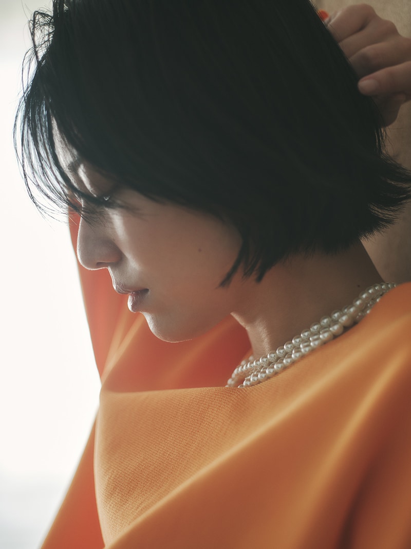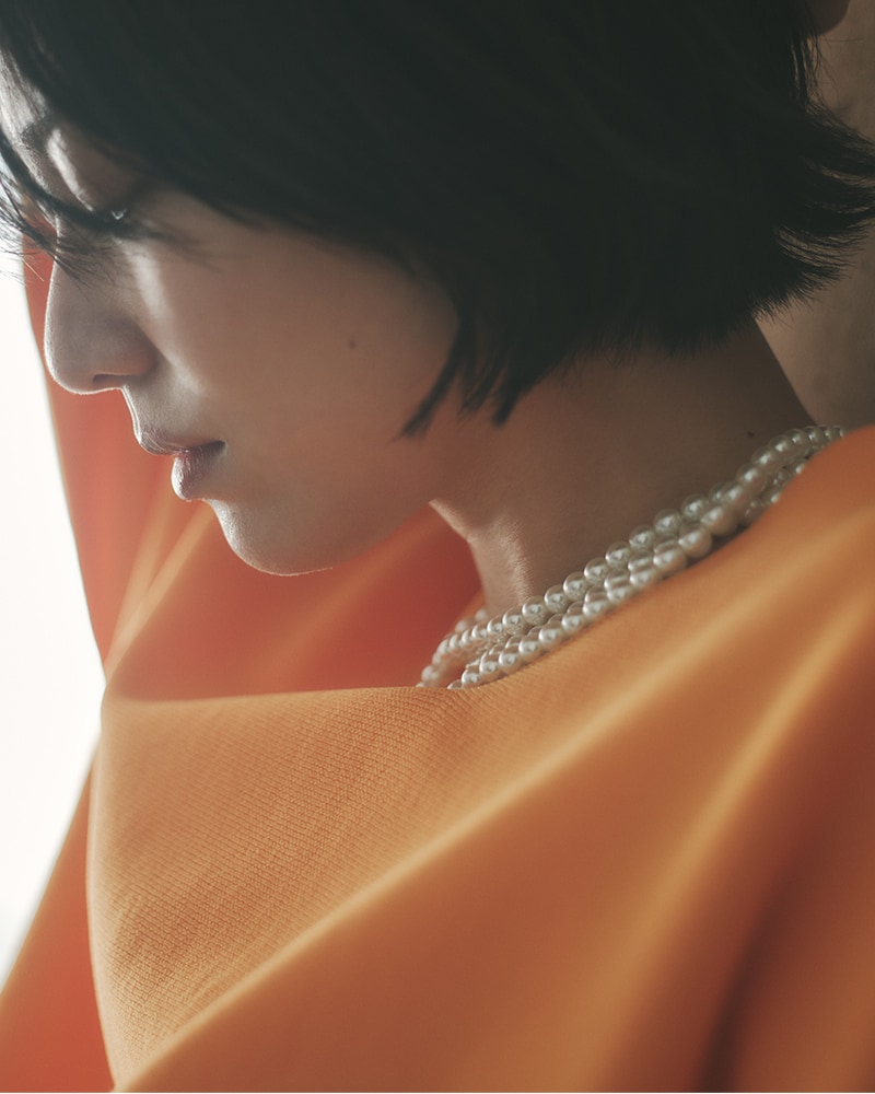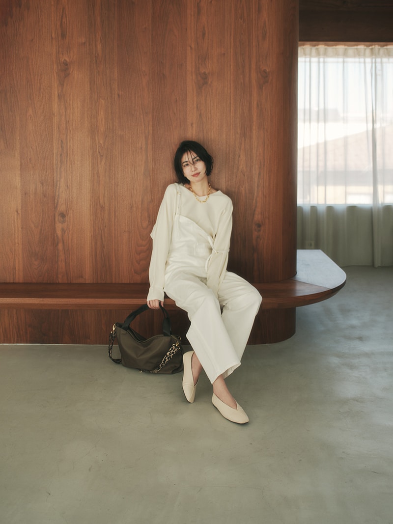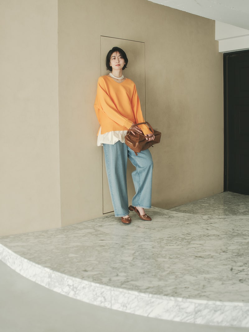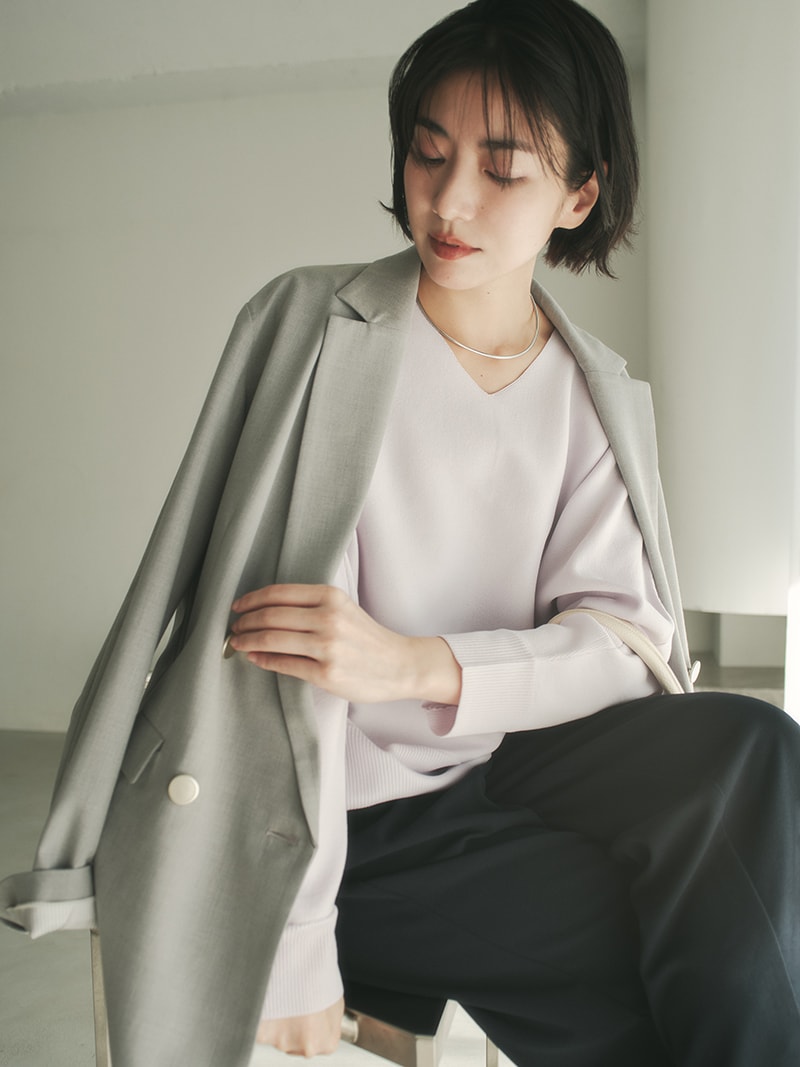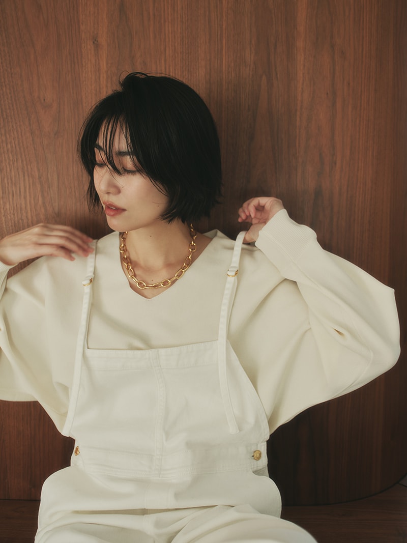 開きすぎてげっそり見えない、上品なスッキリ感を演出。首がきれいに見える程よい詰まり具合に調整しました。インナーにタンクを着ても見えずに着られるちょうど良さもポイントです。