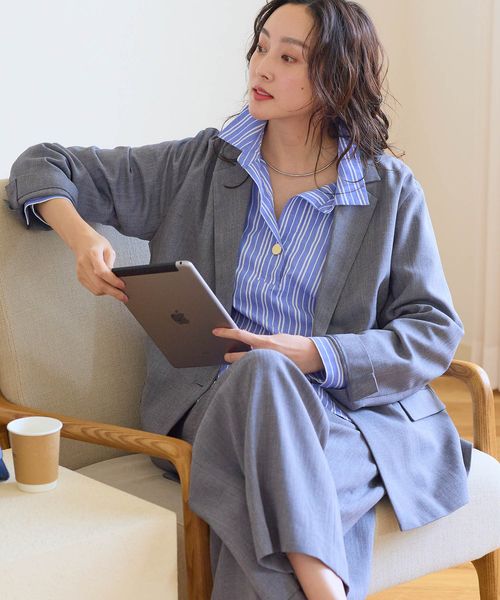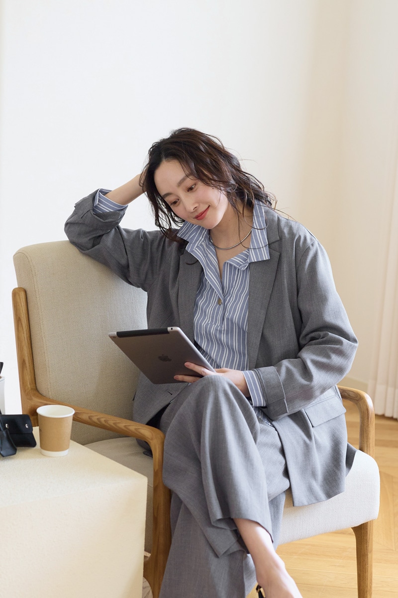 シャツとセットアップなら、オフィスのきちんと感も確保。