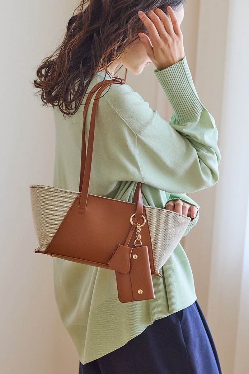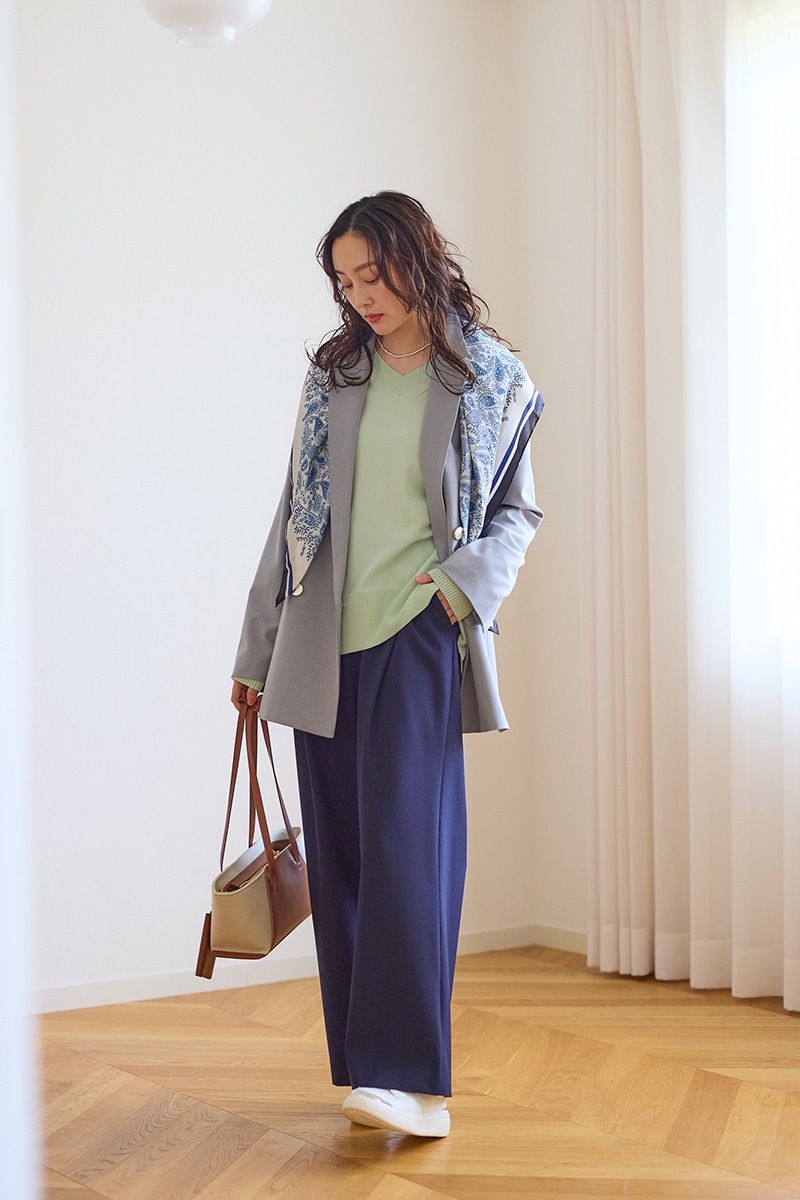 肩掛けでカラーを効かせれば、旬なスタイリングに!