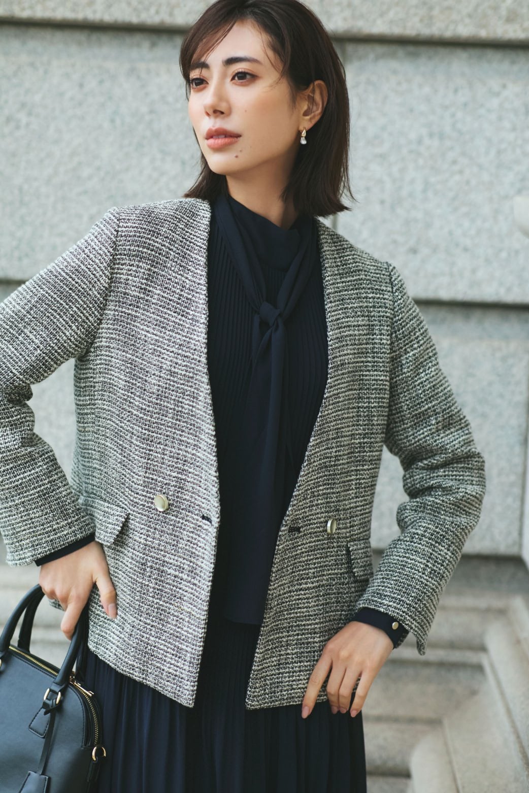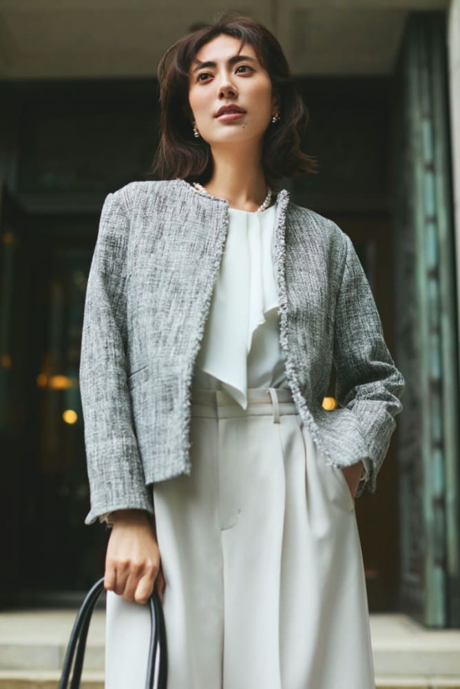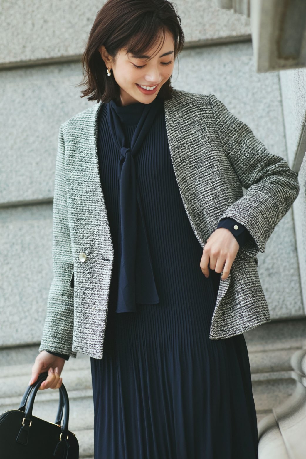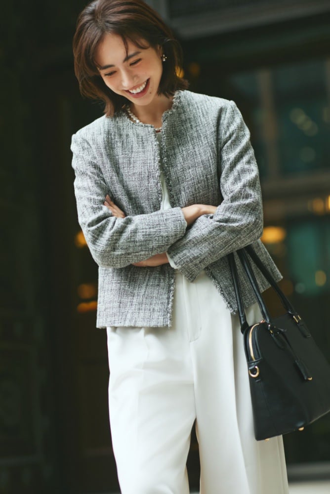 プリーツデザインとツイードの質感で