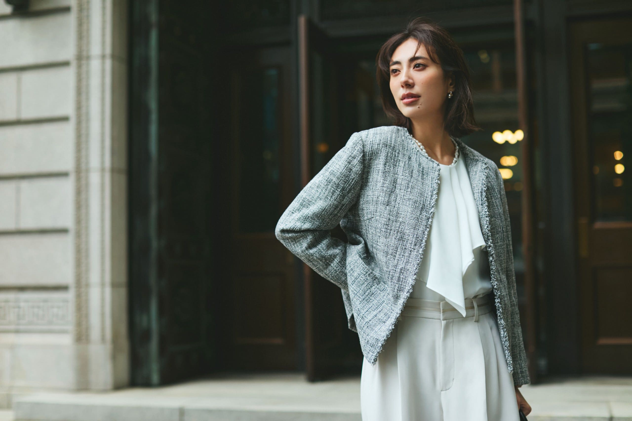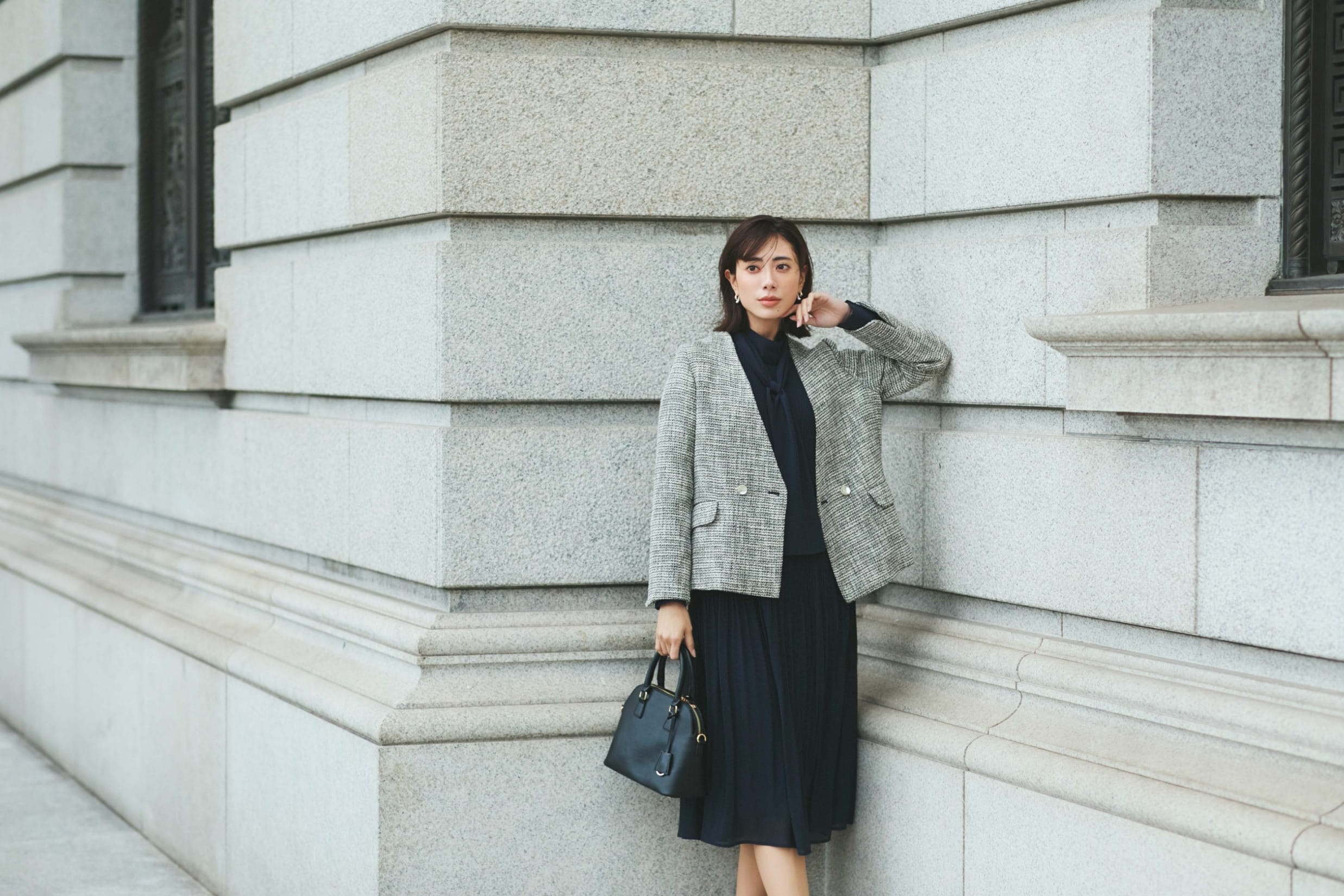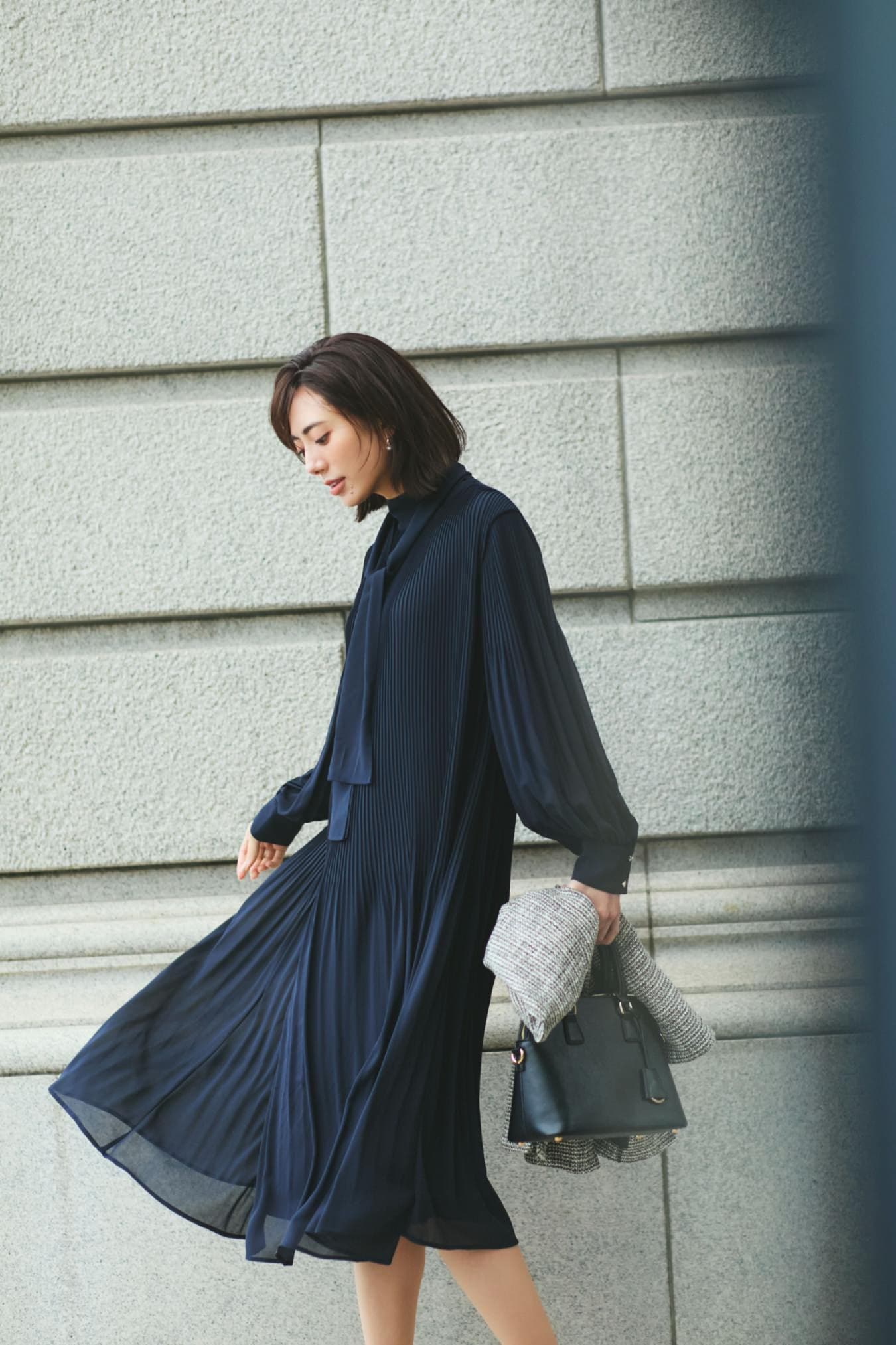 プリーツデザインとツイードの質感で