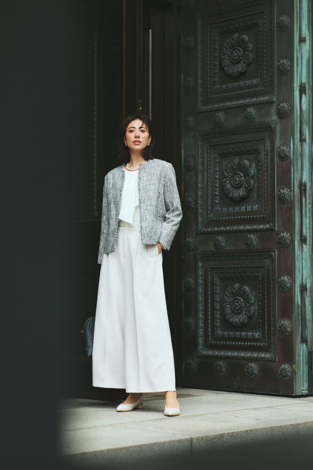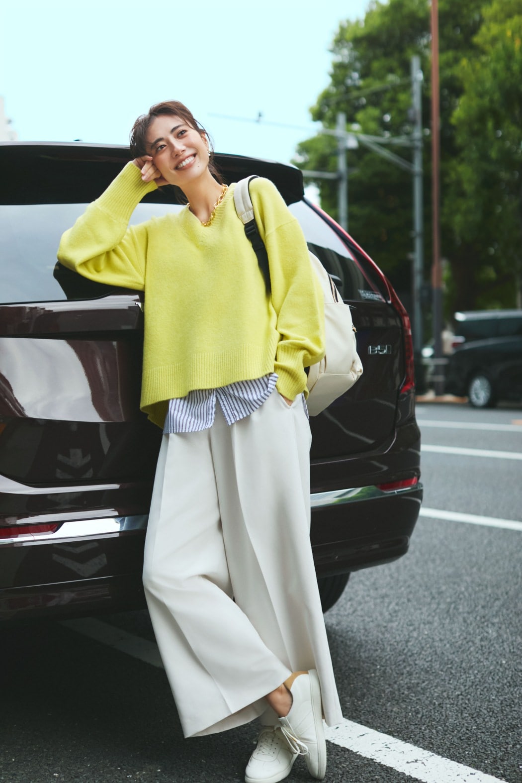 白のワイドパンツが映える