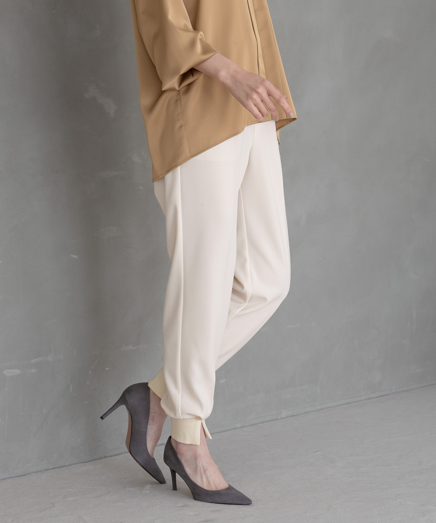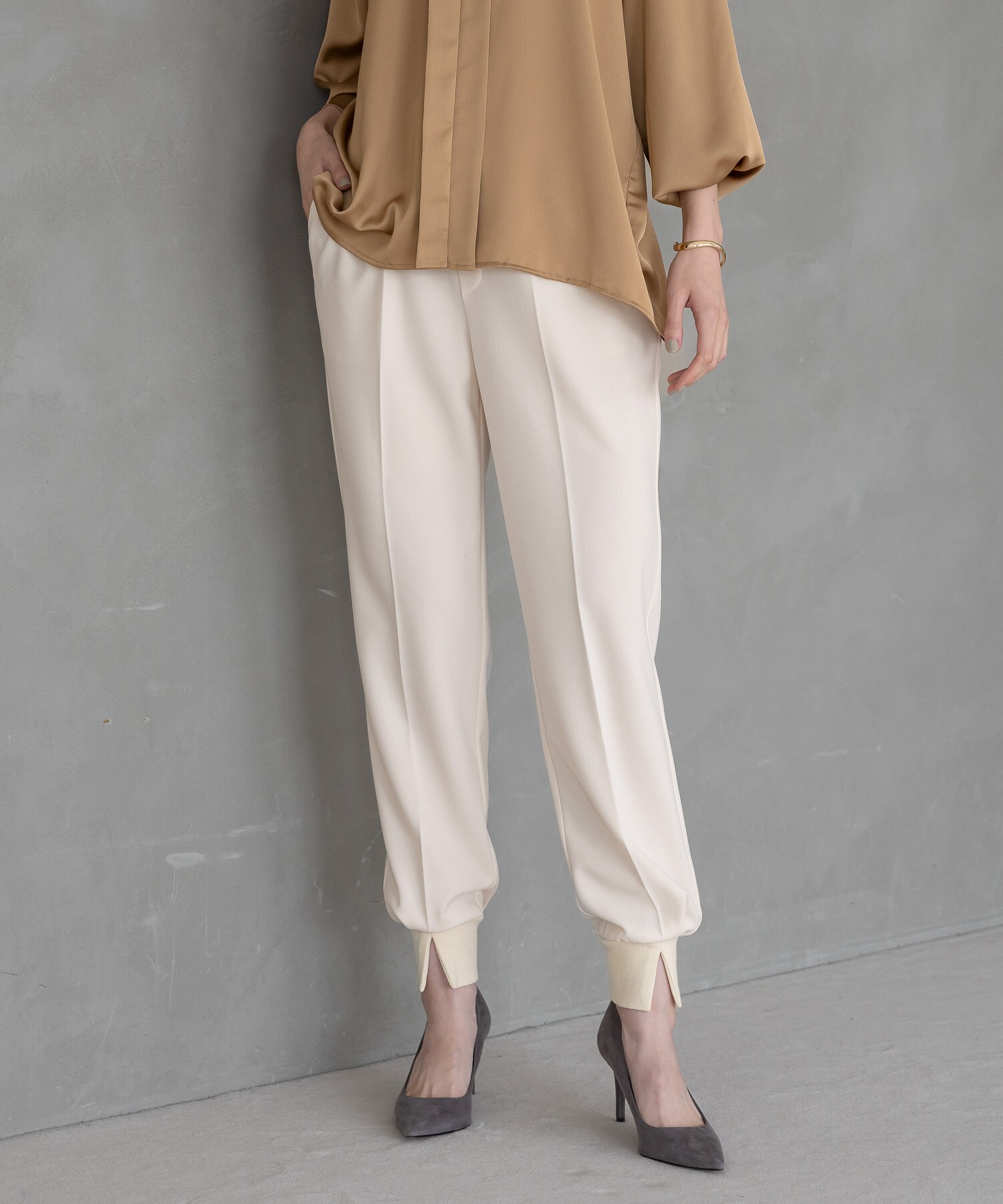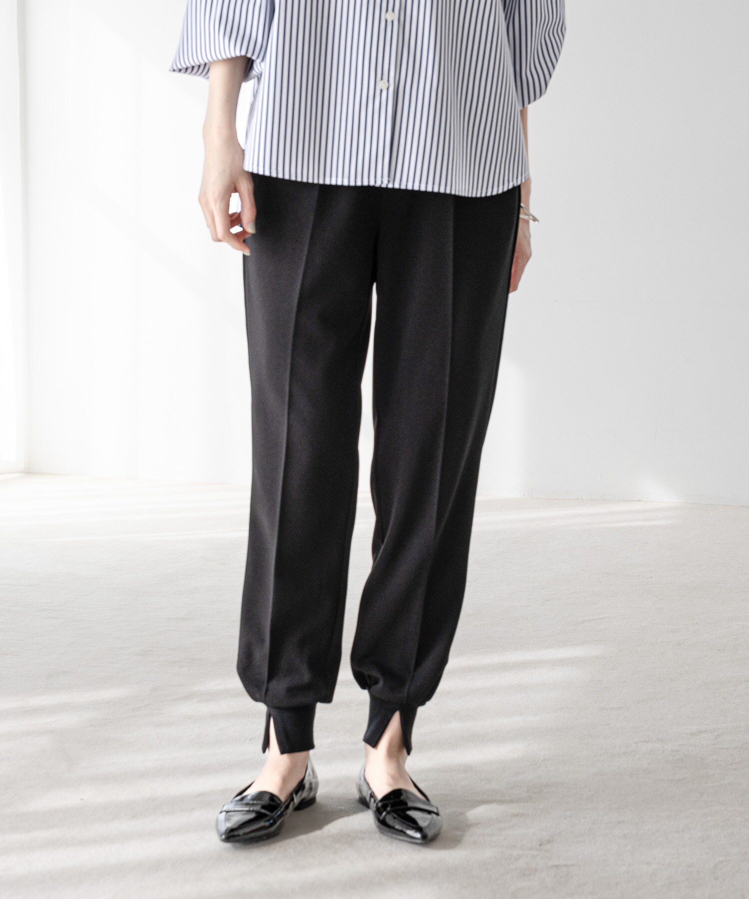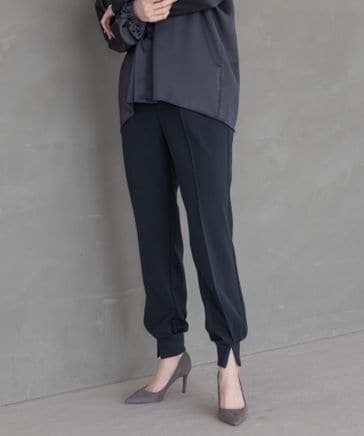 裾リブのフロント部分にスリットを施したジョガーパンツ。