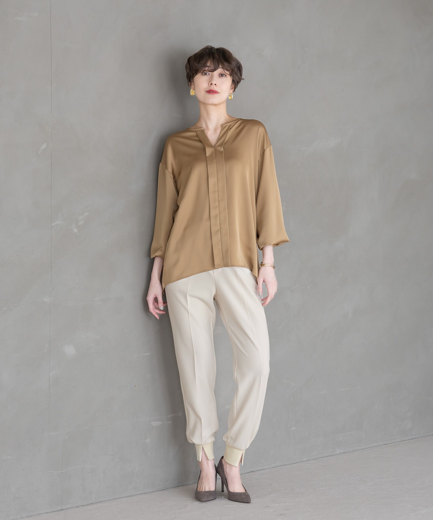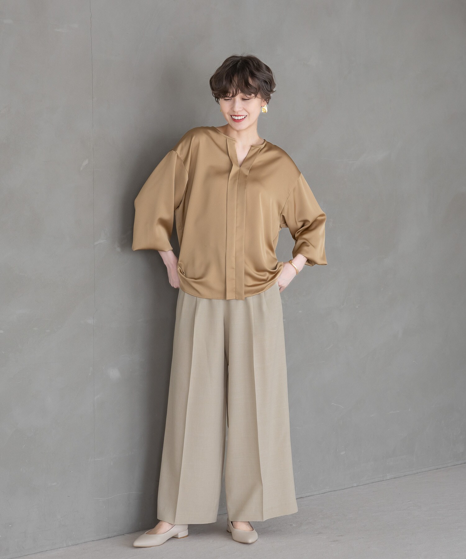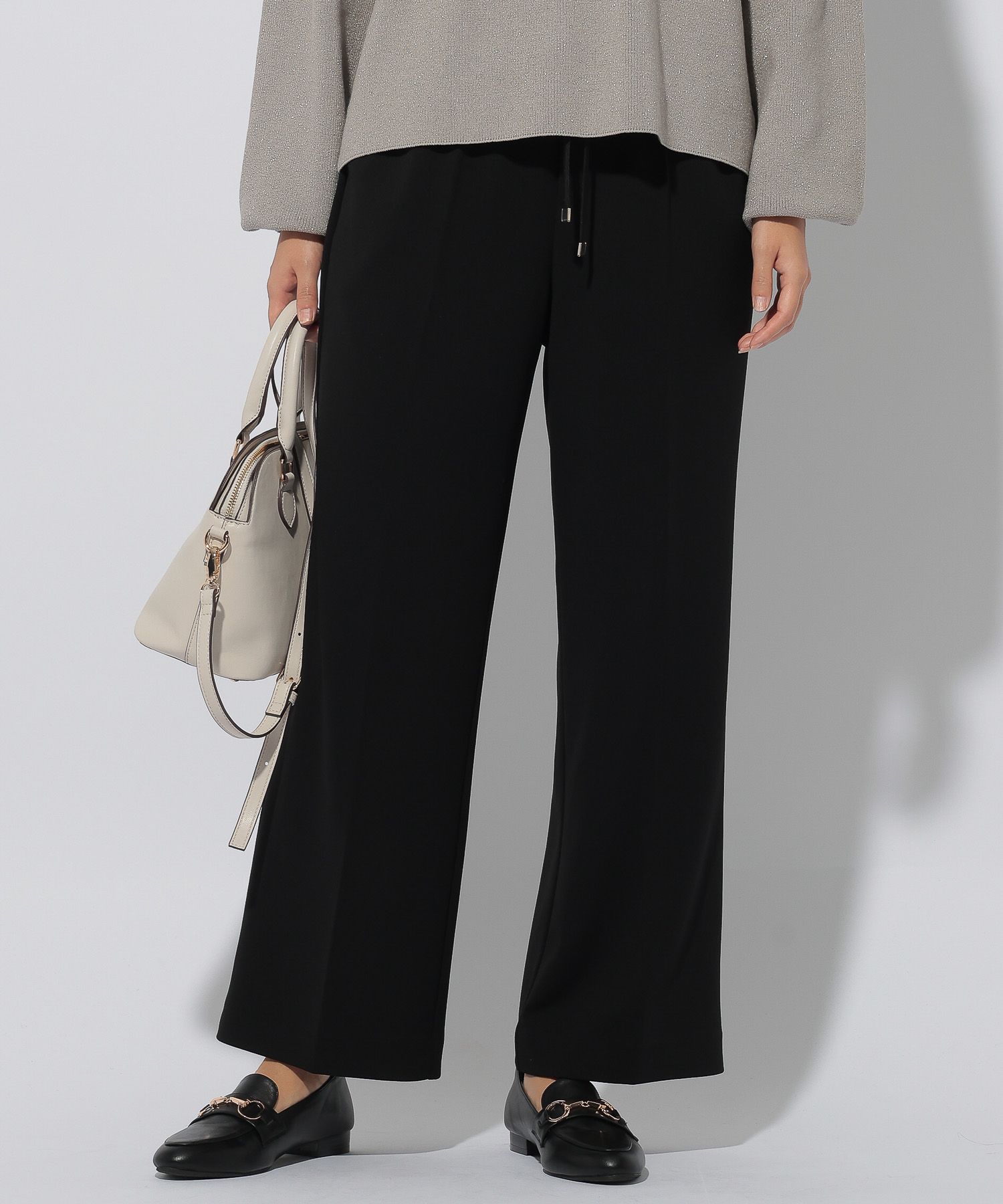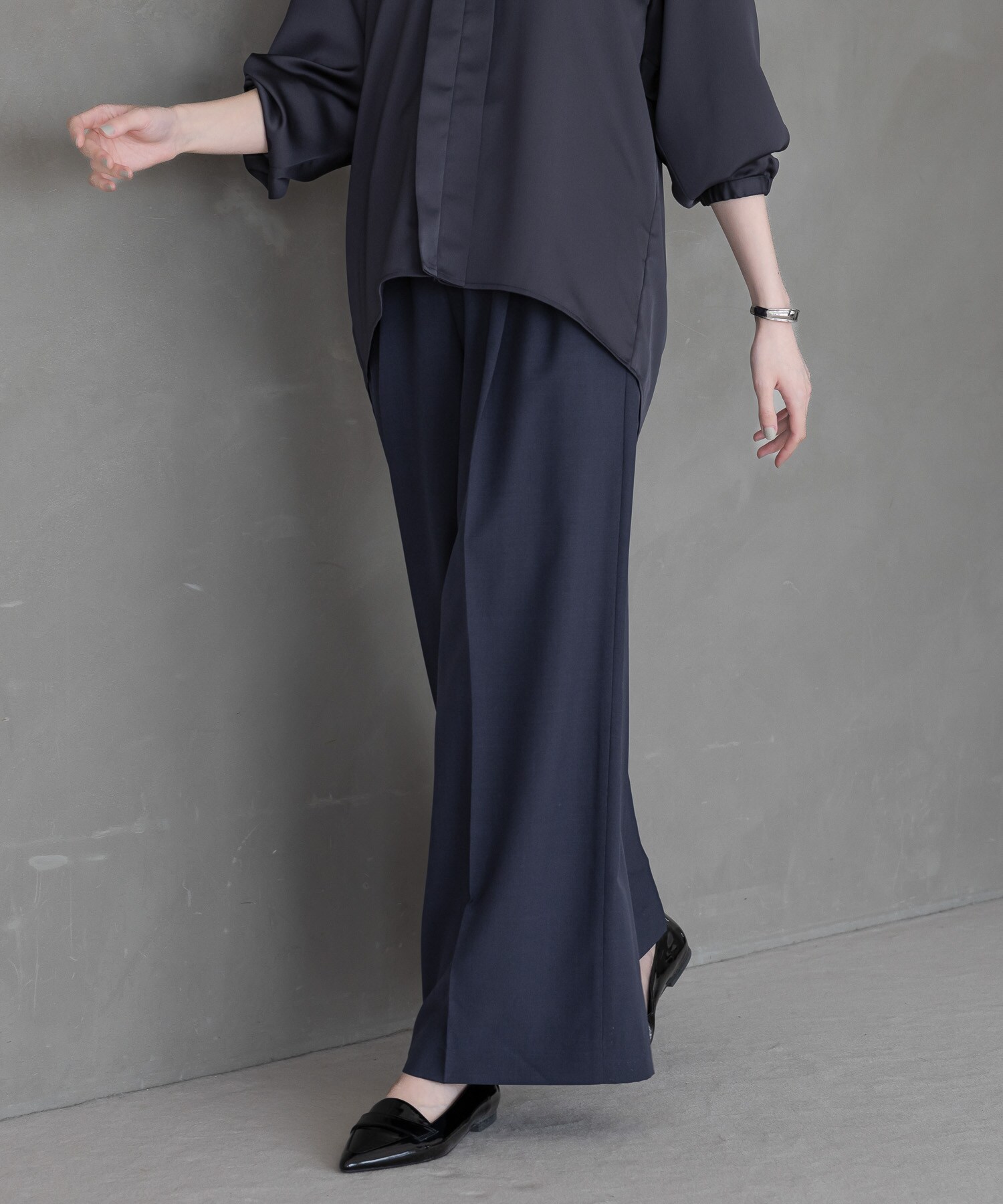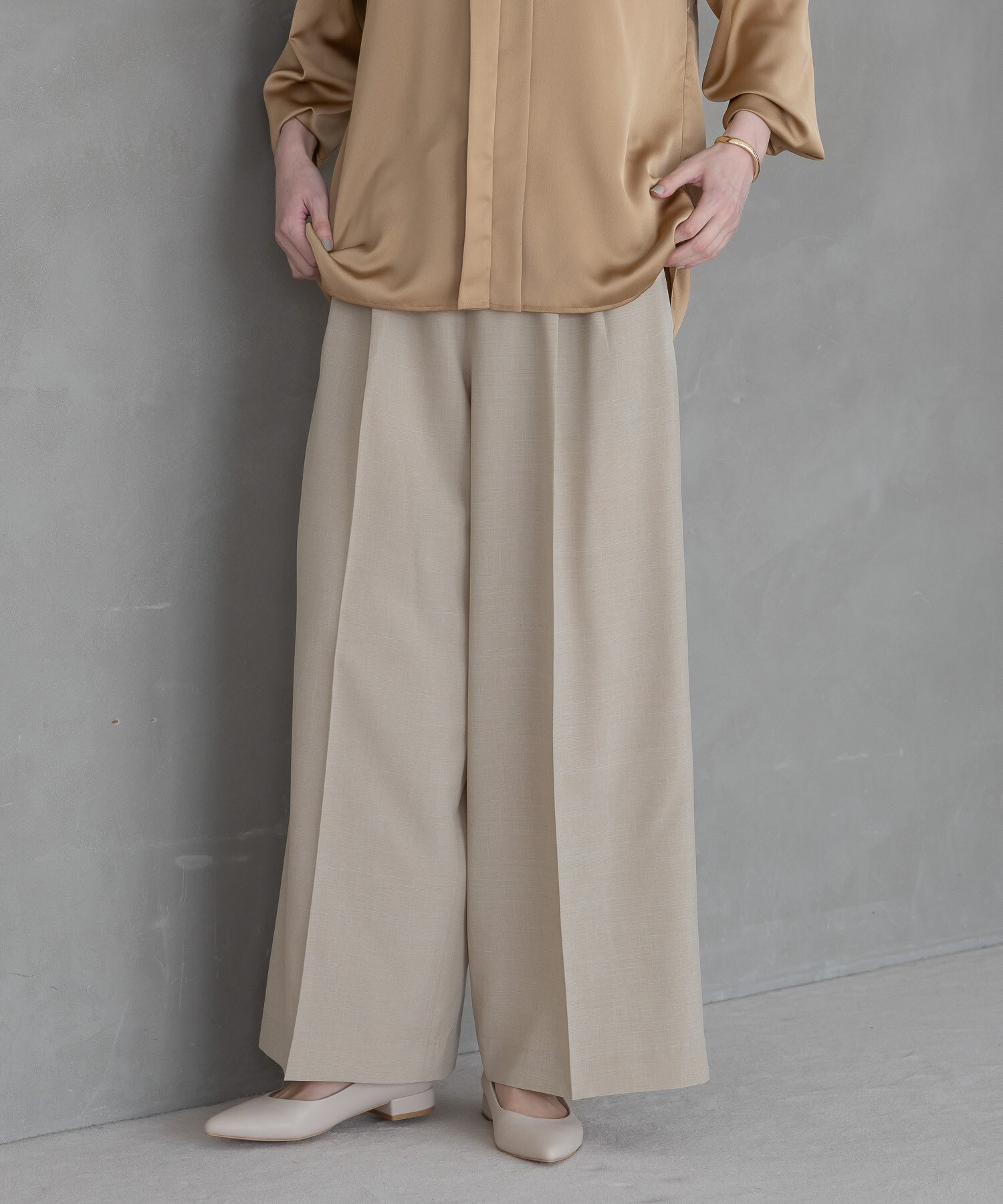きれい見えする素材で品よく見えるワイドパンツに仕上げました。