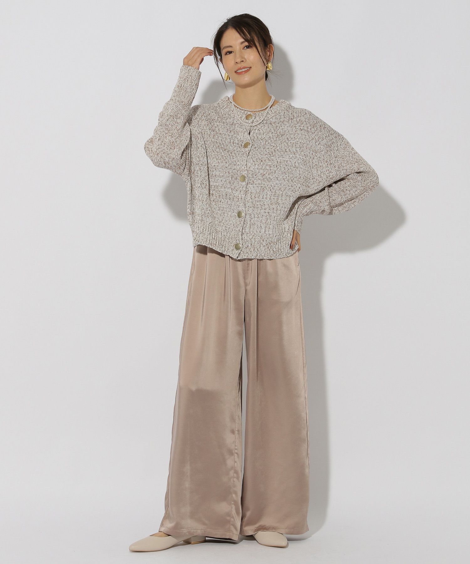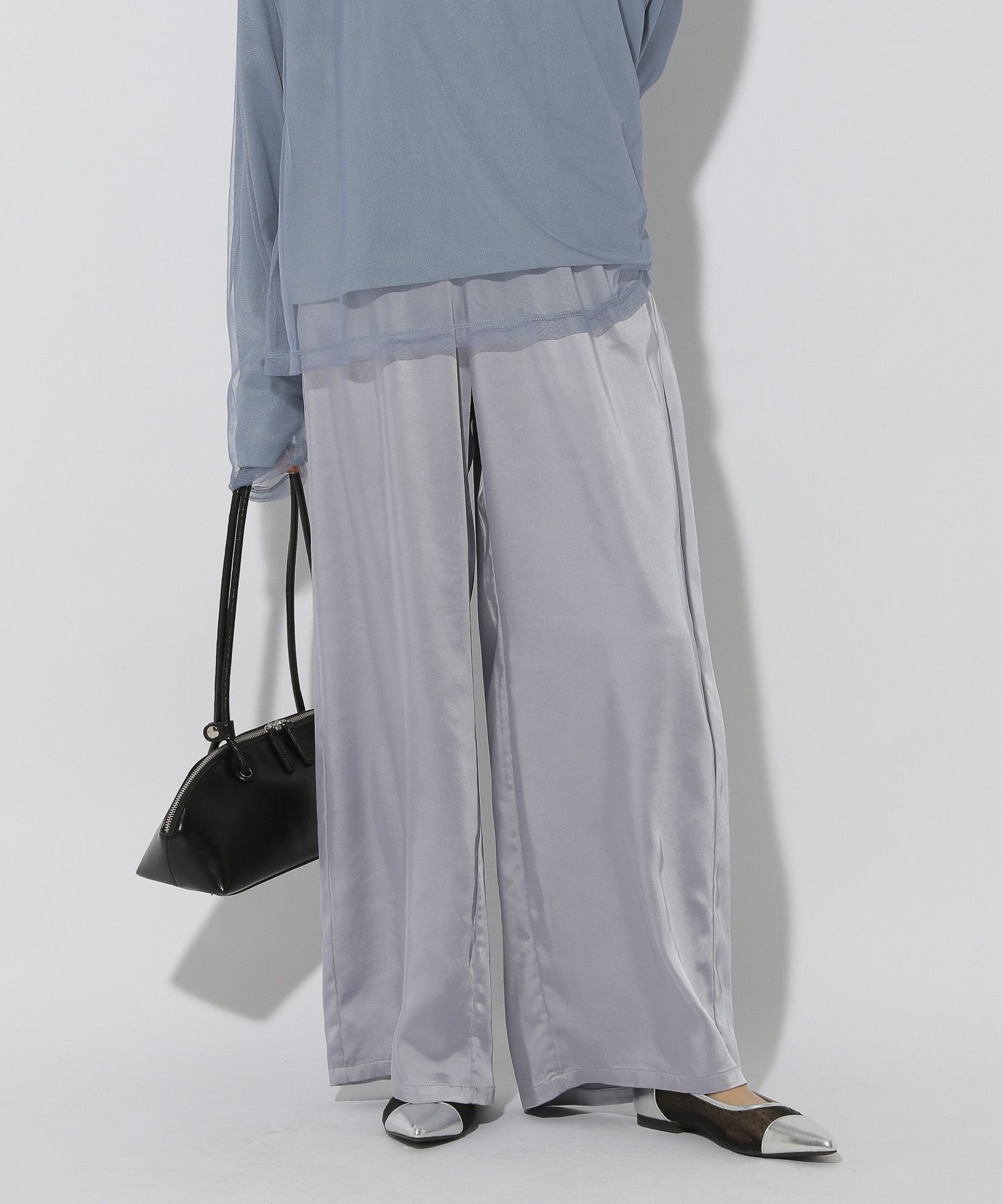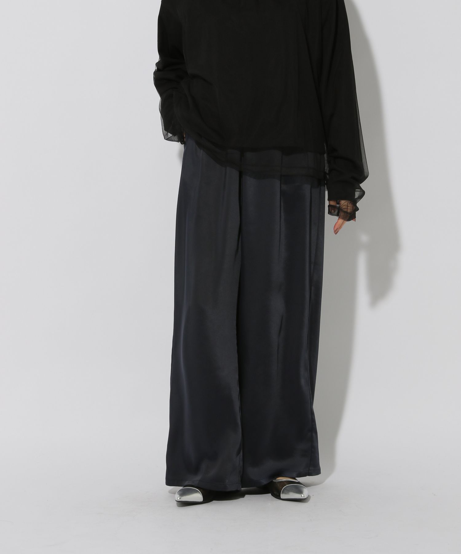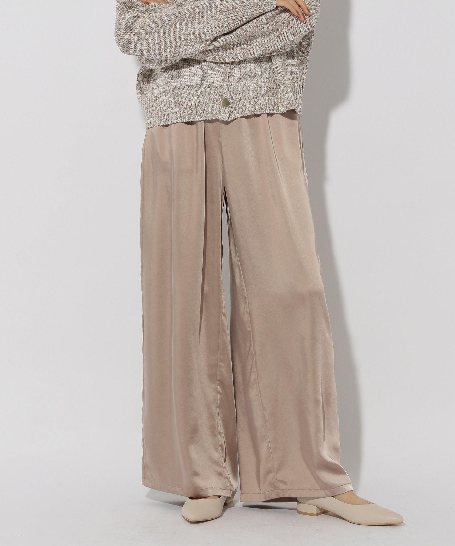 柔らかく落ち感のあるサテン素材でツヤ感が美しい大人女性にピッタリなワイドパンツです。