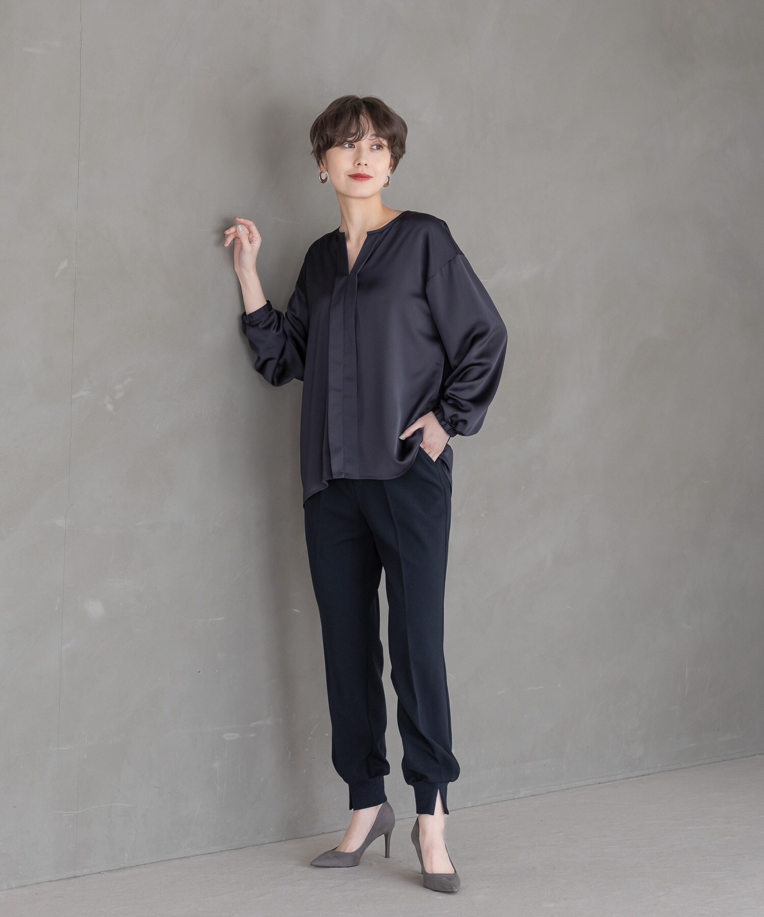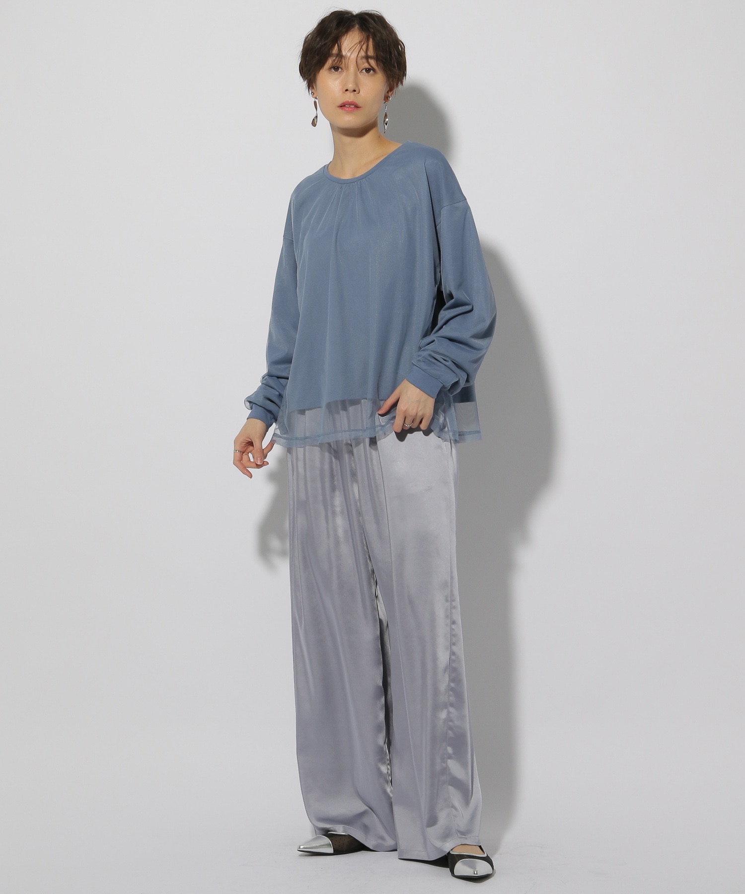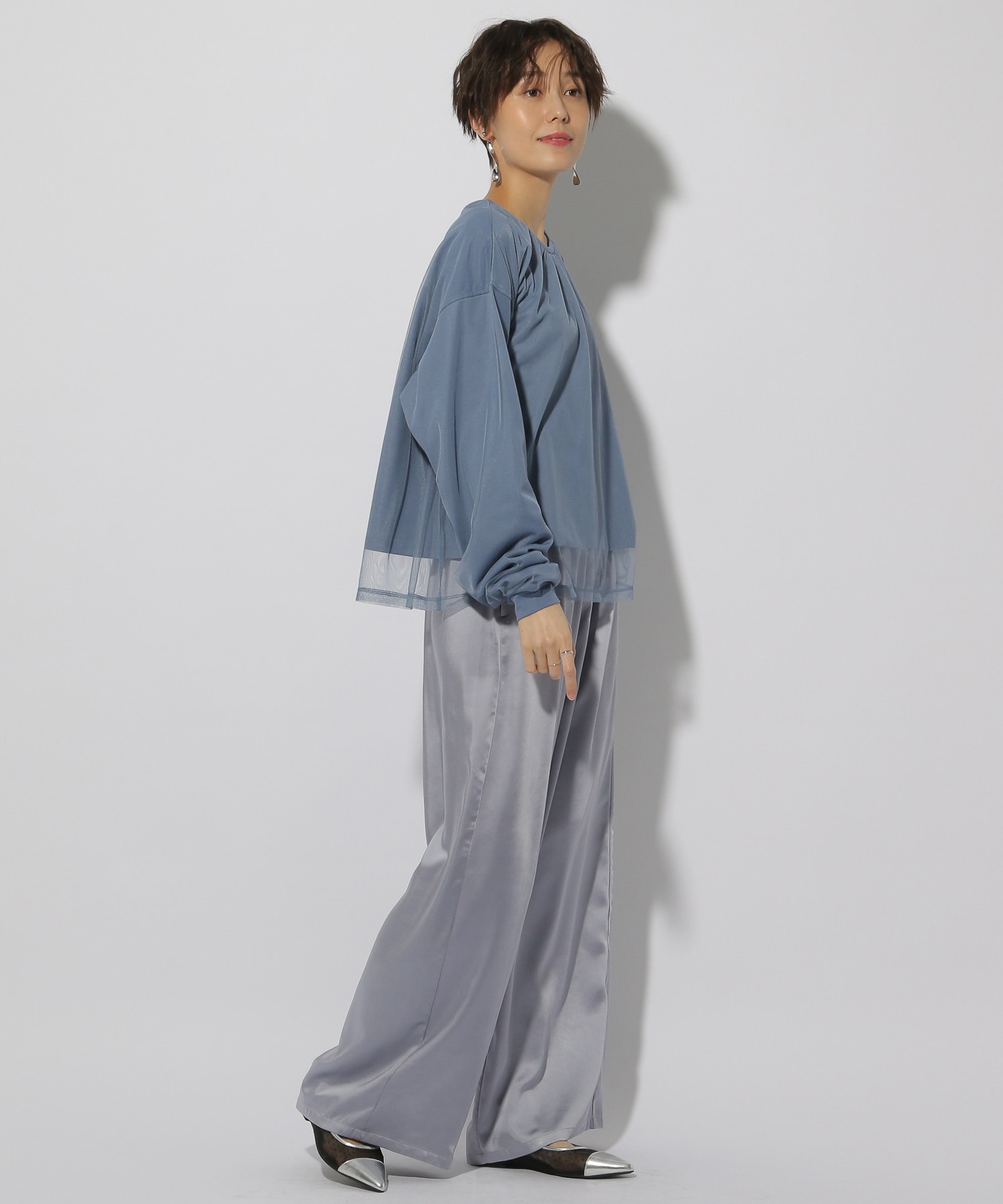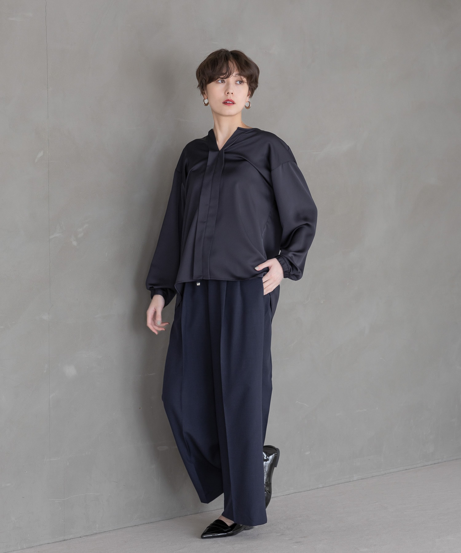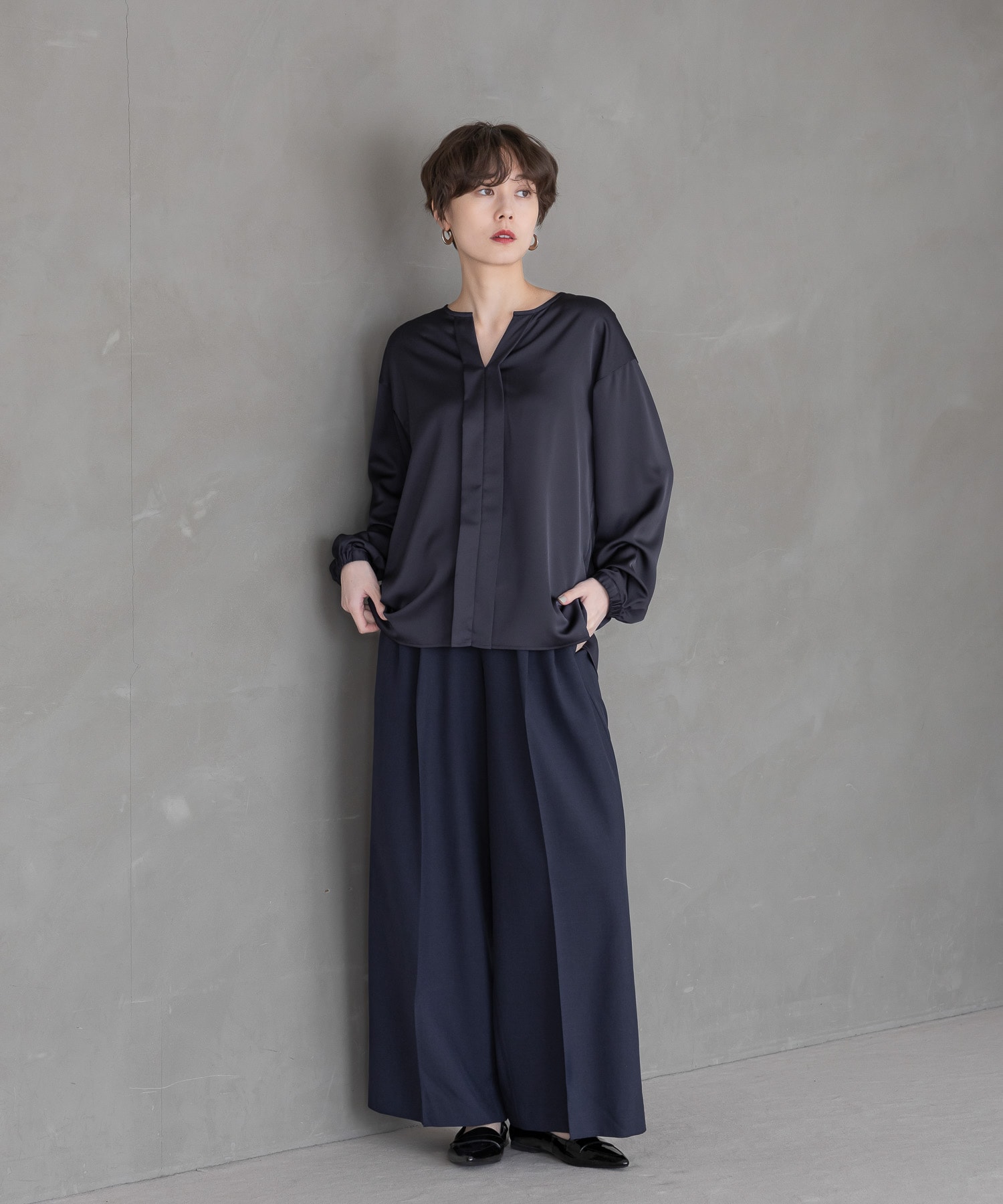 柔らかく落ち感のあるサテン素材でツヤ感が美しい大人女性にピッタリなワイドパンツです。
