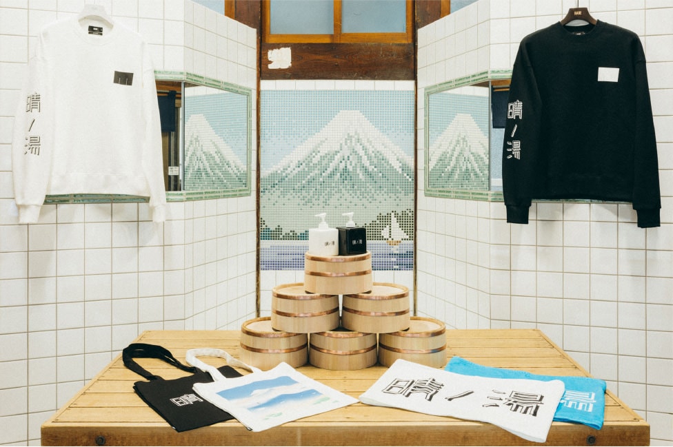 富士山の壁絵をモチーフにYAR氏が手がけたグラフィックと“晴ノ湯”ロゴを