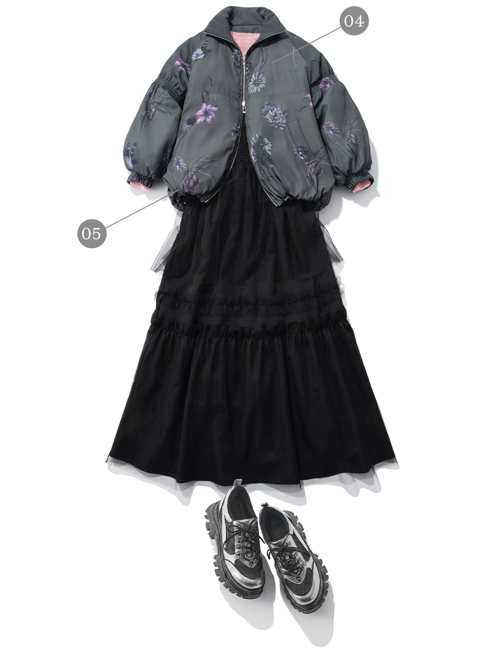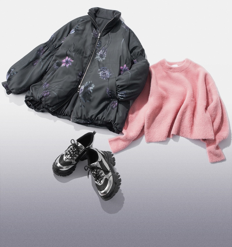 ハレらしいフラワー柄の中綿アウター。リバーシブル仕様で無地でも使えるので着回し力抜群です。シャギーやチュールなどの柔らかい素材を合わせると女性らしい印象になります。