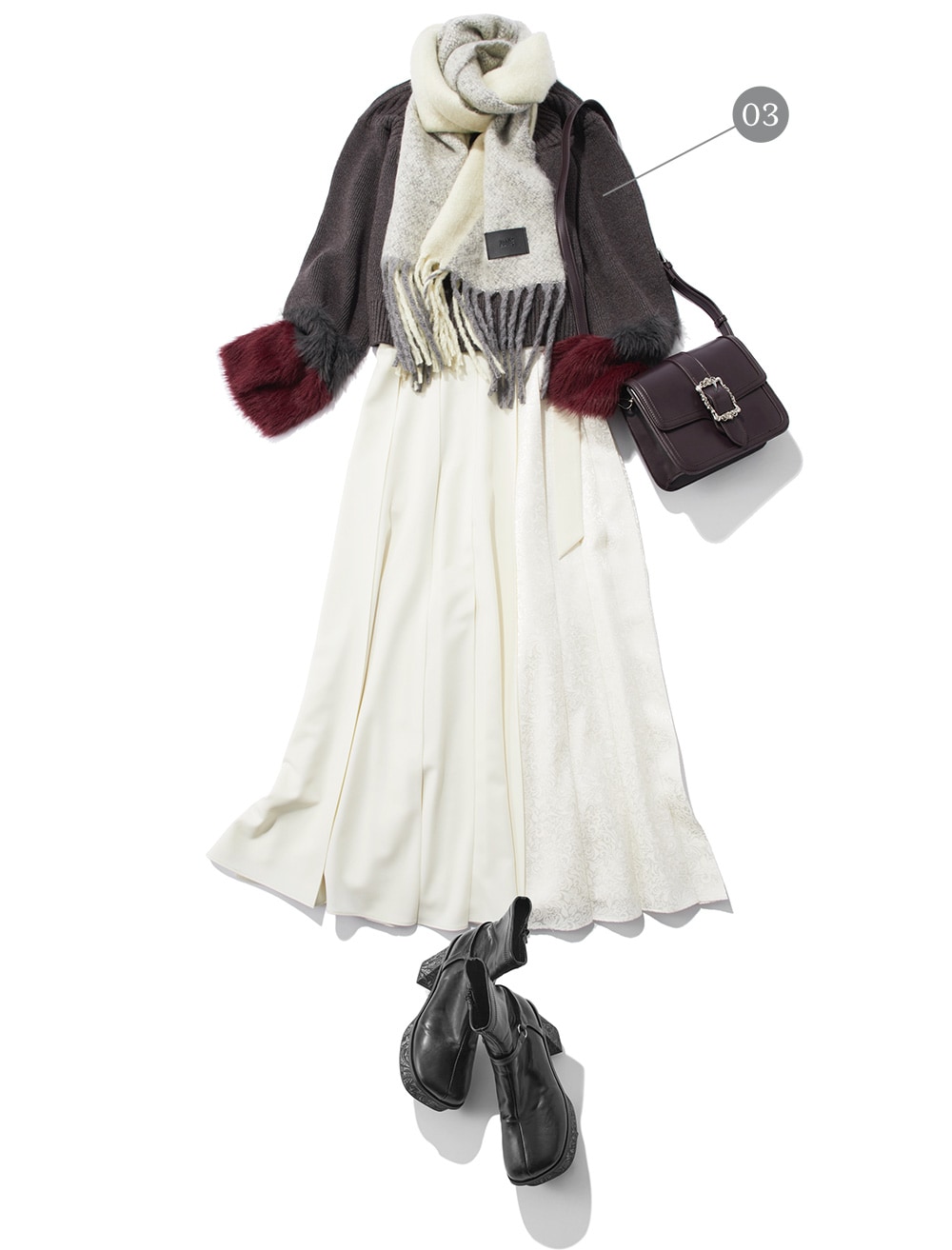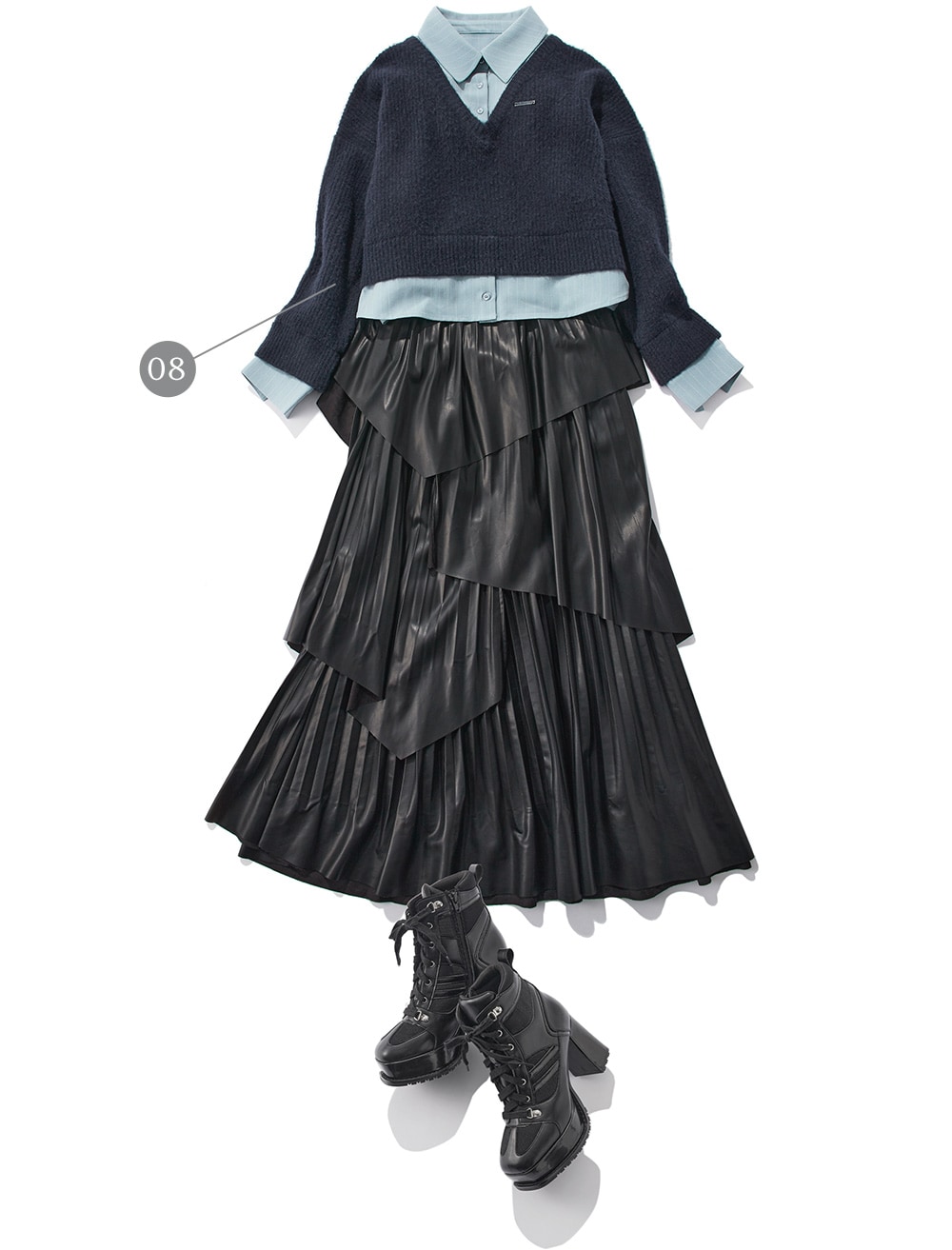 シャツがドッキングされたレイヤード風ニット。レザースカートでモードな印象にしつつ、スカートはティアードデザインなので上品さも忘れないコーデ。