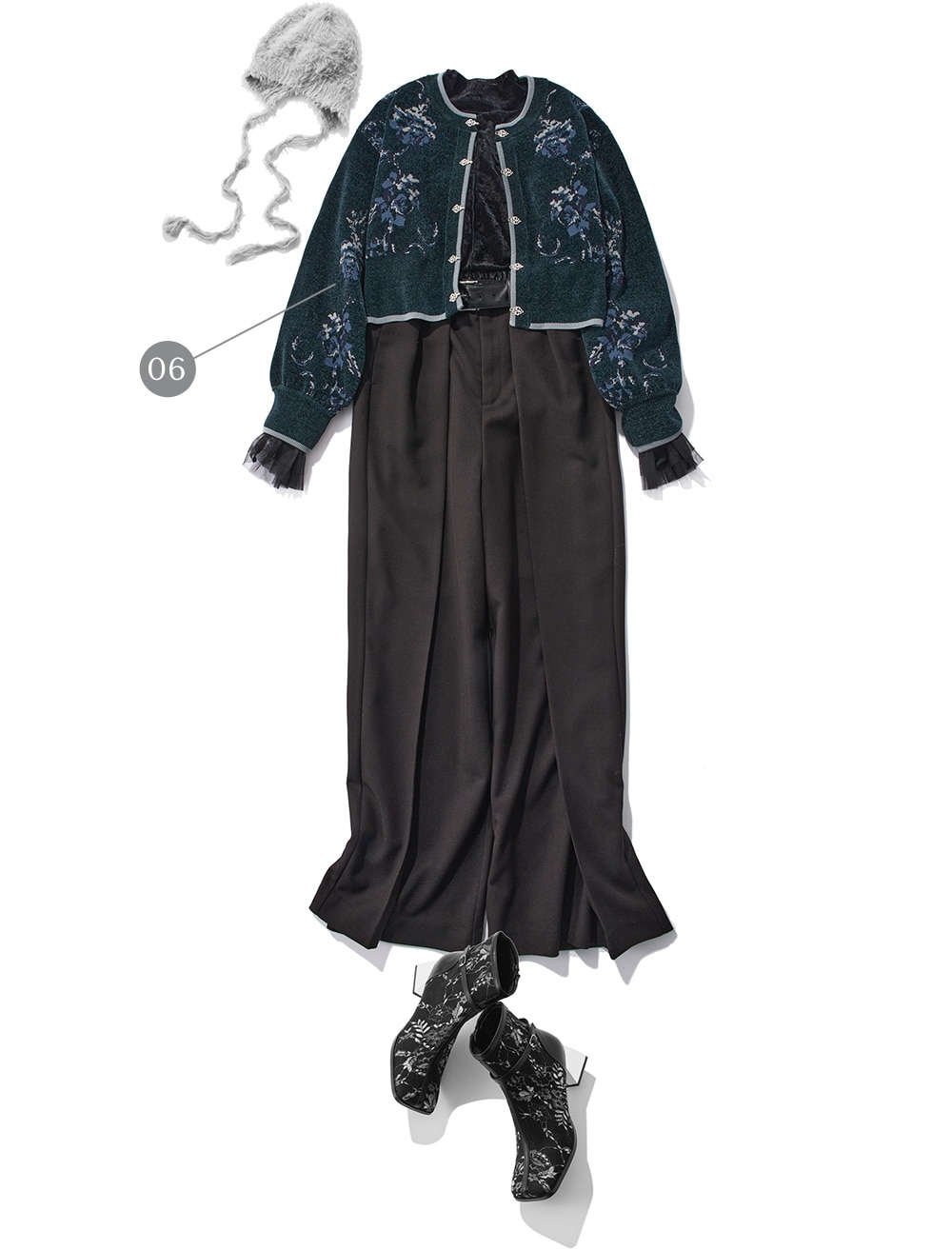 チクチクしないモールニットは着心地が良く、チャイナパーツをあしらっているので1枚でも主役級のニットカーディガン。ワイドパンツでシンプルなオトナモードスタイルの完成。