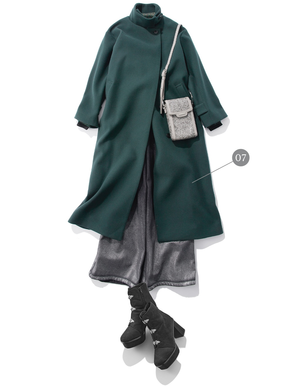 大きい襟が華やかな印象にしてくれるアウター。子供っぽくならないようにタイトシルエットのニットやベロアなどの上品さのある小物を合わせるのがオススメ。