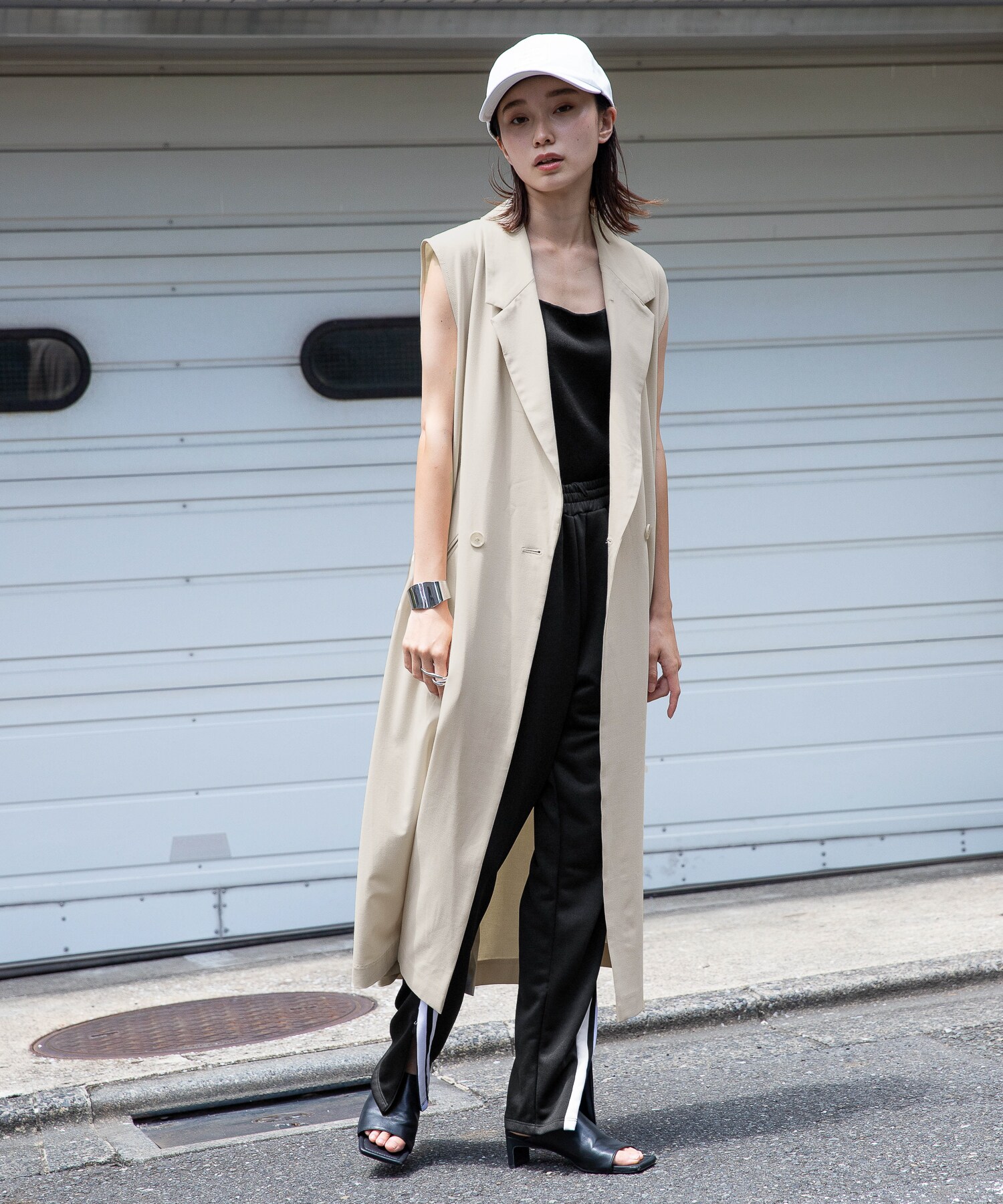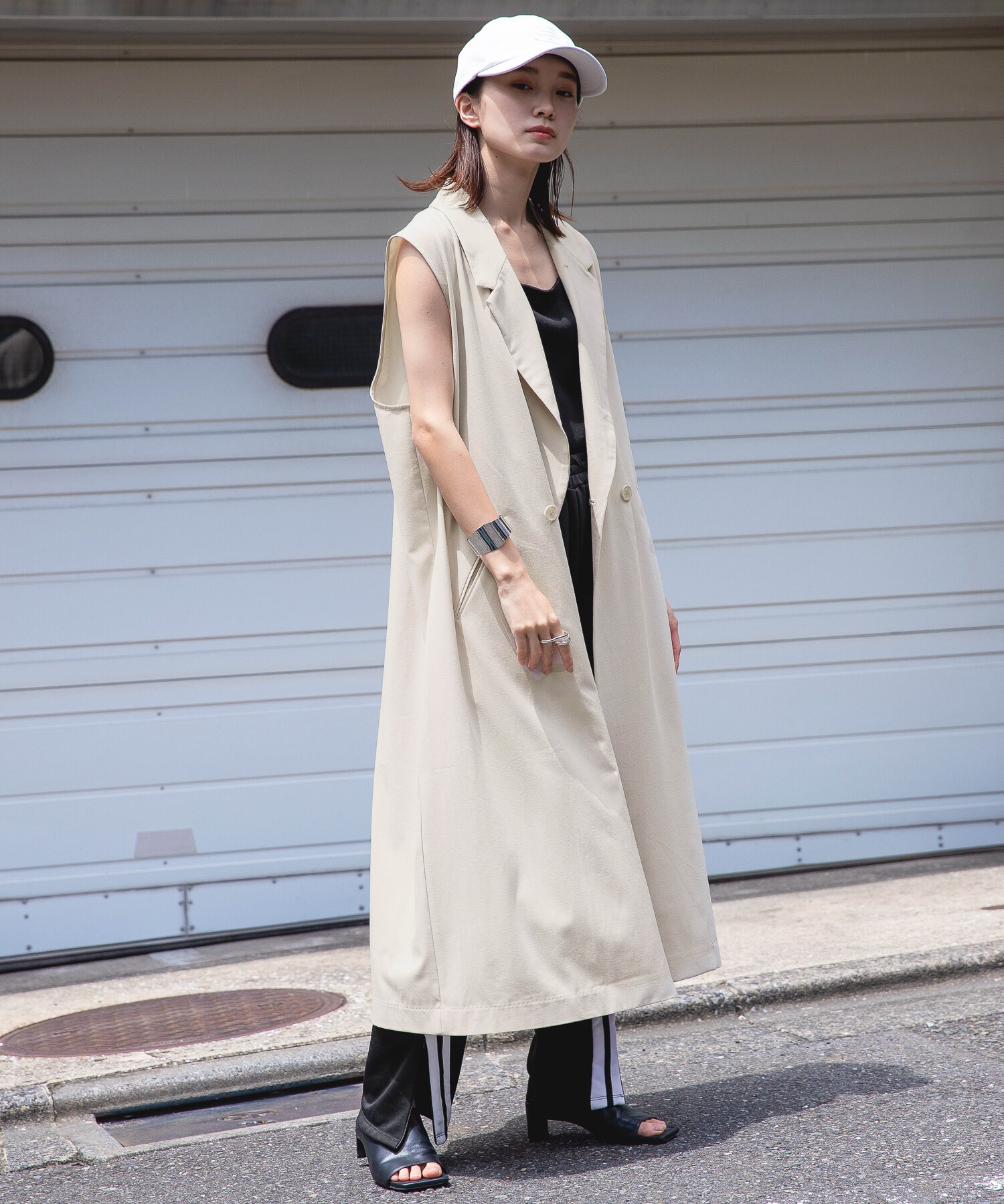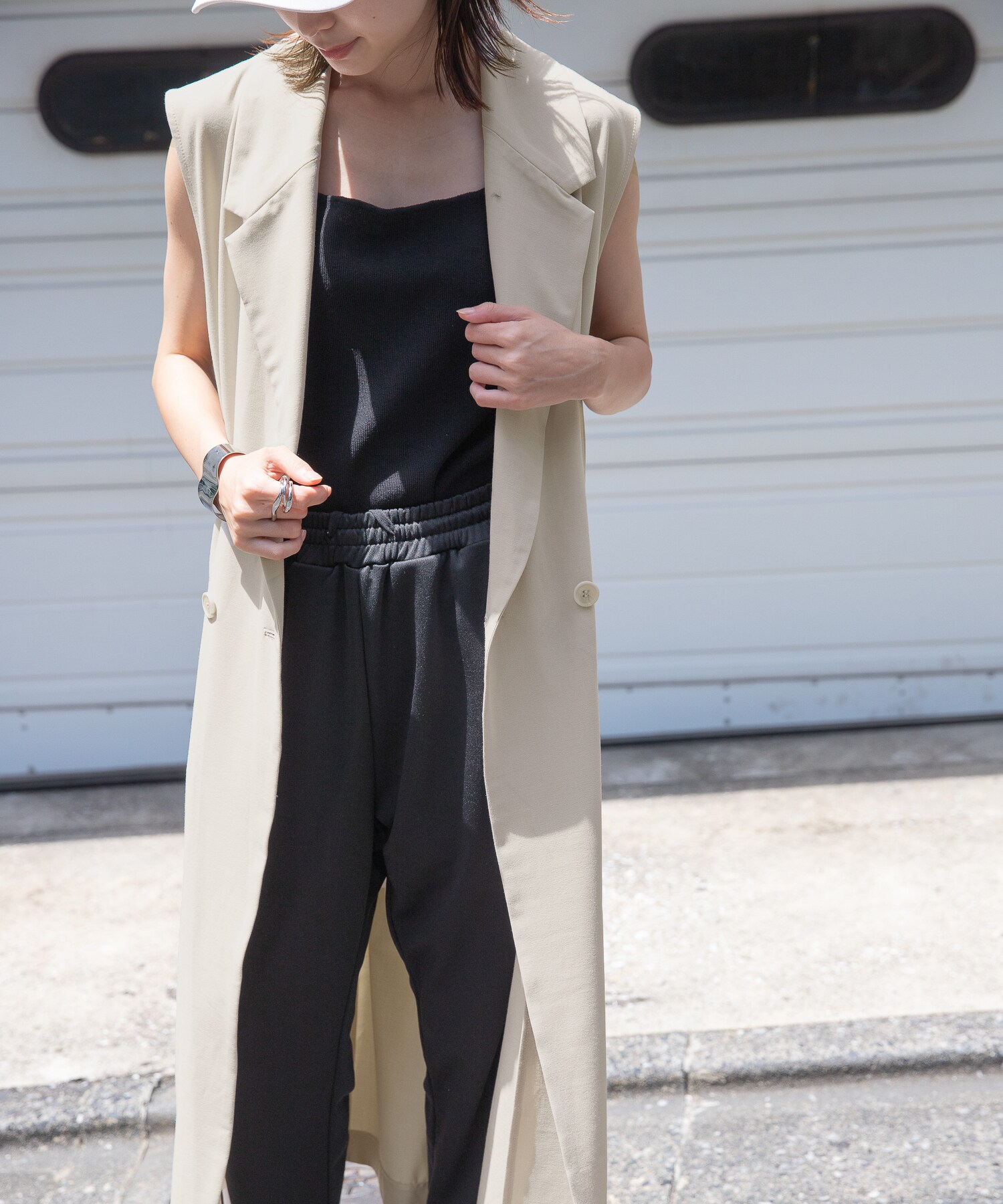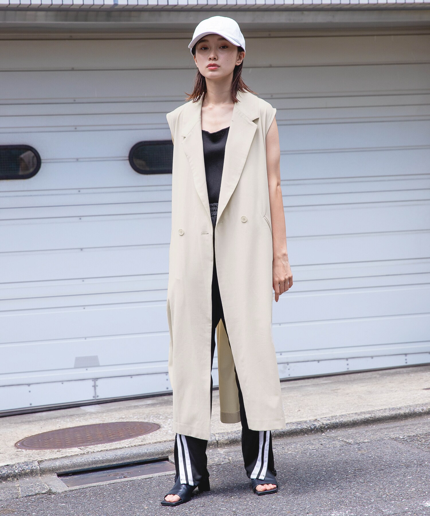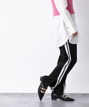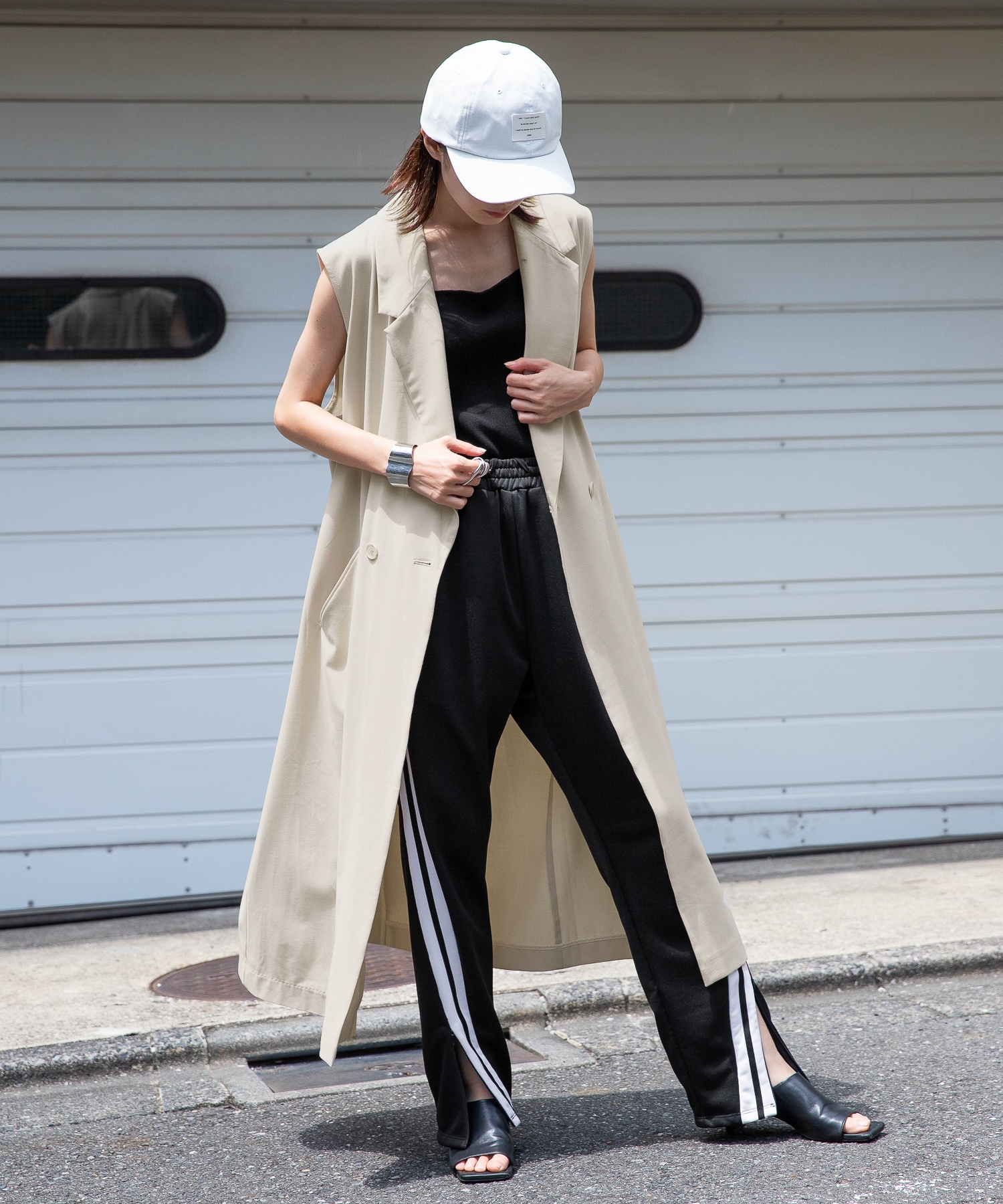 人気のラインパンツにトップスはタンク合わせでシンプルに着こなすのが◎