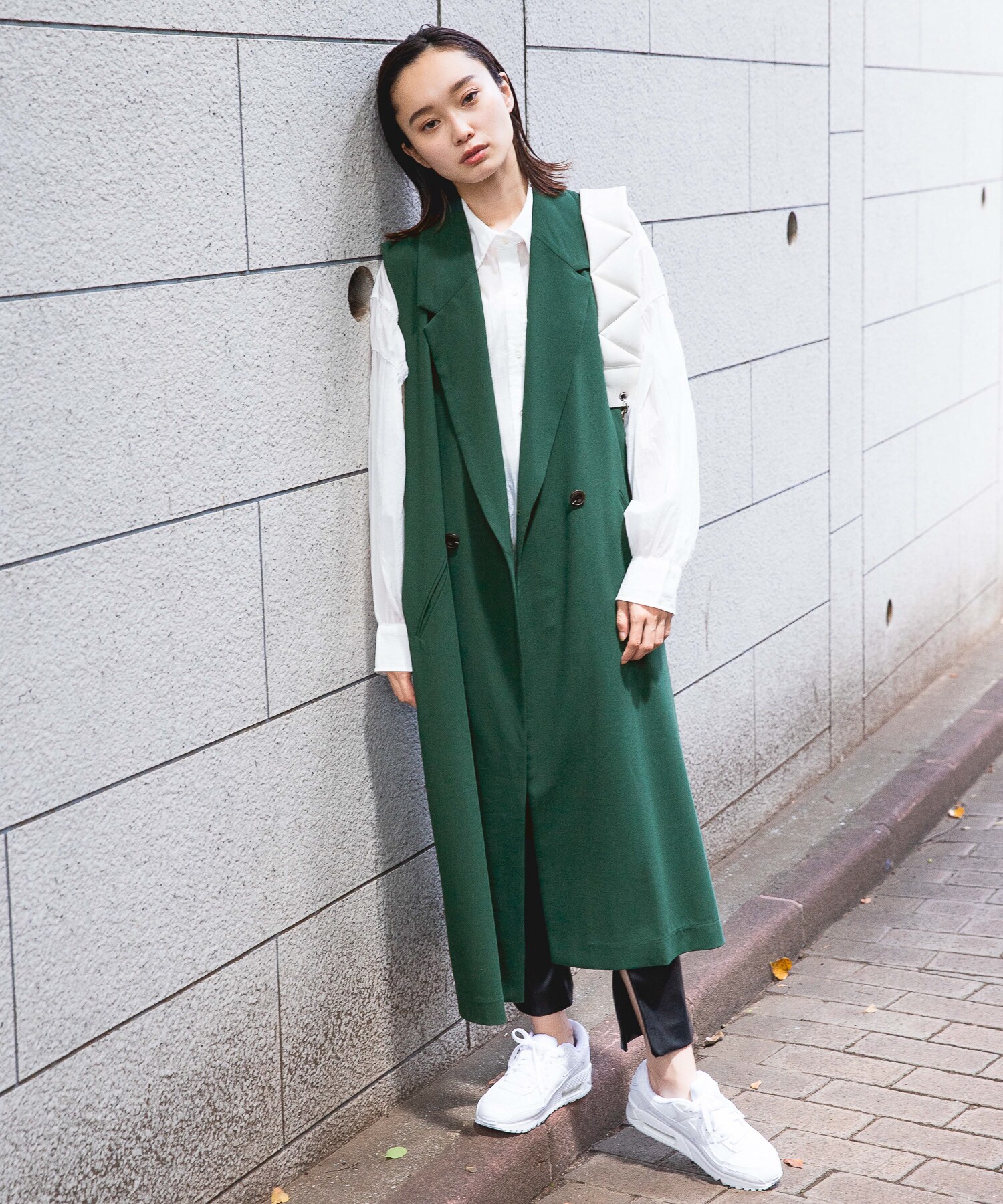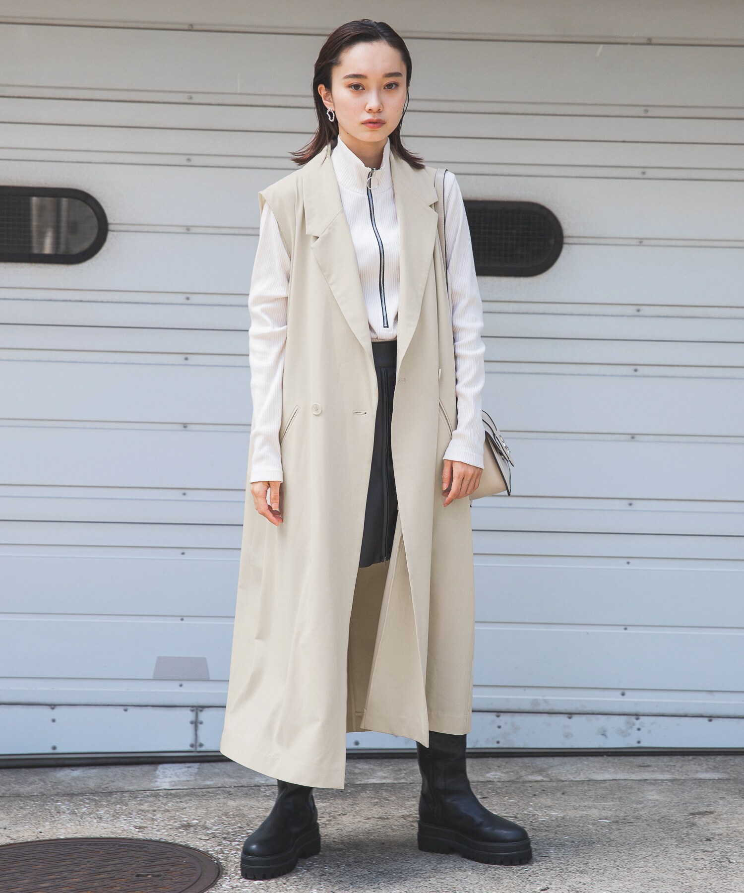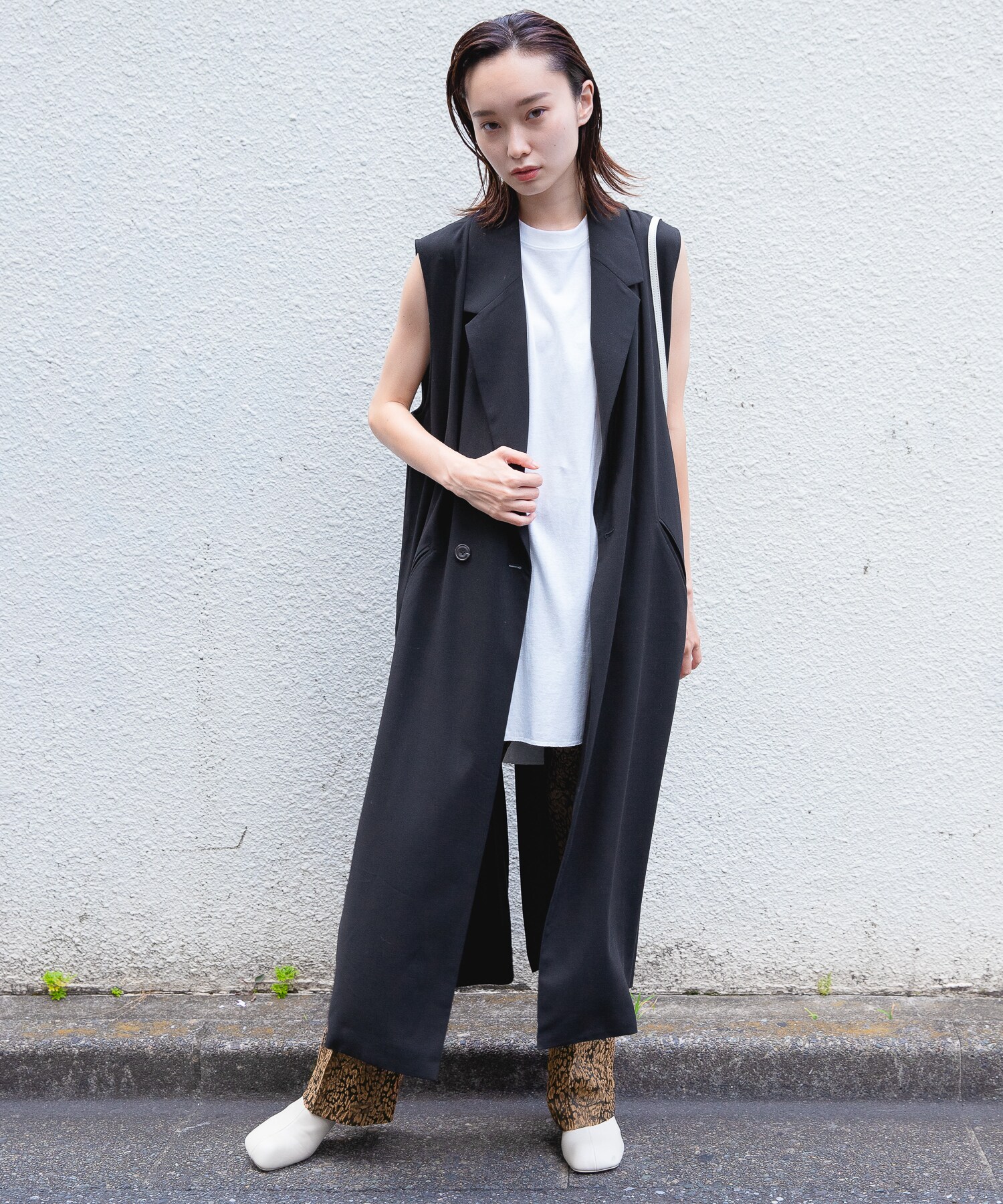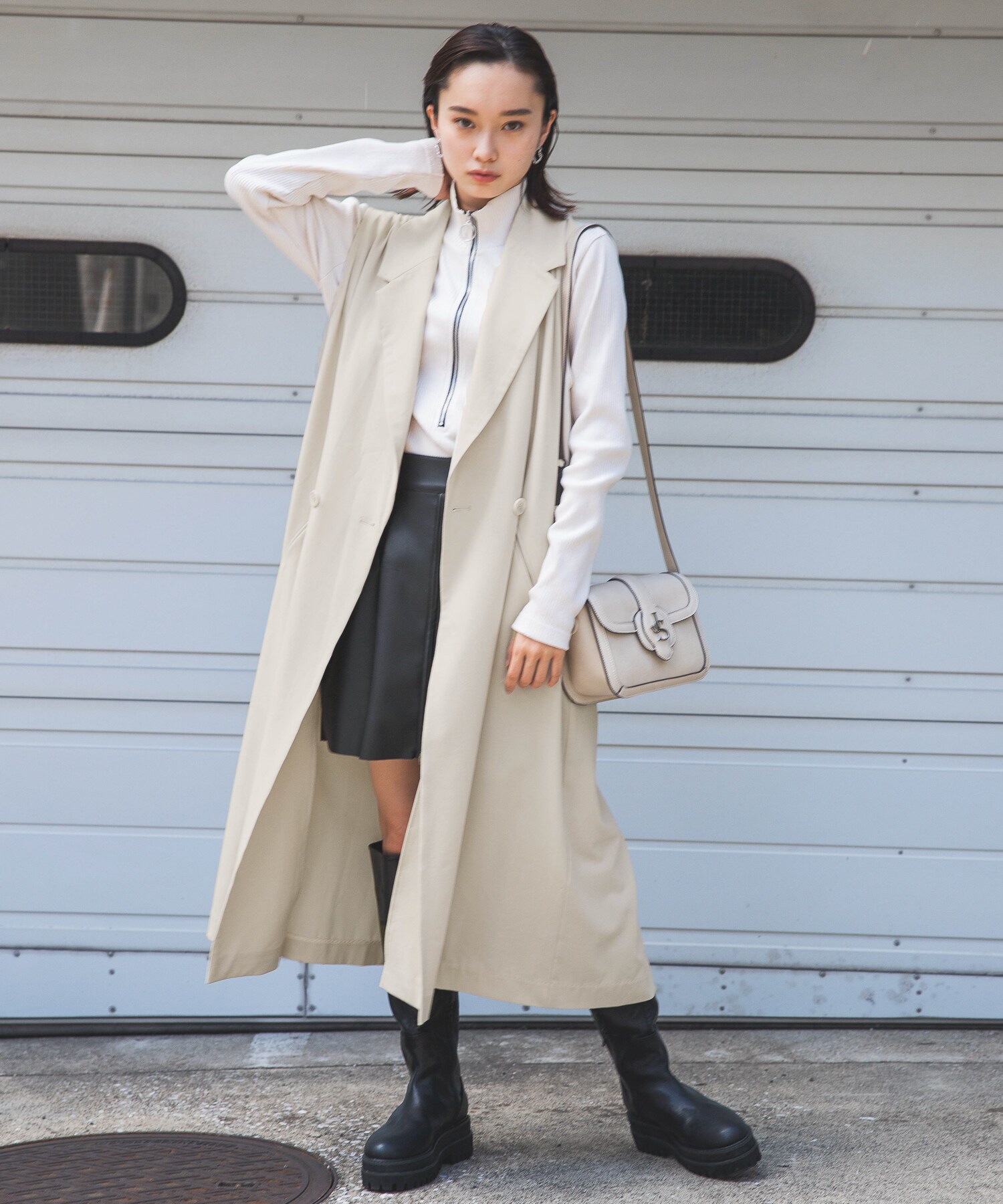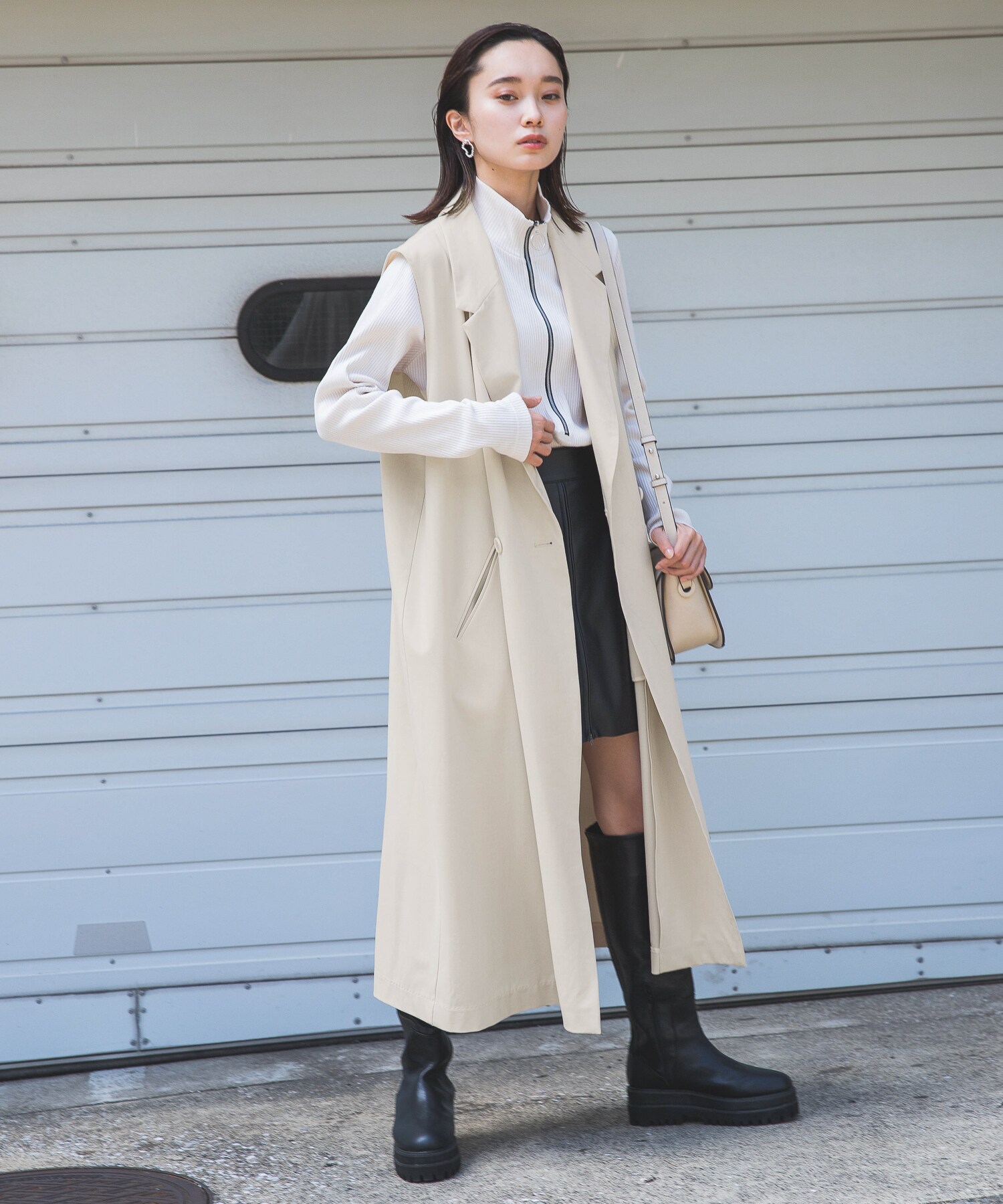 ロングベストにビーガンレザーのスリムパンツを合わせ、縦長のすっきりシルエットでスタイルアップ。