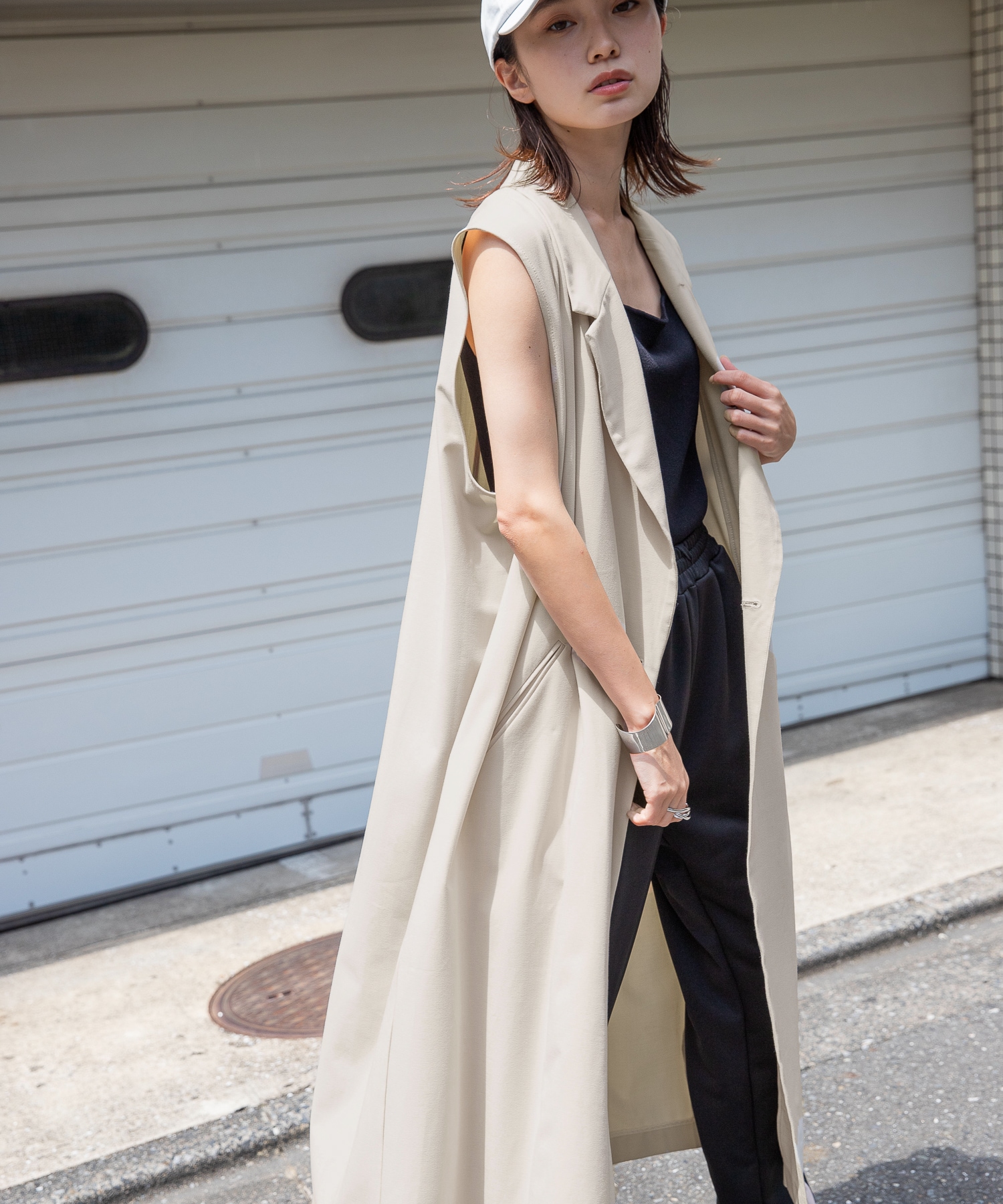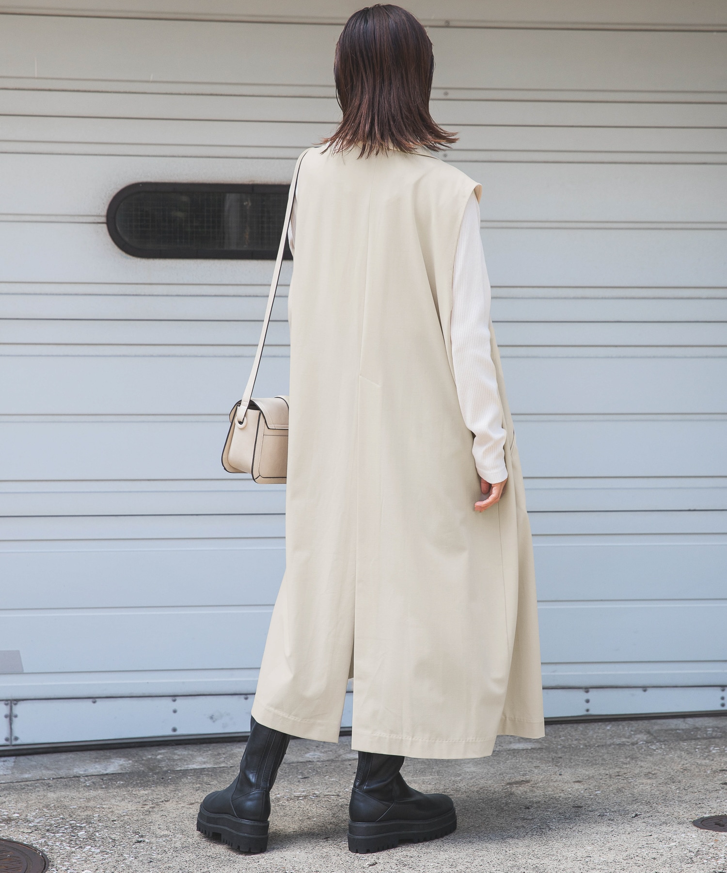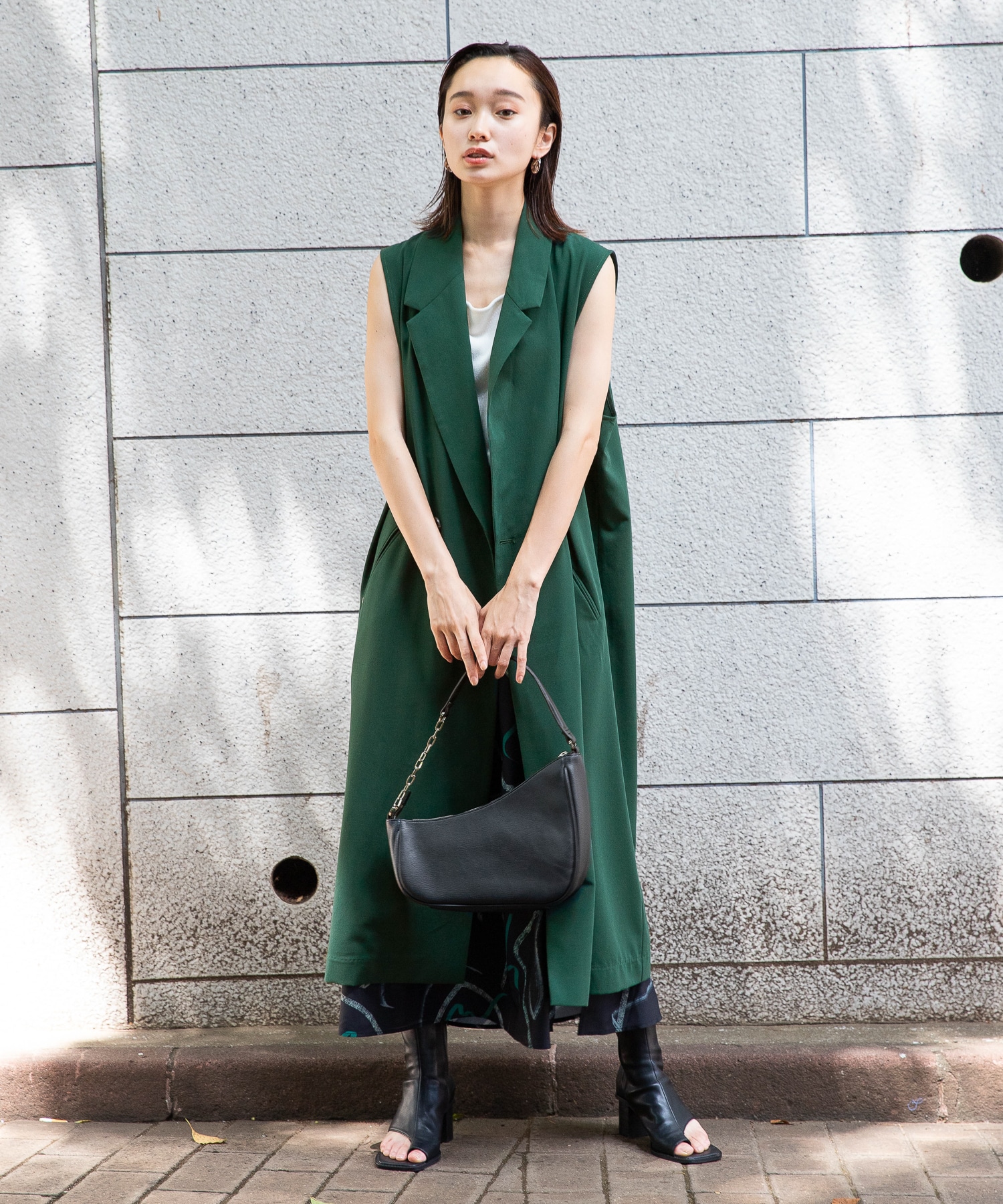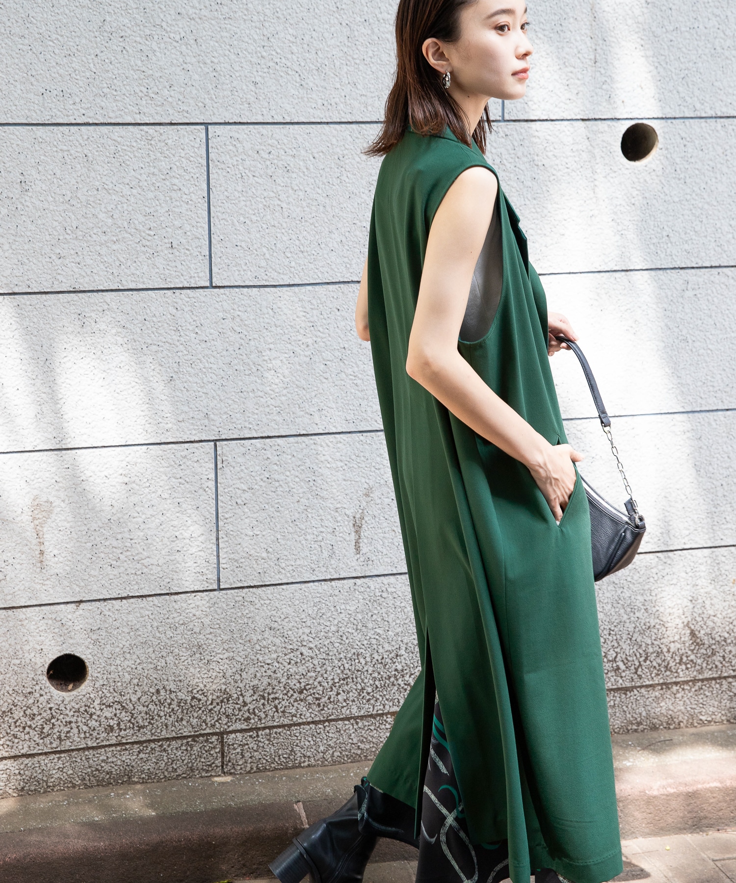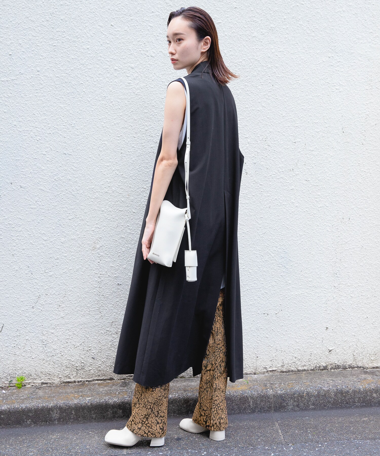 ロングベストにビーガンレザーのスリムパンツを合わせ、縦長のすっきりシルエットでスタイルアップ。
