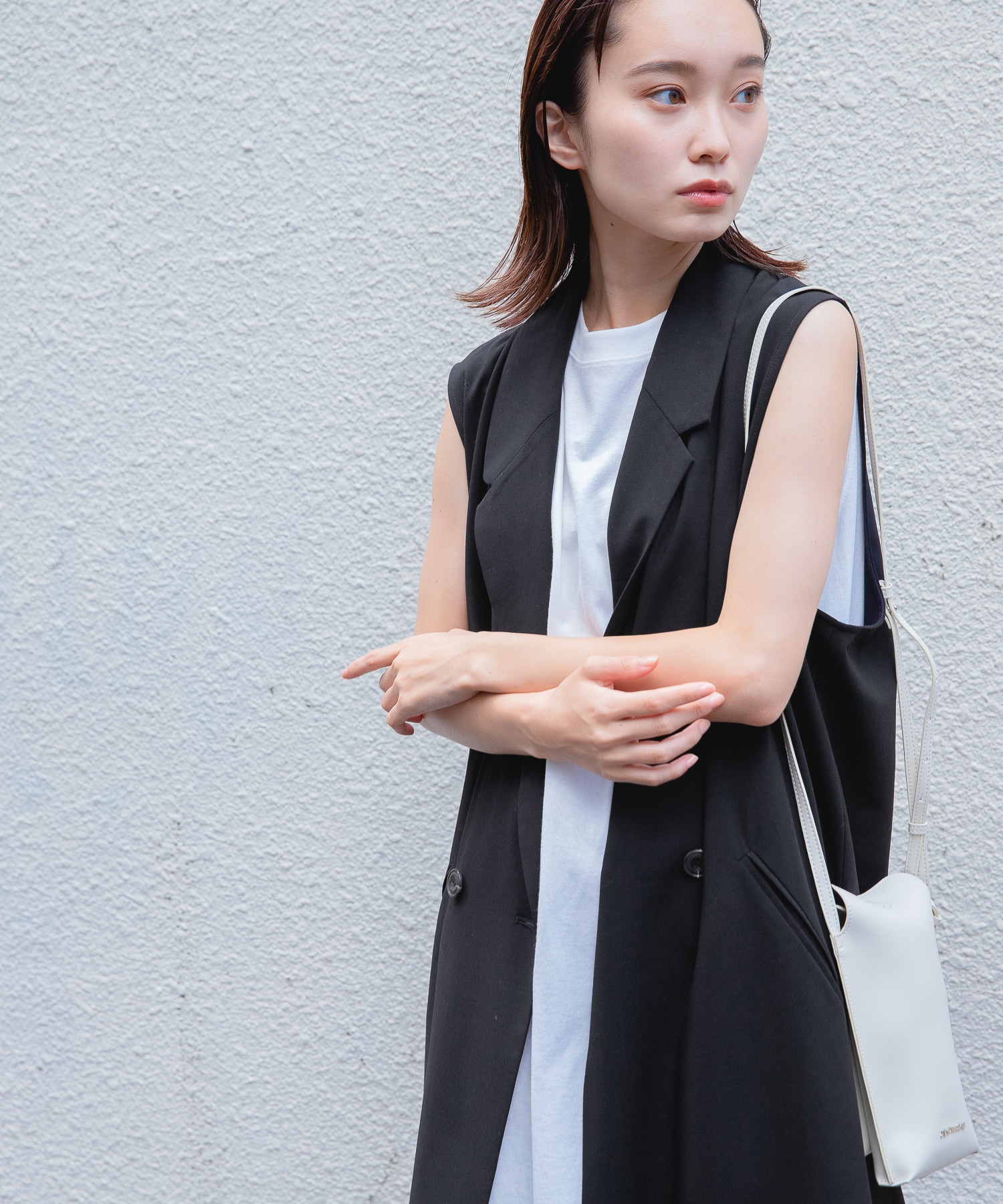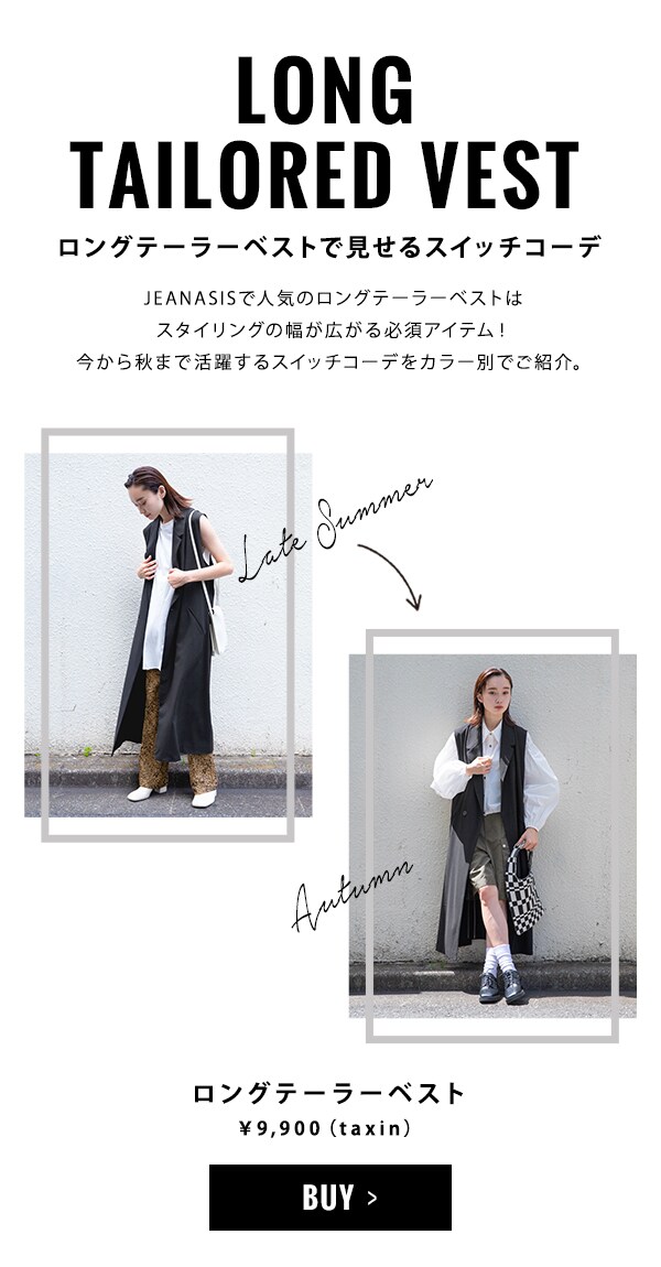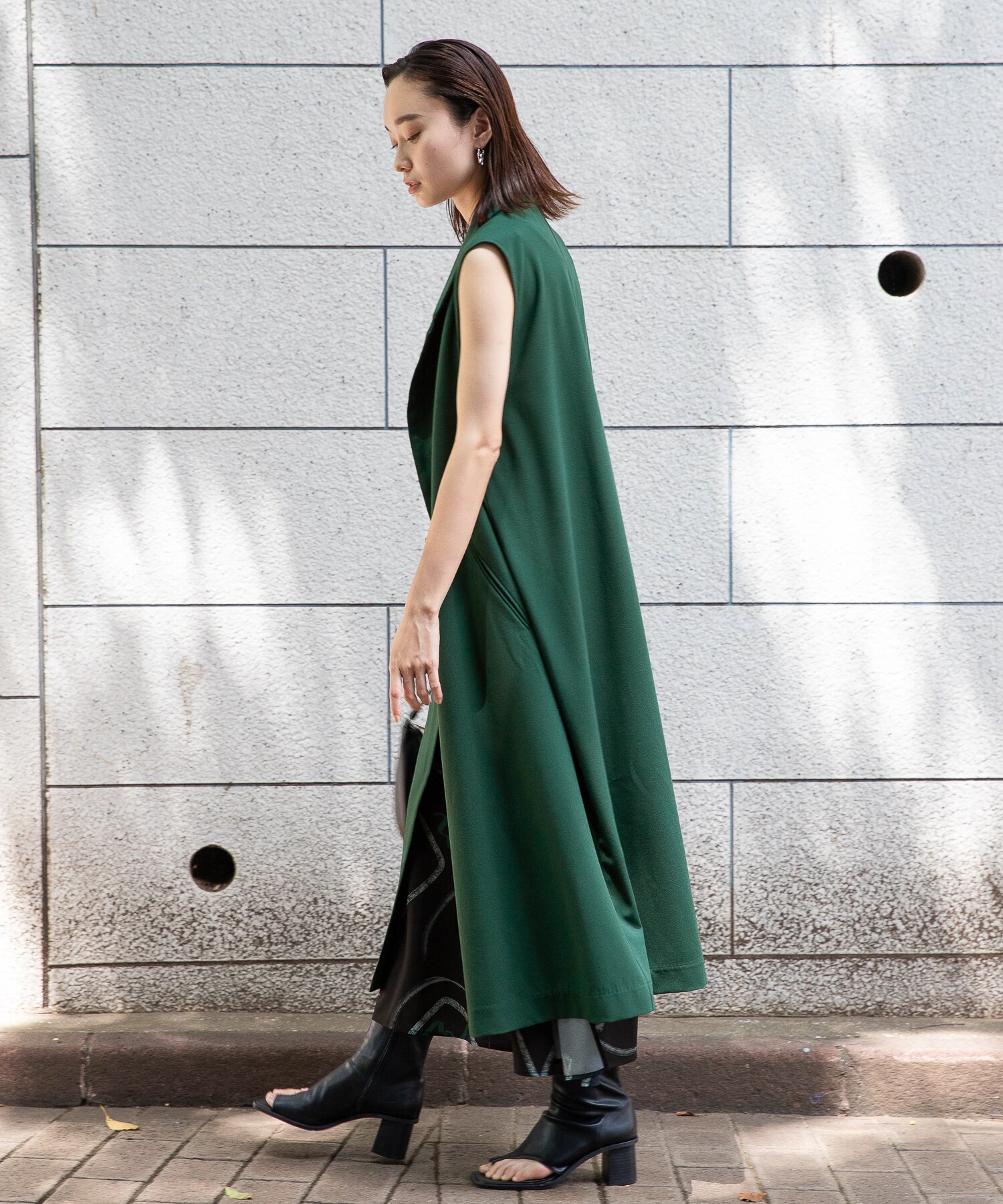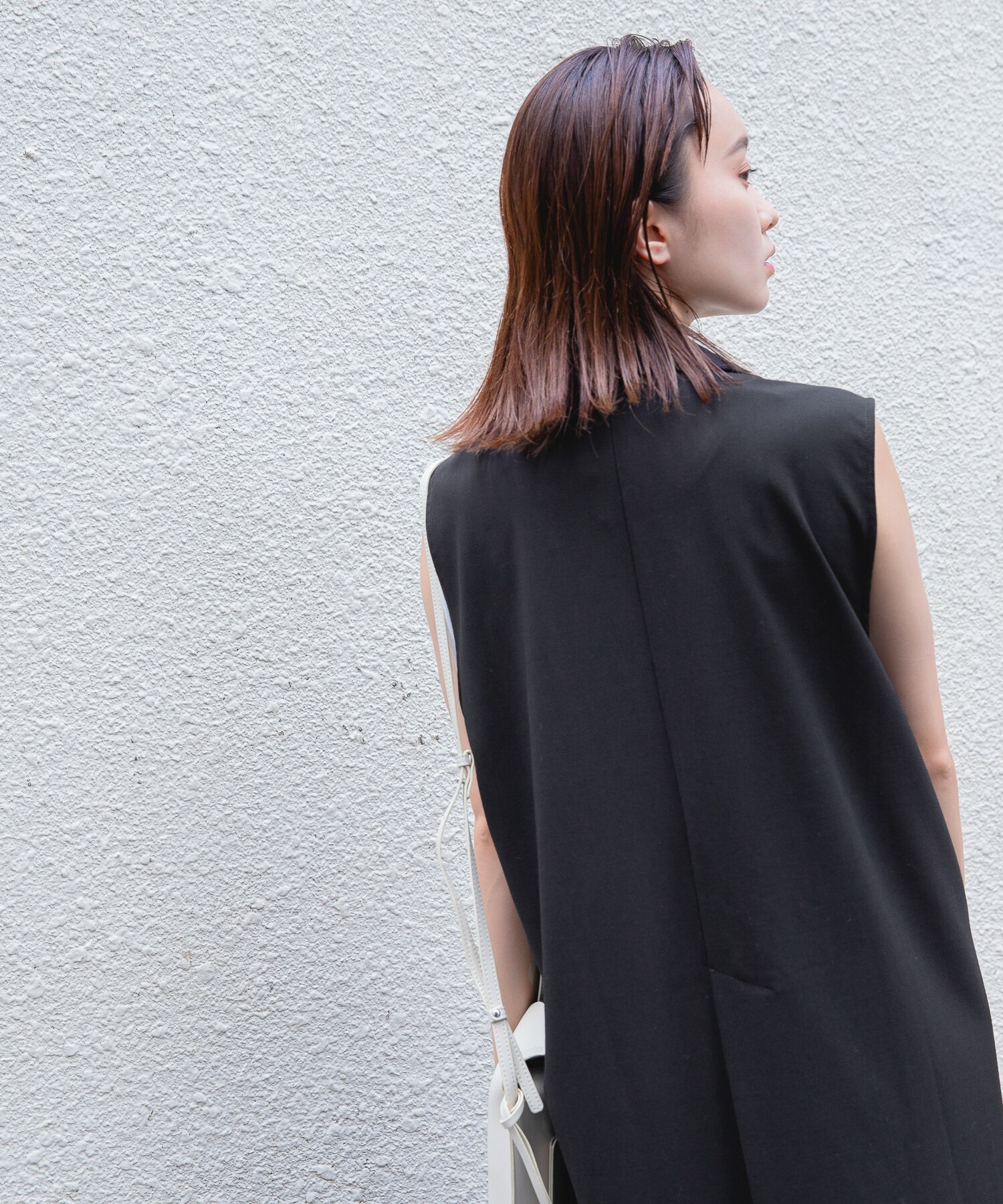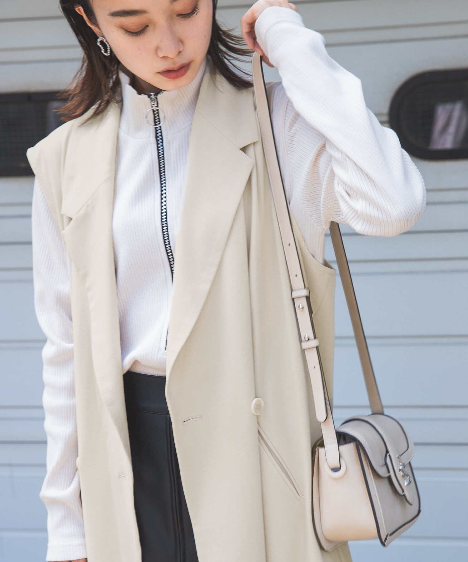 ロングベストにビーガンレザーのスリムパンツを合わせ、縦長のすっきりシルエットでスタイルアップ。