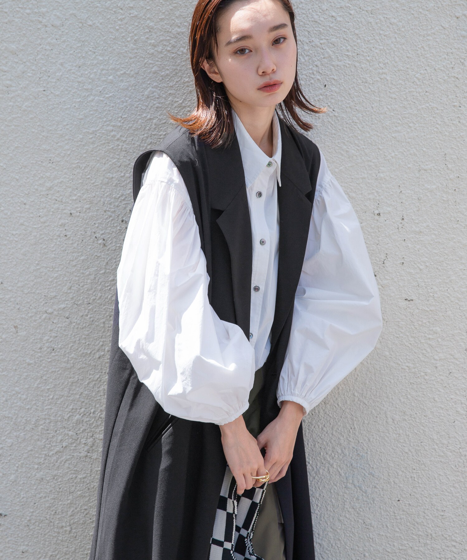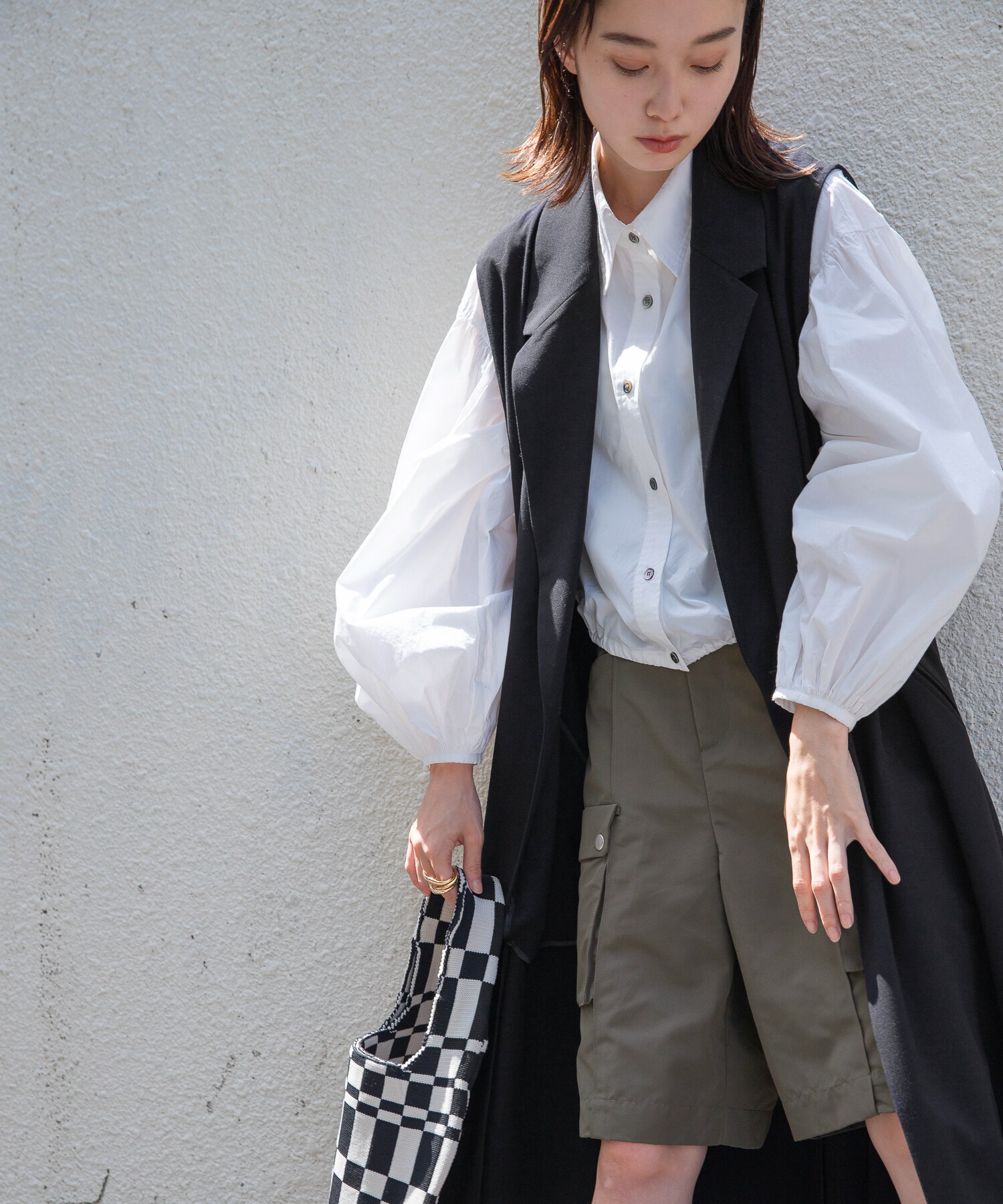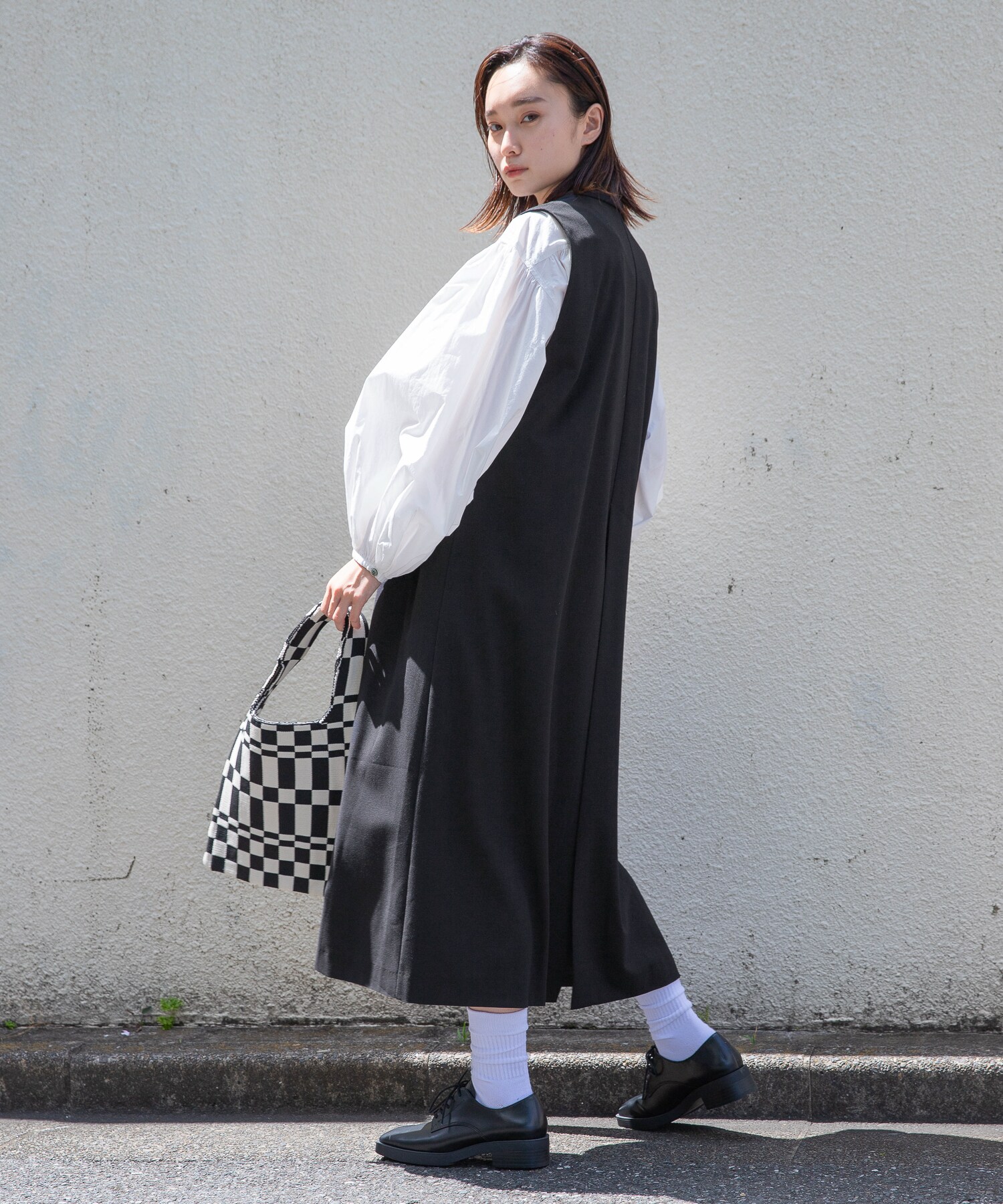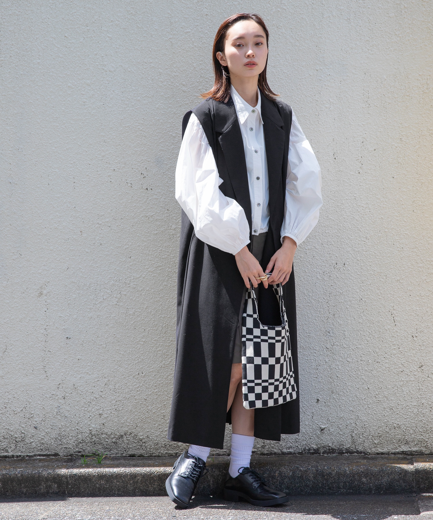 BAGのチェッカー柄をポイントに着こなしました。