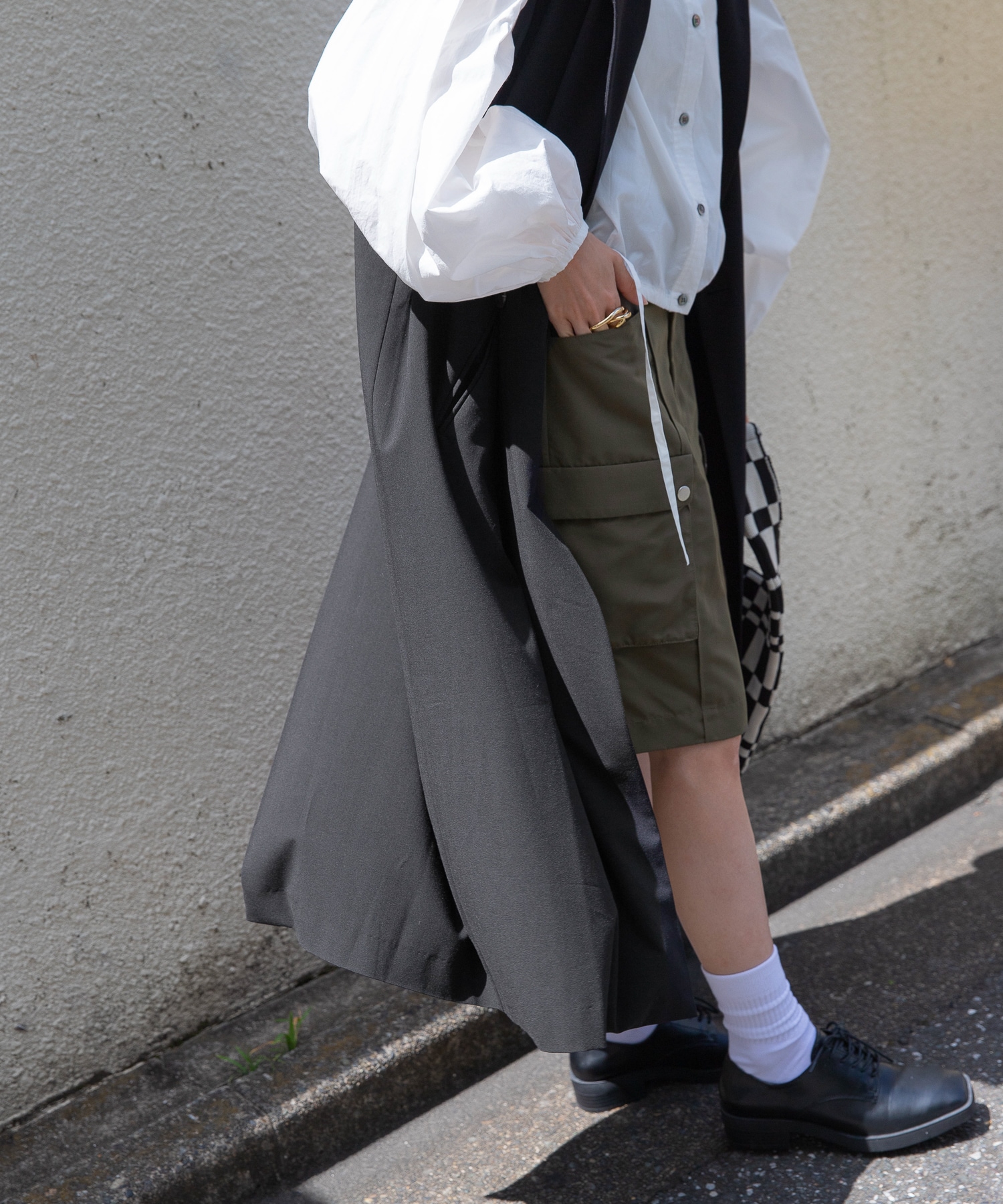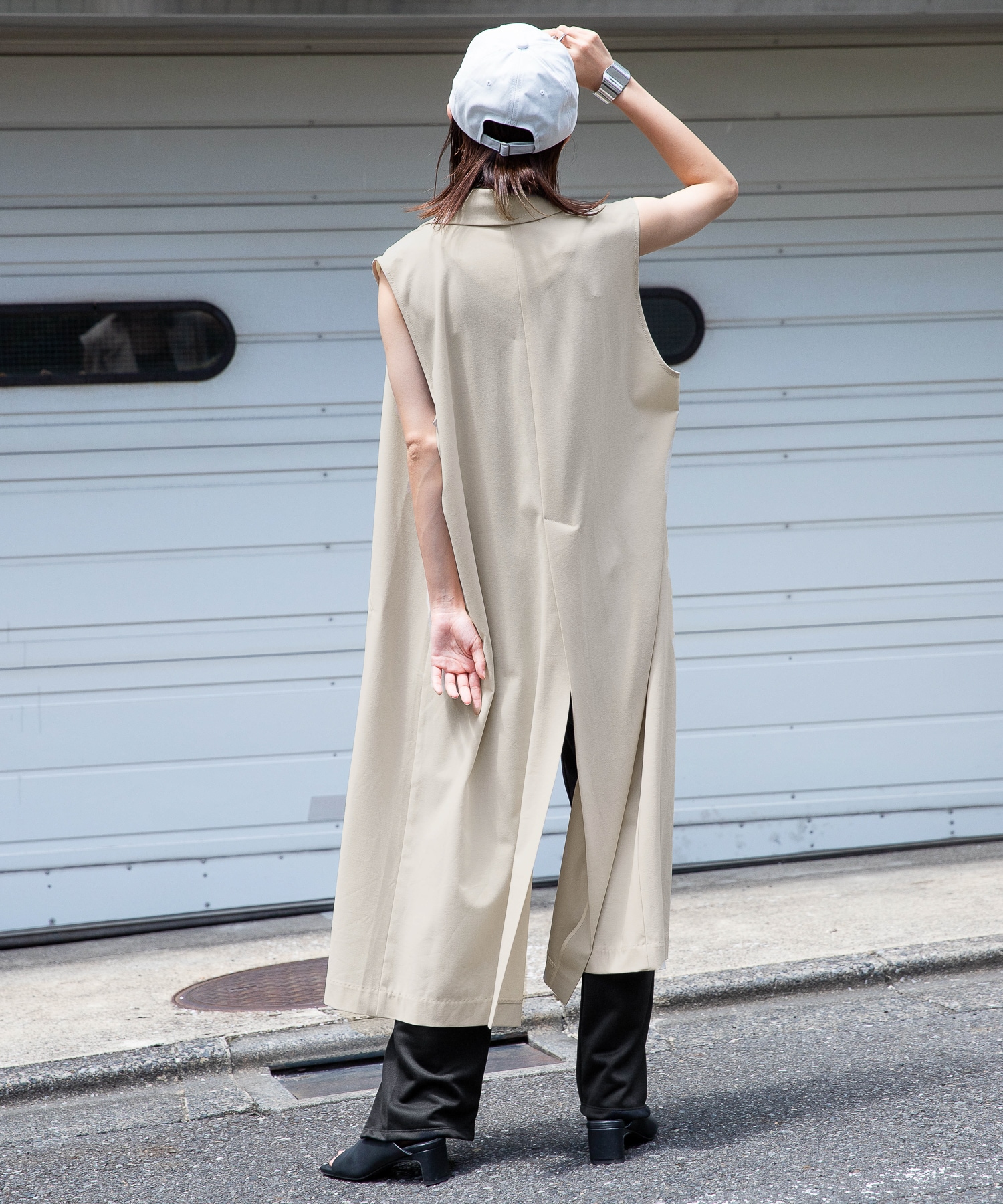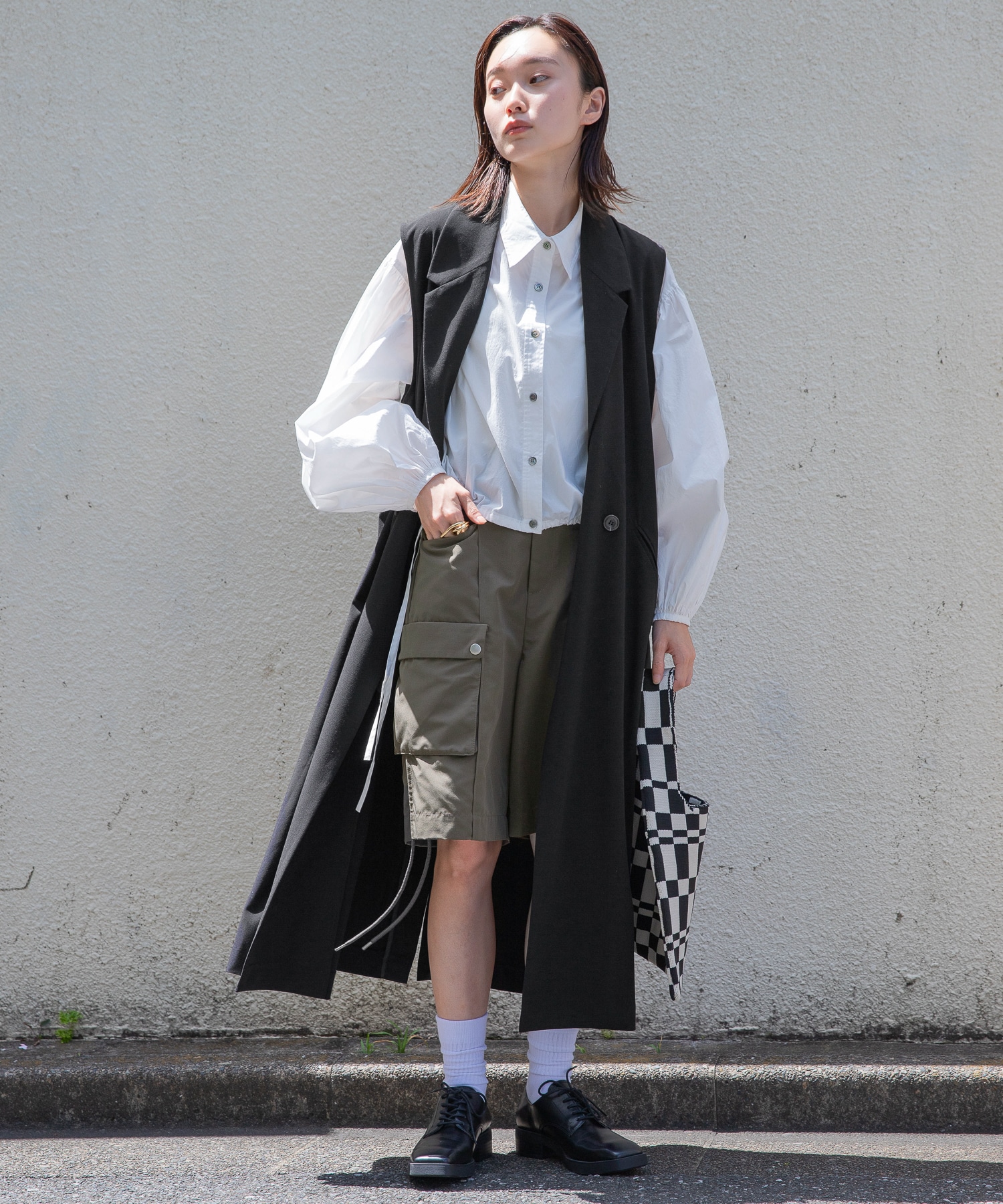 ロングベストなので、ハーフパンツにマニッシュシューズ合わせも抵抗なく着て頂けます。