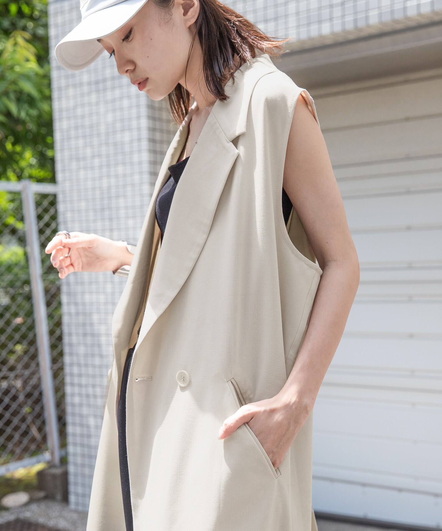 夏の暑い時期なので、トップスはノースリーブのシンプルなものを合わせ爽やかさをプラスしつつも、