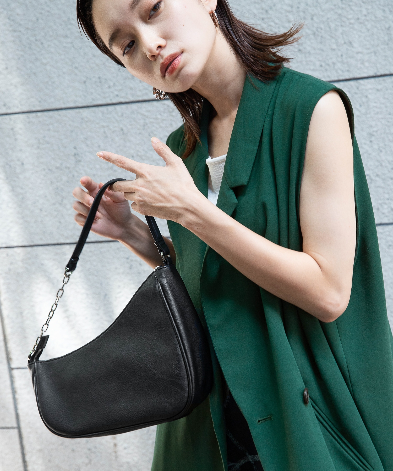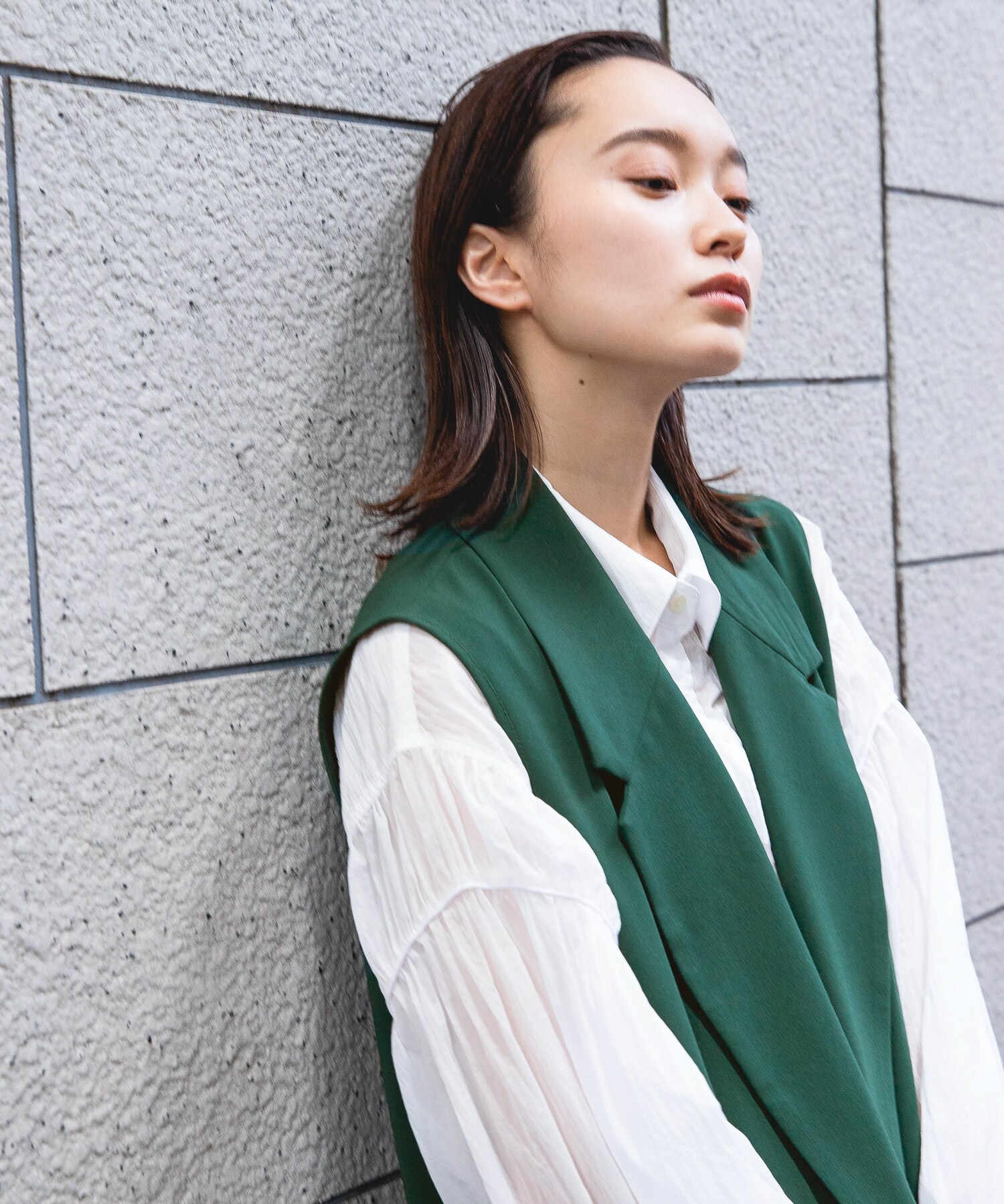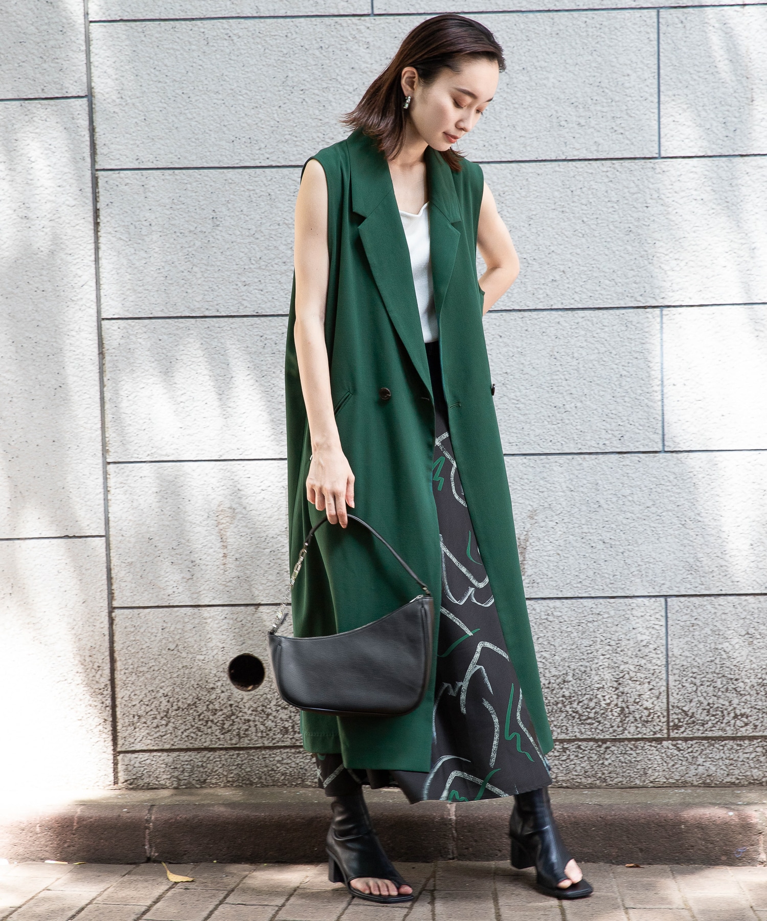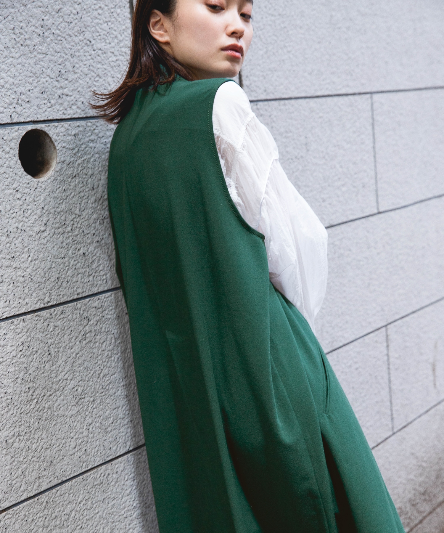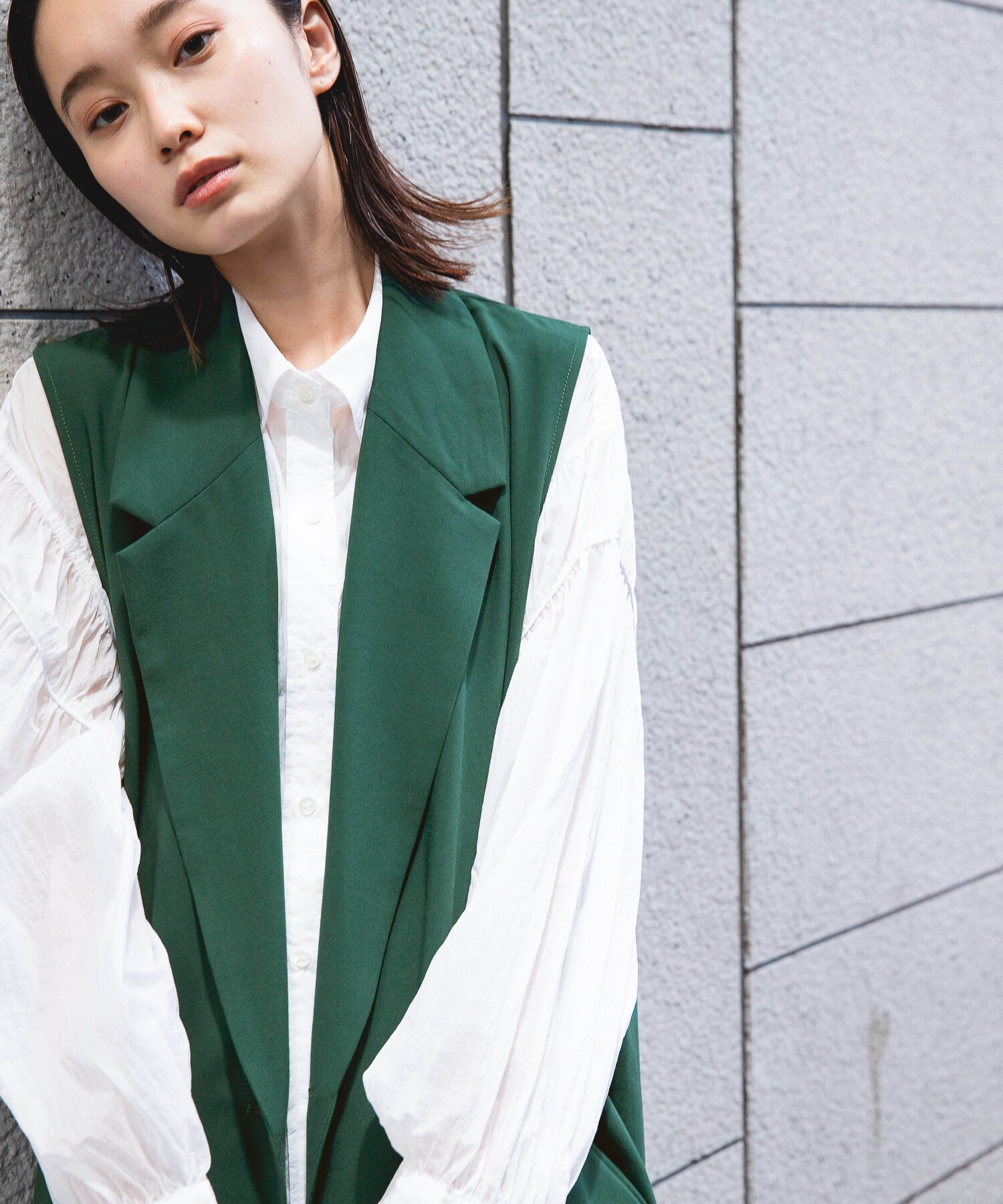 人気のグリーンを主役のベストに取り入れることで、華やかさも◎