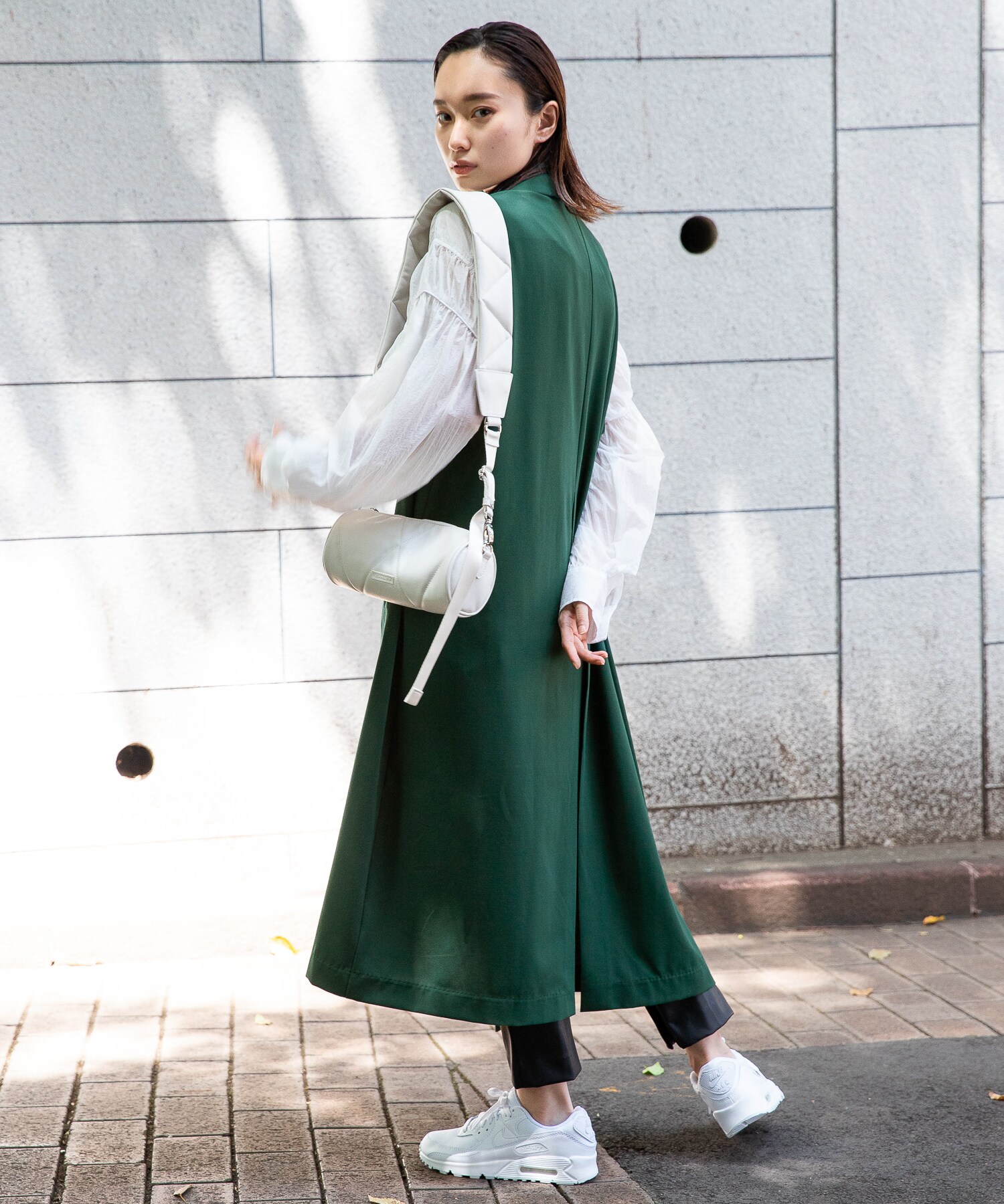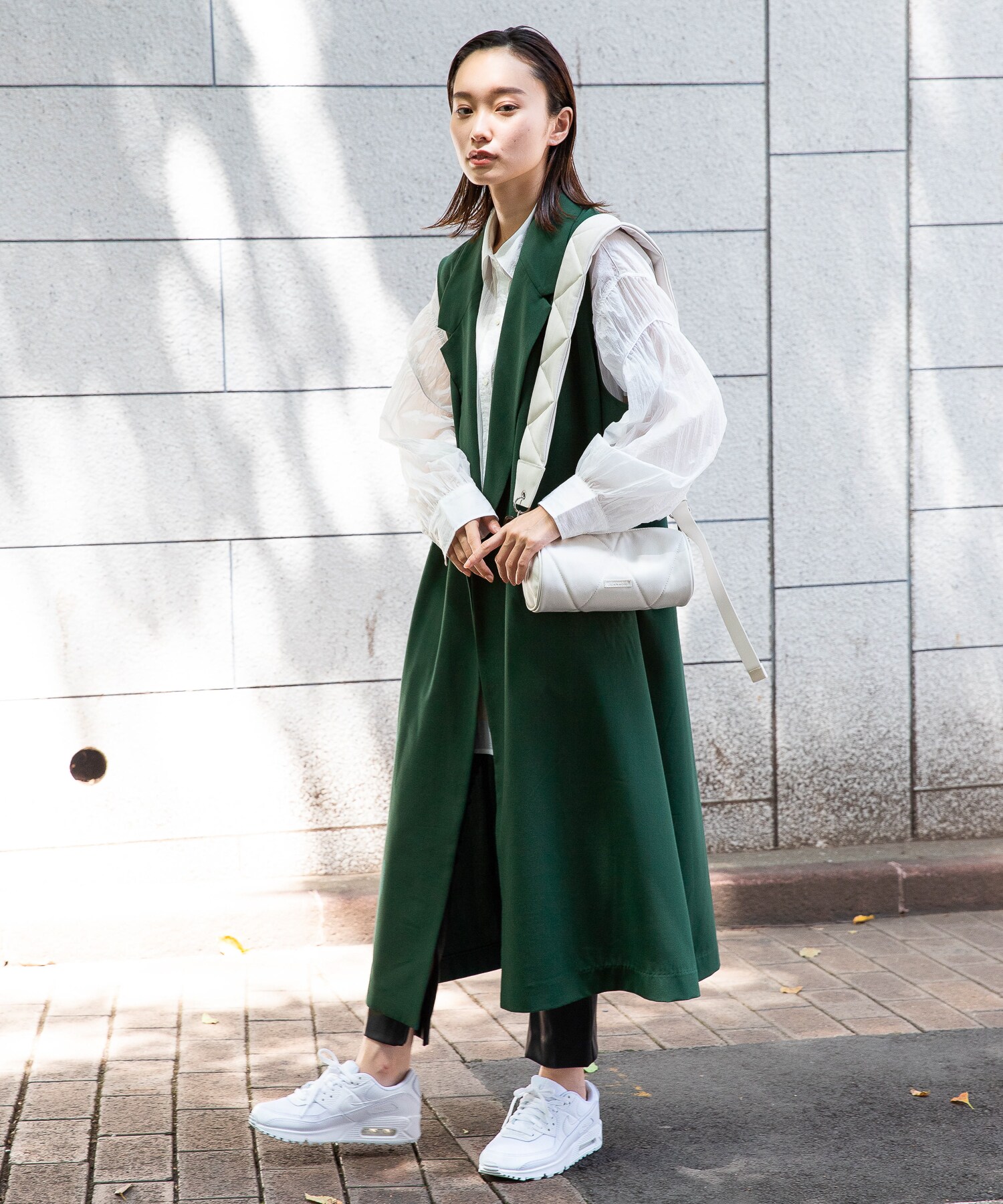 足元のスニーカーとボディBAGで抜け感を忘れずに。