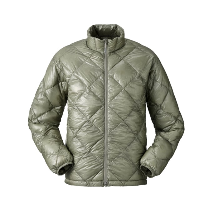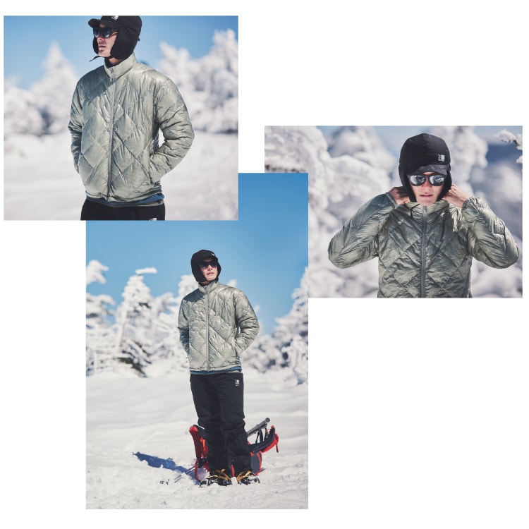 クラシックなダイヤキルトは見た目のデザインだけでなく、横方向のダウンパック構造と比べて羽の偏りが起こりにくく、横方向へのつっぱりを軽減させる効果を持つ。 10Dとしてはトップクラスの引き裂き強度とダウンプルーフ機能を持ったリップストップ素材を採用し耐久性を維持しつつ軽量化を実現。