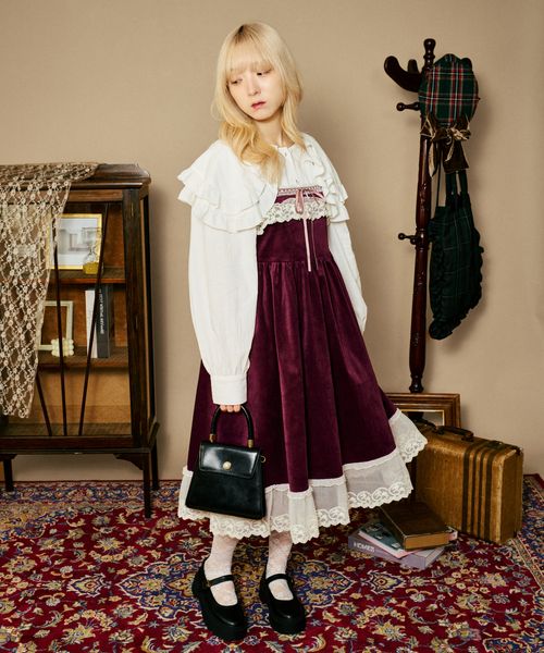 【一部追加予約】【クティールとレトロ】【着丈が選べる!】レースドッキングベロアキャミワンピース