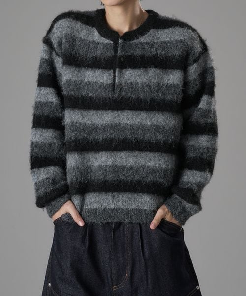 kutirmen/ヘンリーネックシルバーボタンボーダーニット
