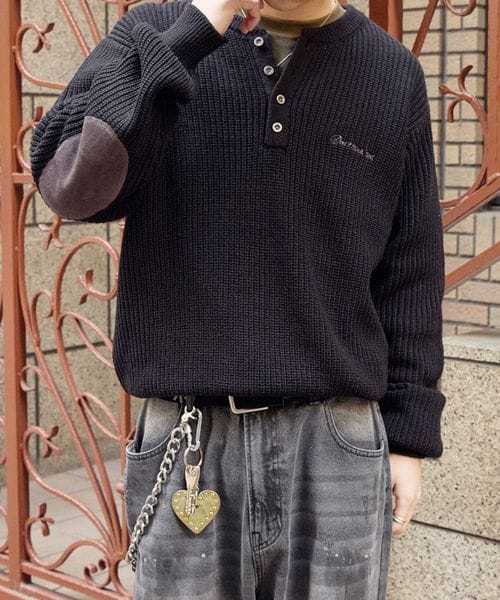 kutirmen/ヘンリーネックスウェードエルボーパッチニット