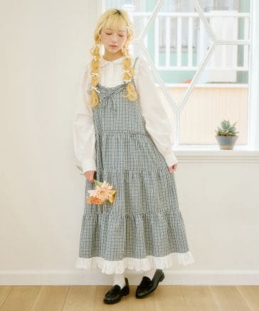 【クティールとレトロ】フリル襟ギンガムチェックティアードワンピース