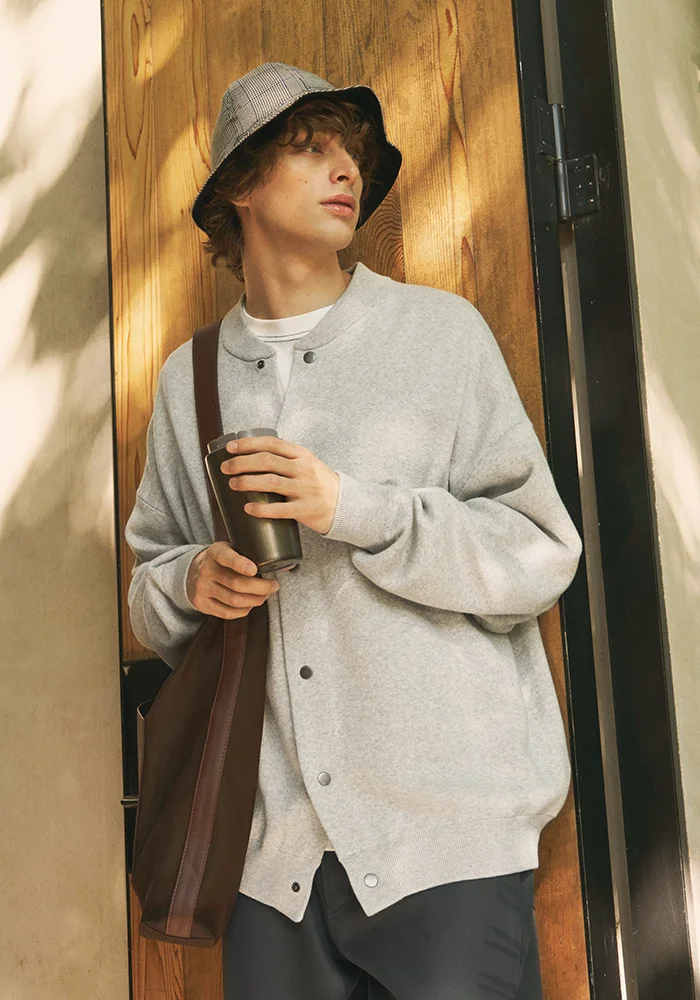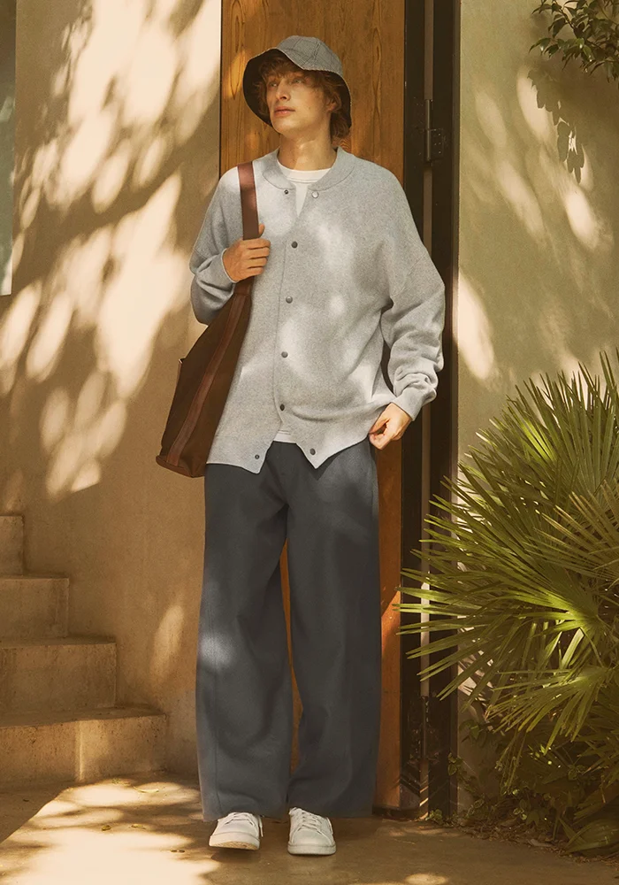 MEN : CARDIGAN [574344] / PULLOVER [582577] / PANTS [497583] / HAT [577547] / BAG [584693]