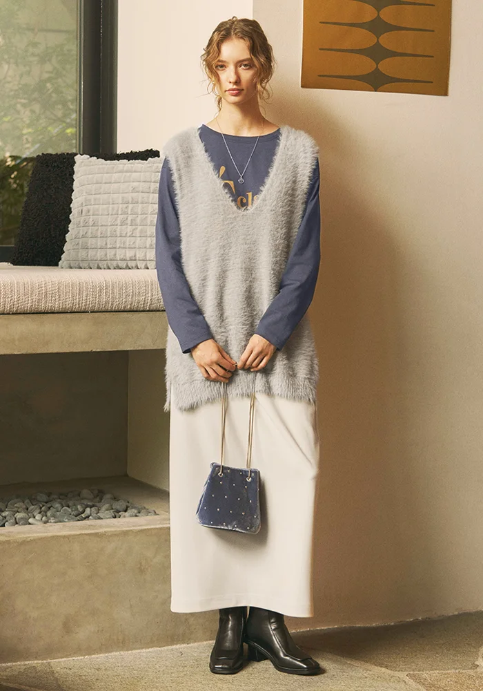 WOMEN : VEST [583731] / PULLOVER [593603] / SKIRT [291439] / BAG [587760] / SHOES [589066]