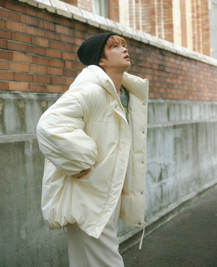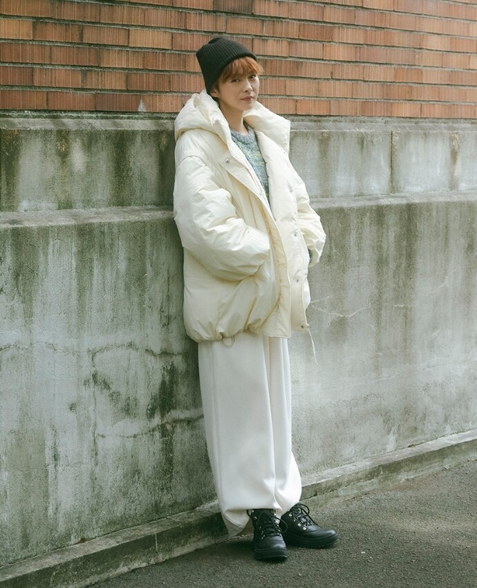 寒空に映える白×白コーデはきれい色のグリーンニットを差し色に。ニットキャップやマウンテンブーツなどアウトドア感のある小物を合わせることで、都会的なのにシンプルすぎない大人カジュアルが完成。