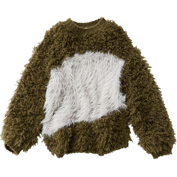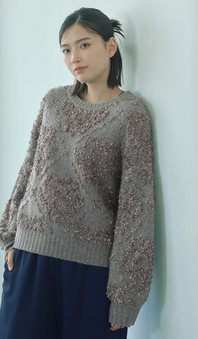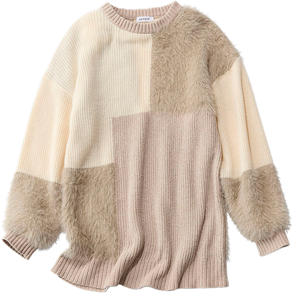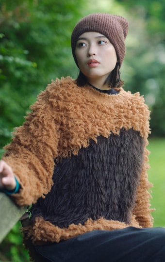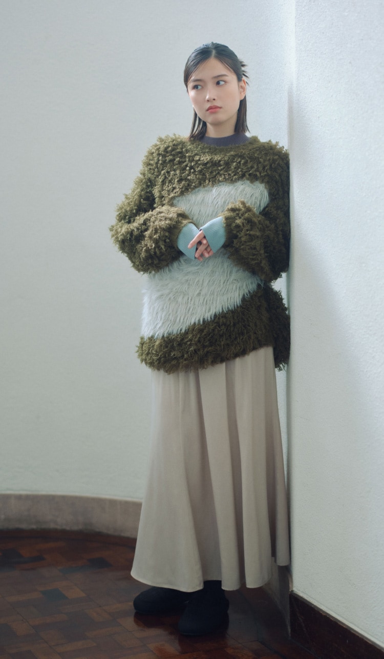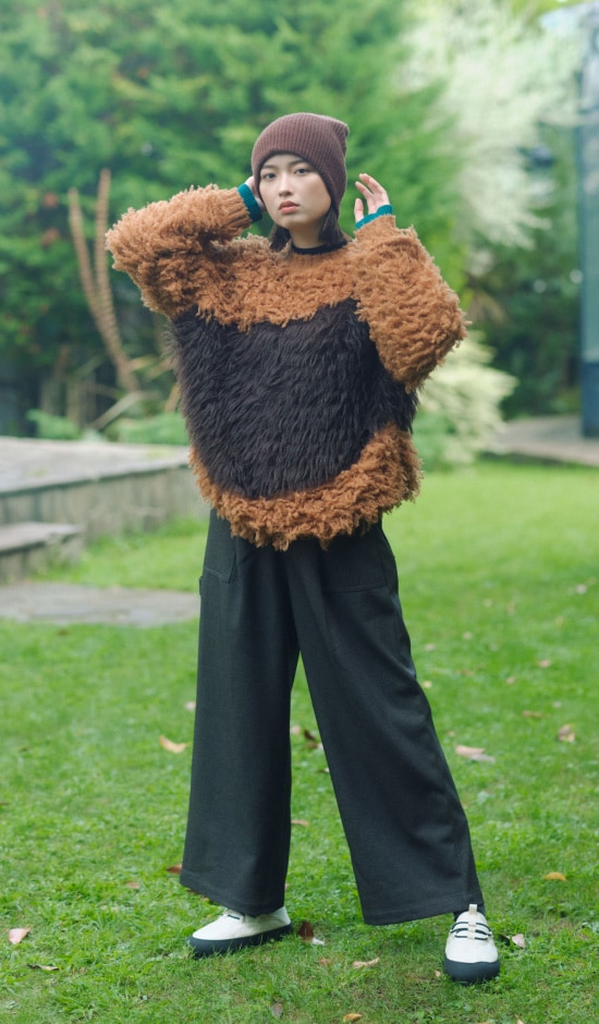 思わず触りたくなる、フリンジニットを主役にしたコーデ。ベージュのスカートとブラックのシューズで、全体にメリハリを効かせるのが野暮ったく見えないコツ。