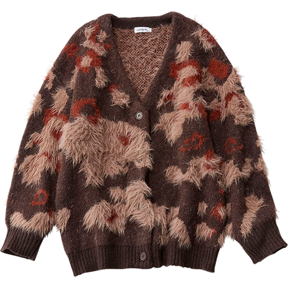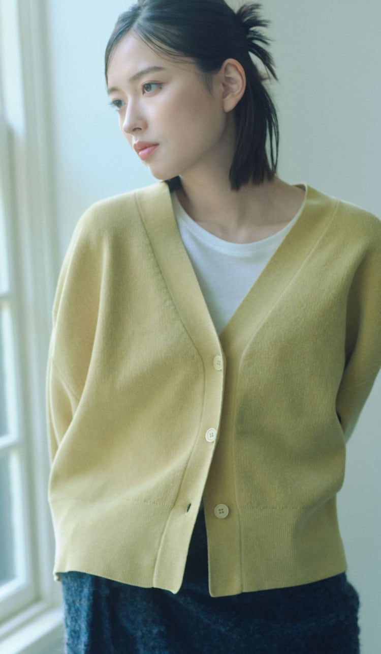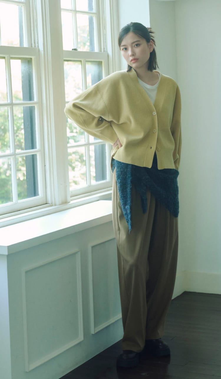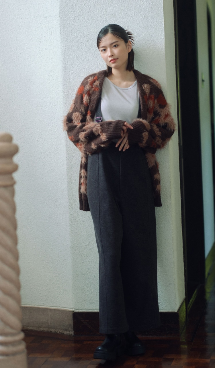 マルチカラーのカーディガンでさりげなく色を楽しむ冬の装い。ストレートシルエットのパンツと合わせれば、シックにまとまります。