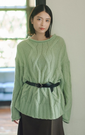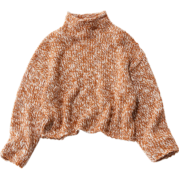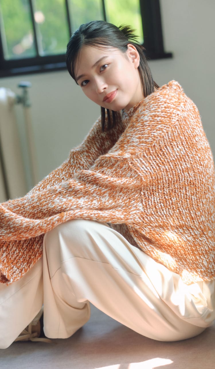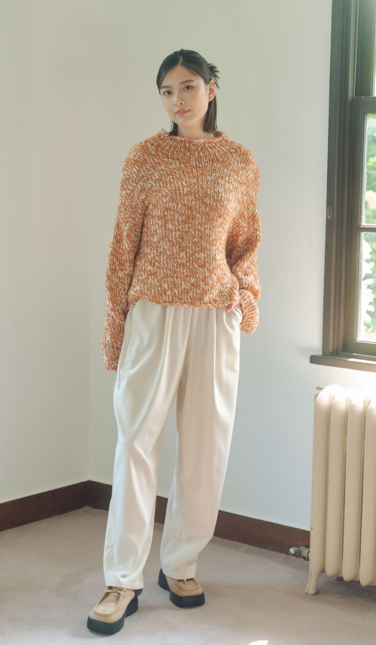 オレンジのニットとホワイトパンツで、冬のコーデに軽やかさをプラス。寒さが増す季節も、鮮やかな色で気分を上げて。