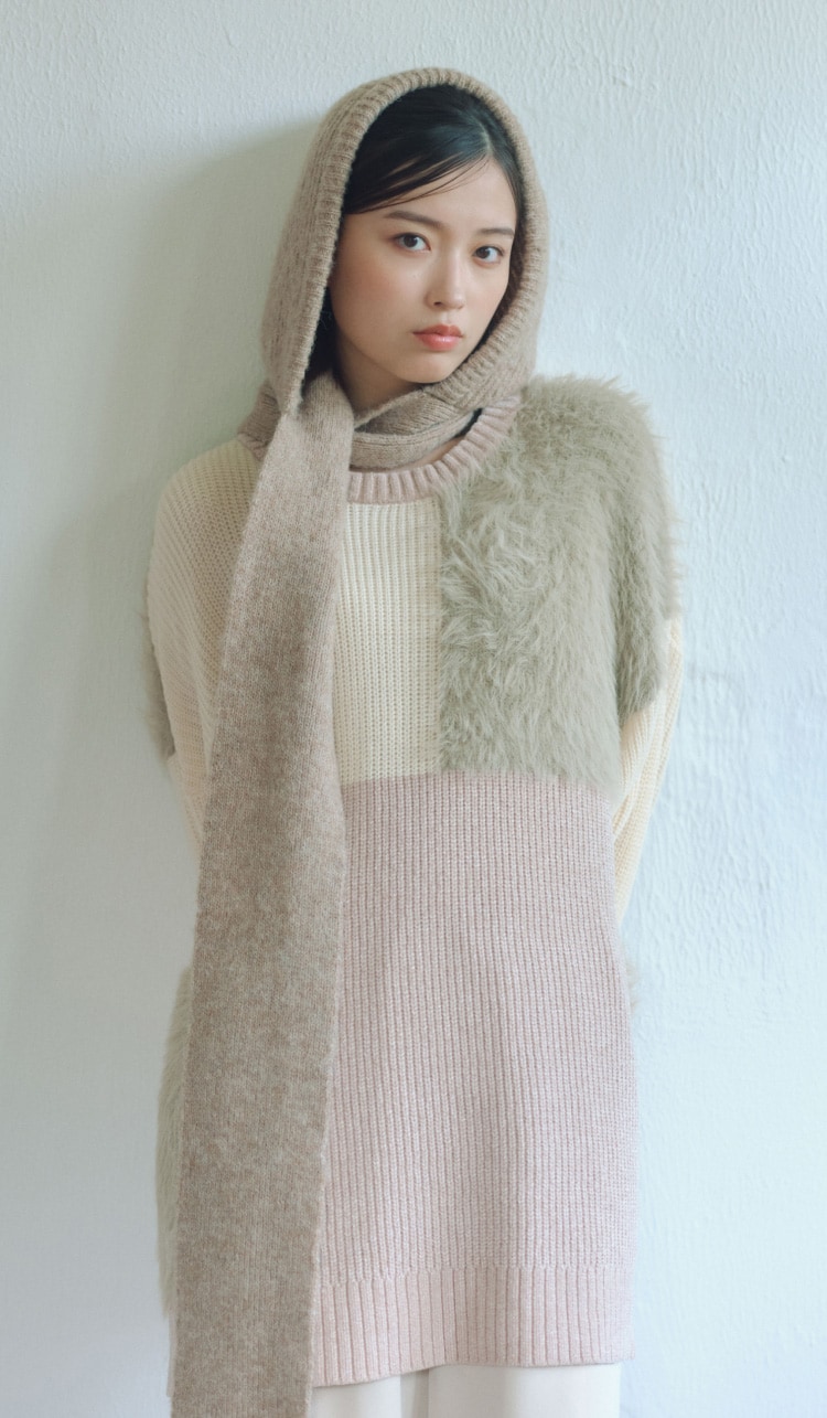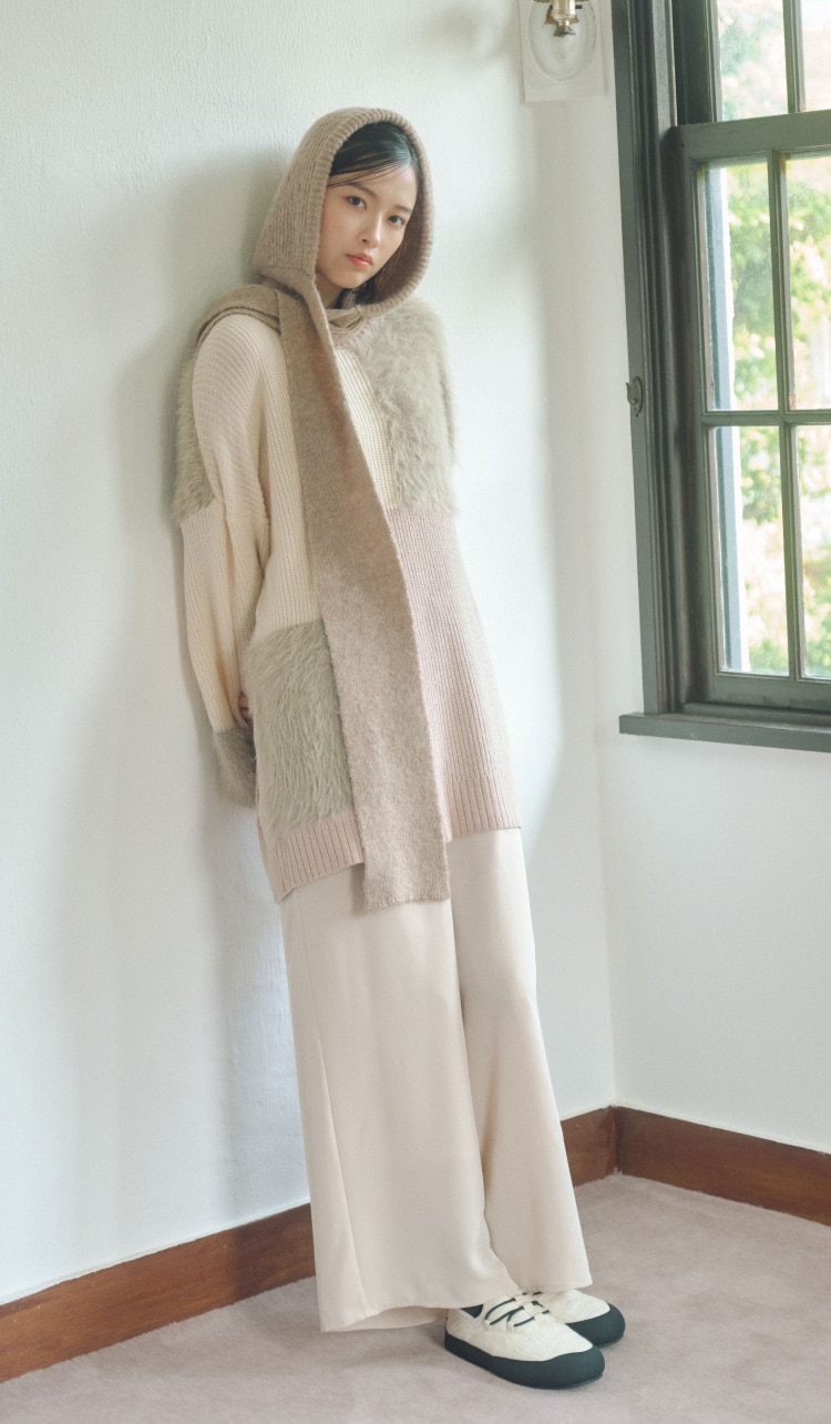 ベージュとオフホワイトで整えたワントーンコーデ。ストールは頭にも巻きつけて、甘さを効かせるのがポイント。