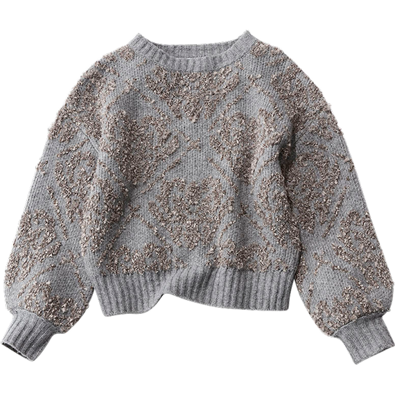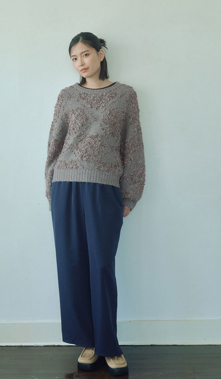 グレーニットとネイビーパンツでつくる、上品で知的なコーデ。美術館や街歩きといった大人な休日にも似合う、シンプルながら印象的な装い。