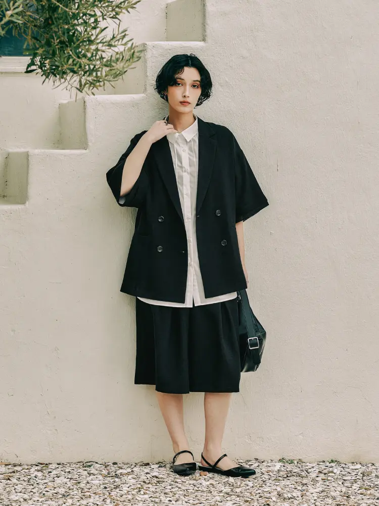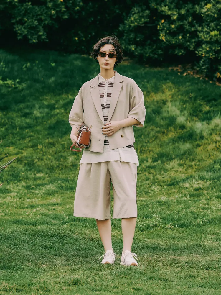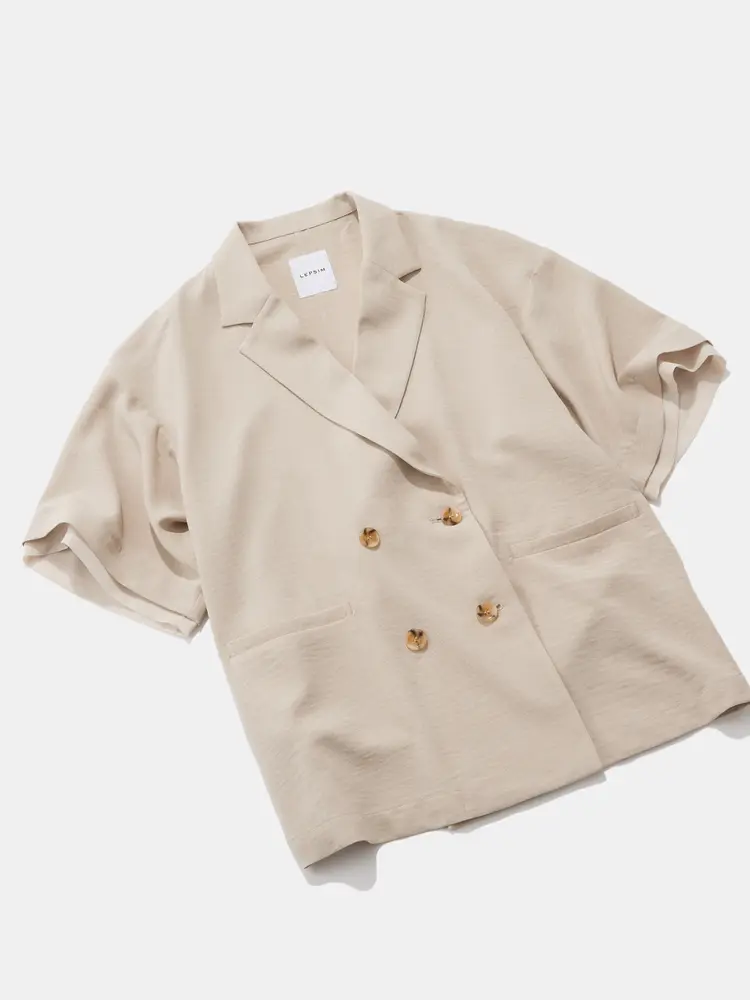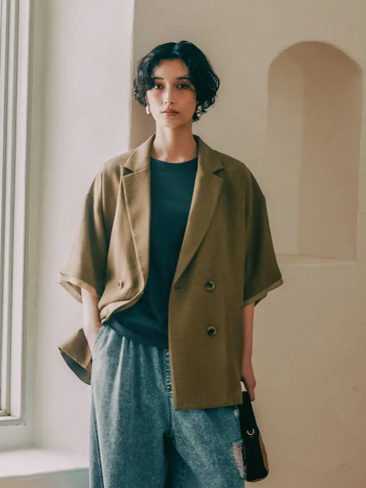 オーバーサイズのジャケットと、ワイドなハーフパンツの組み合わせで、こなれ感のあるシルエットに。