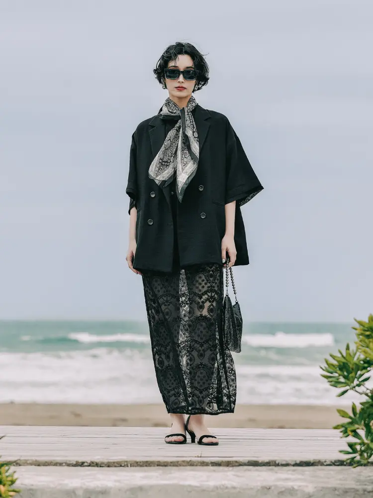 異なる質感の黒を重ねることで、ワントーンでも奥行きのある洗練された都会的な装いに。