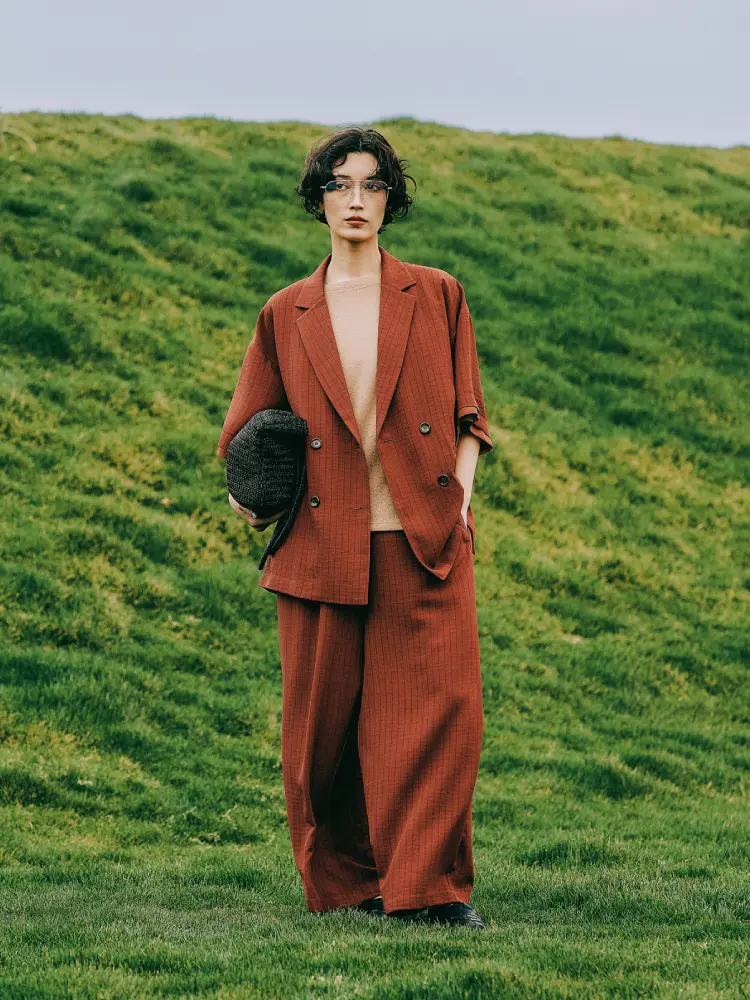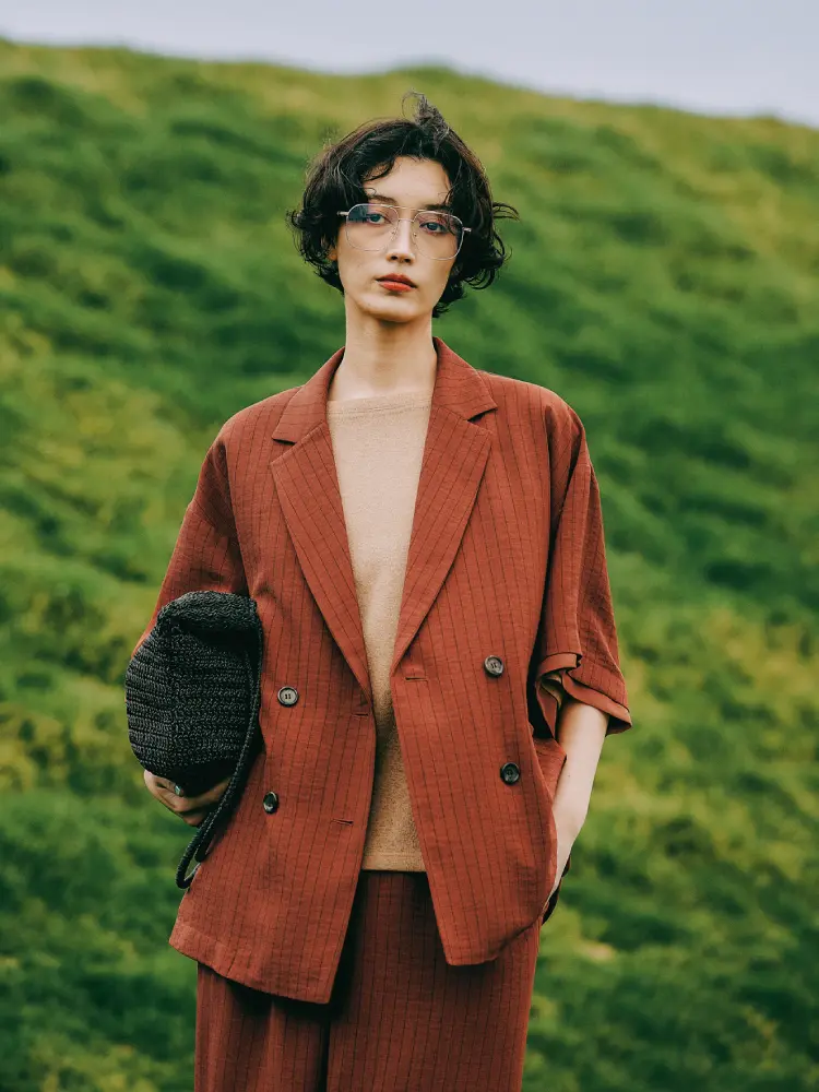 テラコッタのセットアップにベージュのインナーを合わせ、温かみと落ち着きのある洗練された配色に。