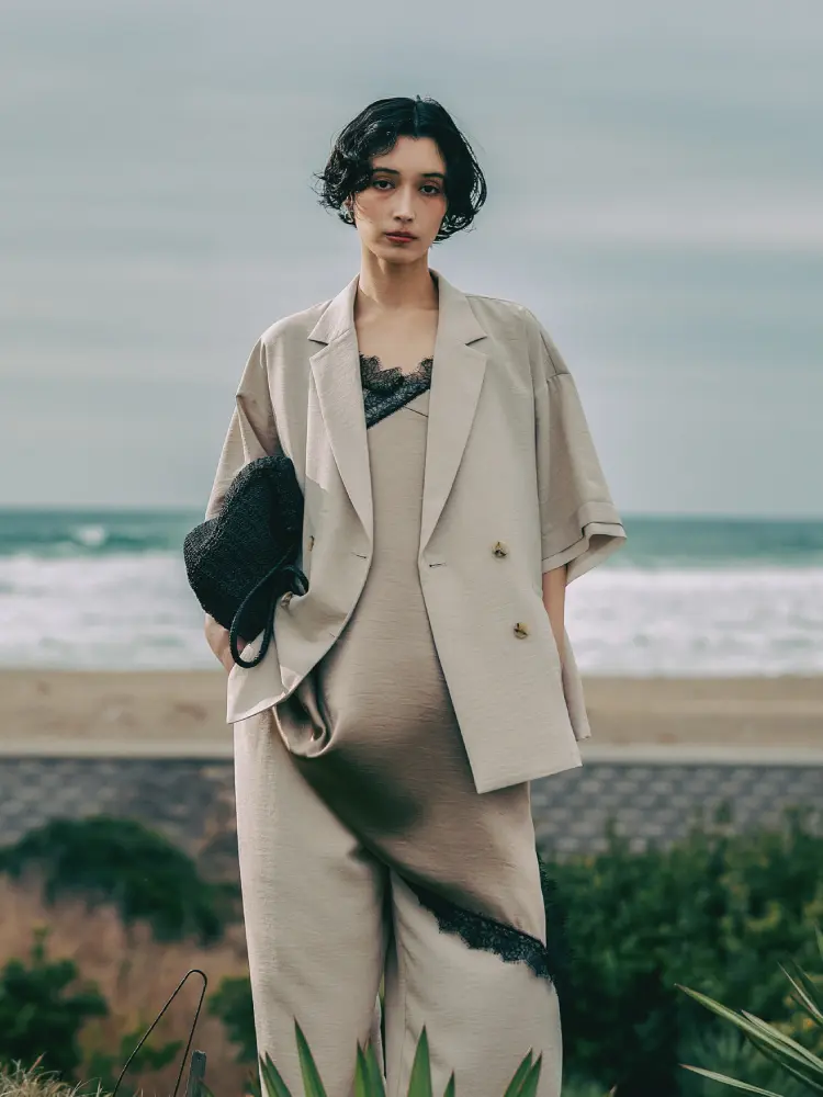 洗練された夏のワントーン。全体を軽やかなベージュで統一し、都会的で洗練された雰囲気に。