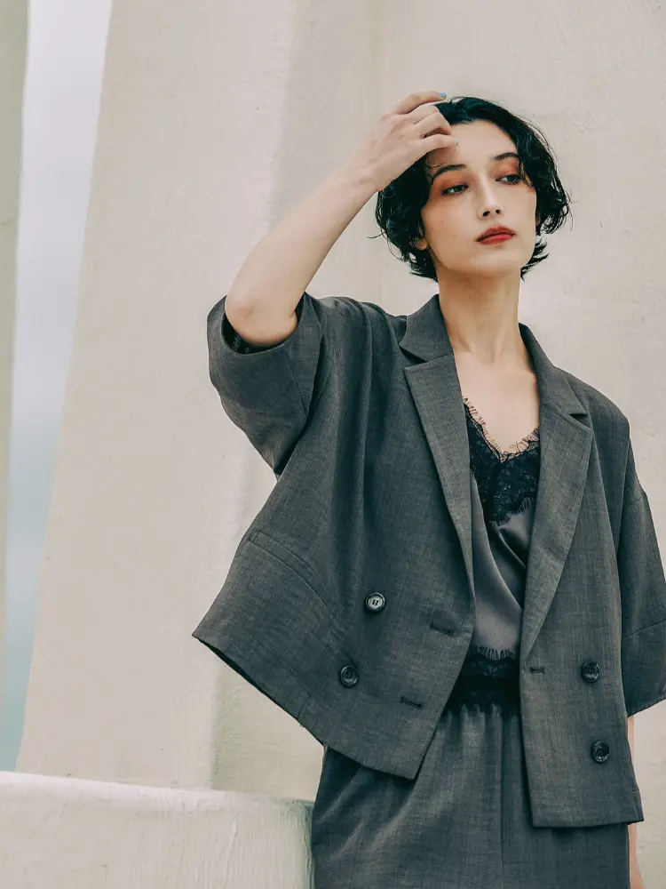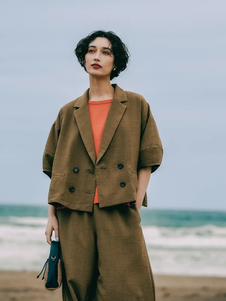 トレンドの「袖レイヤード」を楽しむ、こなれ感抜群のジャケット。リネン見えする軽やか素材で、さらっと羽織るだけで今年らしい装いに。「ジャケットはかっちりしすぎて苦手」という方にもおすすめの柔らかさとトレンド感を両立した一着。