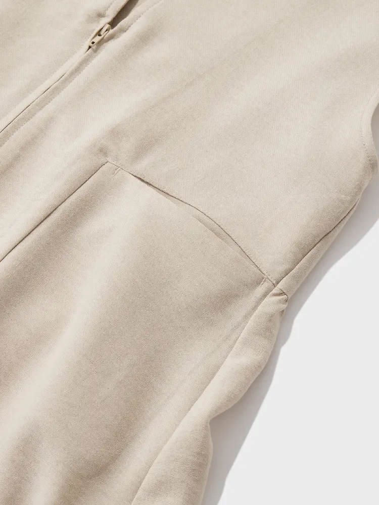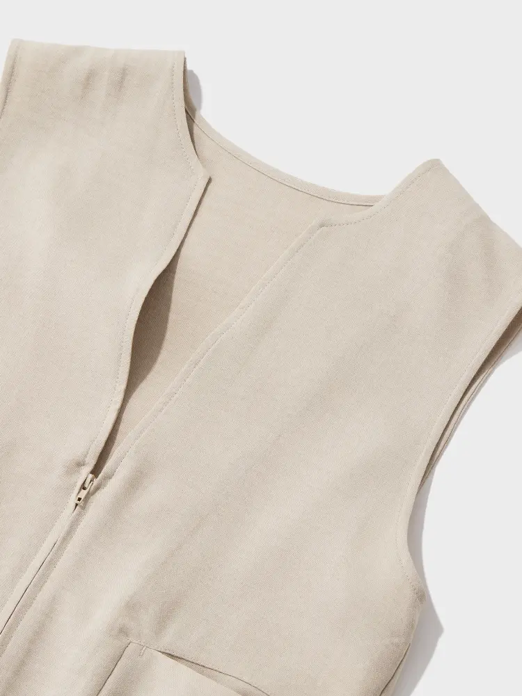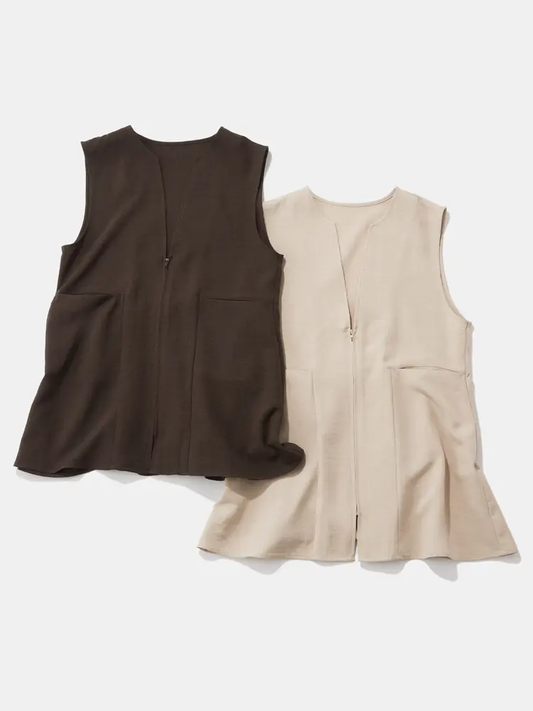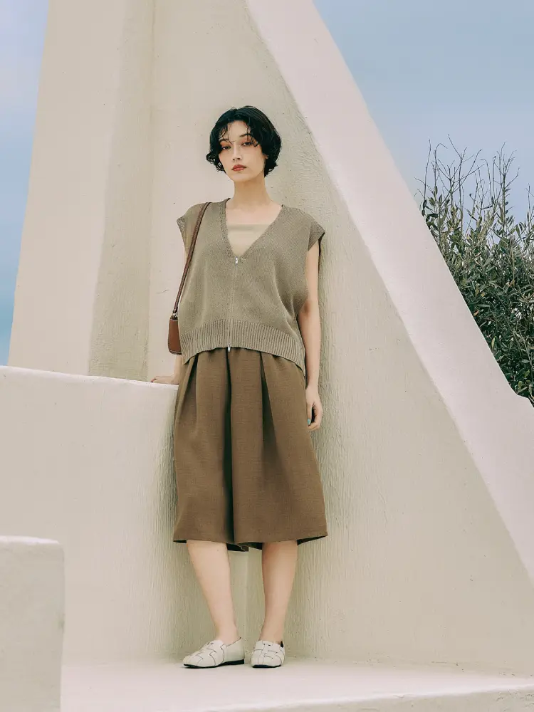 フロントジップのニットベストを主役に、インナーとのレイヤードでデコルテに女性らしい抜け感を演出。