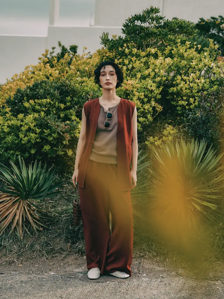 モダンなレイヤード。ブラウンのジレとパンツのセットアップに、ニュアンスベージュを差し込み、重さを削ぎ落とした洗練された配色に。