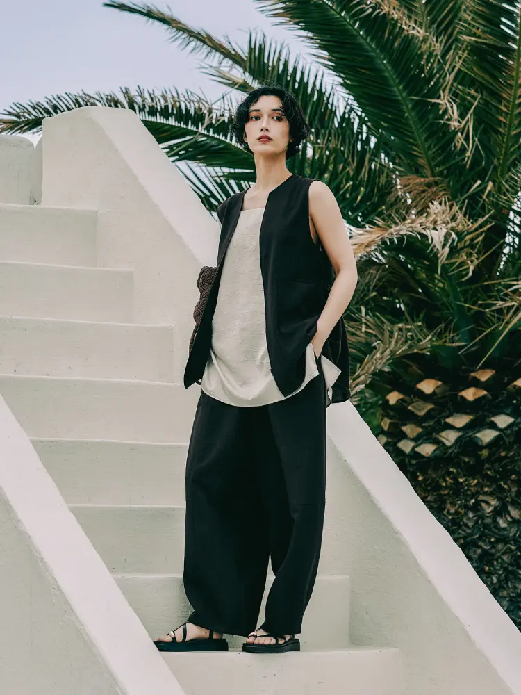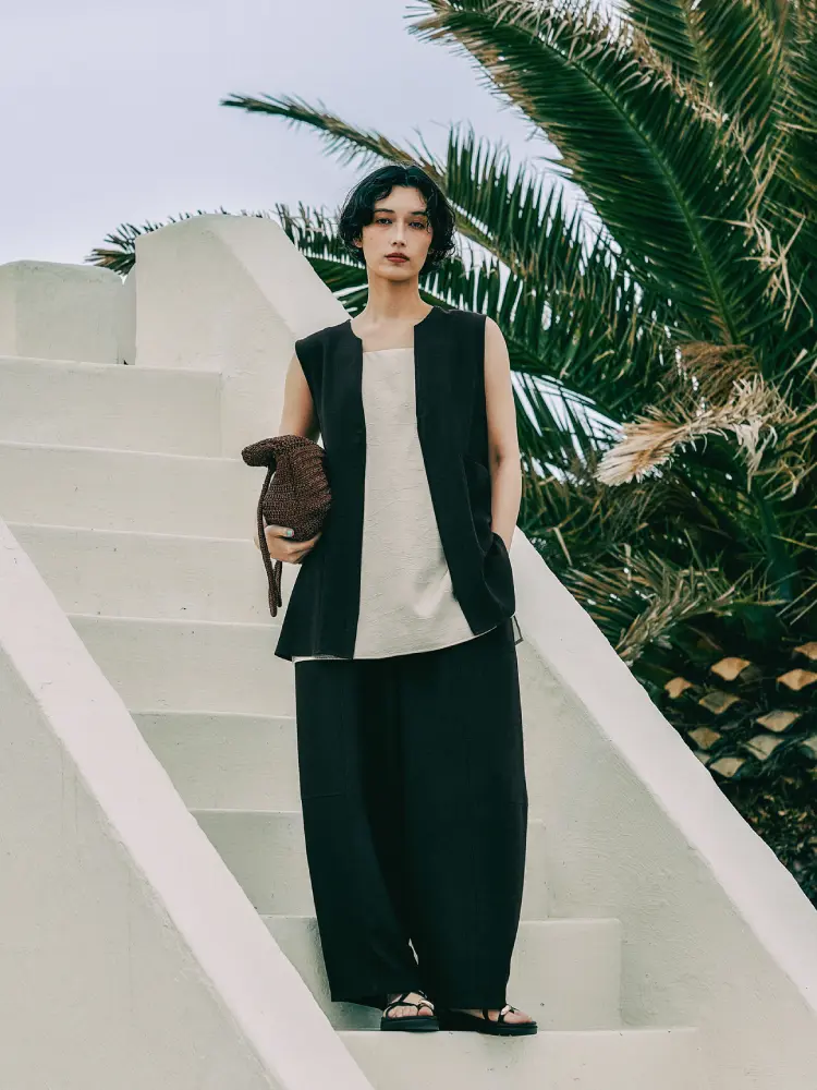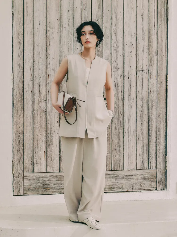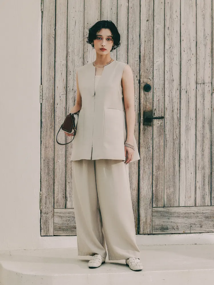 ノーカラーベストを羽織り、縦のラインを強調することで、スタイリッシュでスタイルアップ効果も。