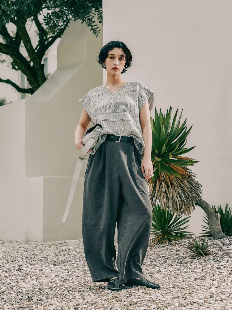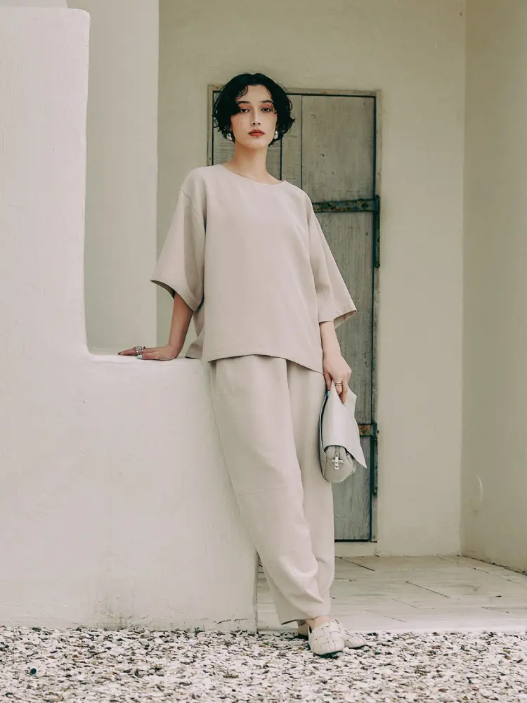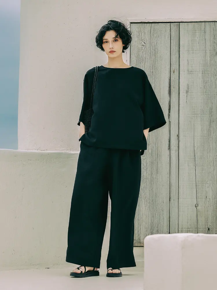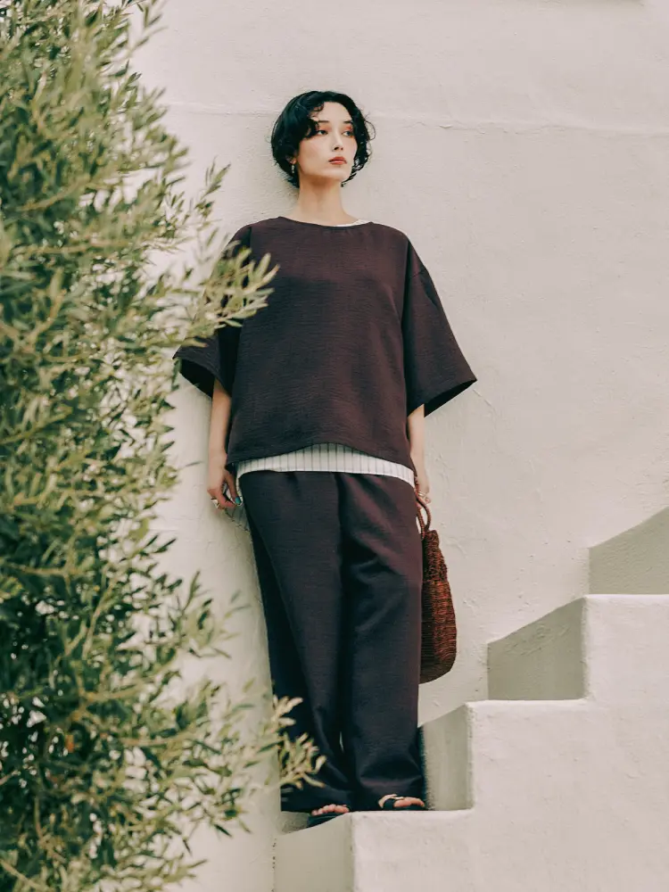 トップスのさりげない柄と、パンツの柔らかなドレープ感が重なり、シンプルながらも表情豊かな仕上がりに。