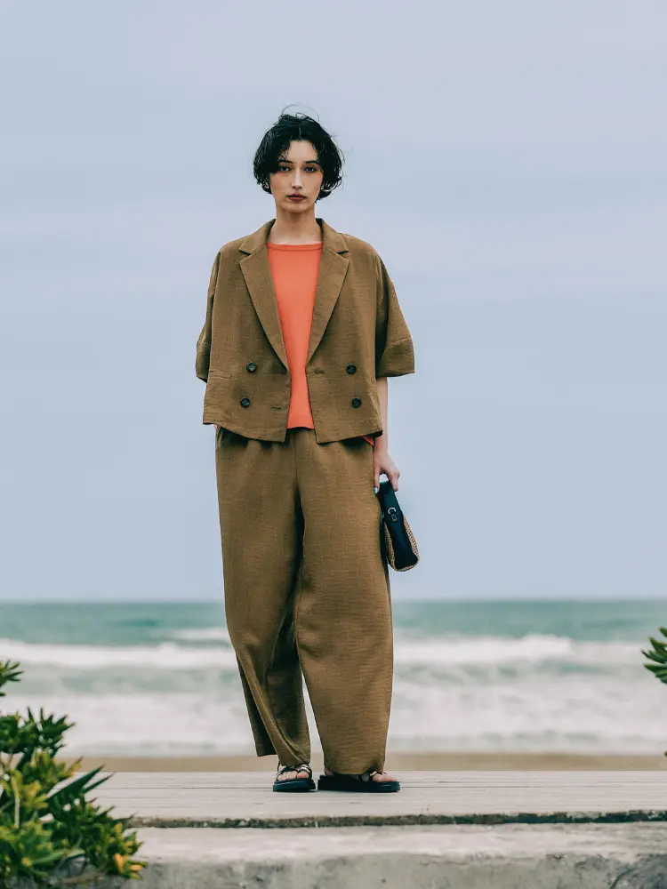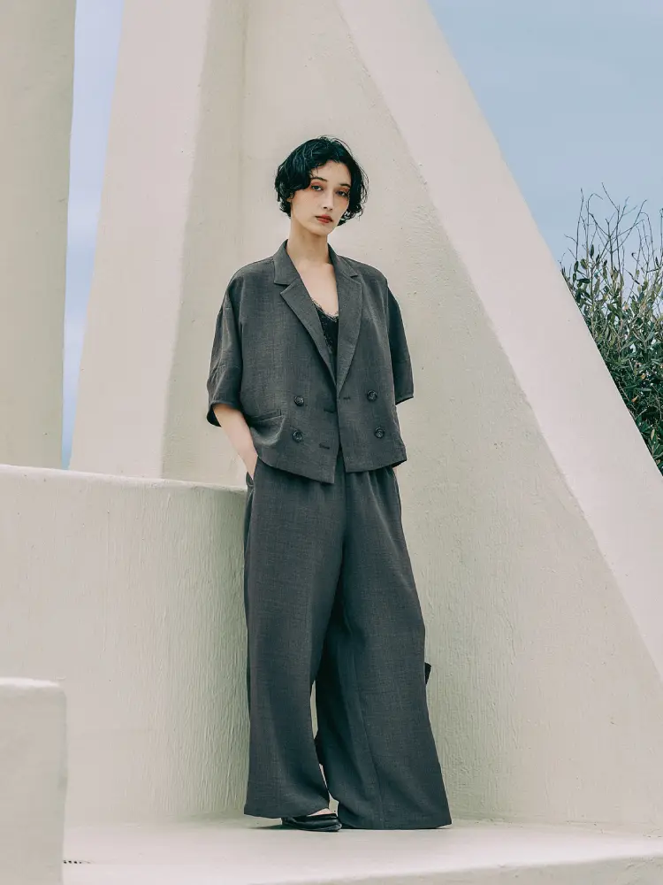 ジャケットはボタンを外してラフに羽織り、ワイドパンツはゆったりと抜け感のあるシルエット。