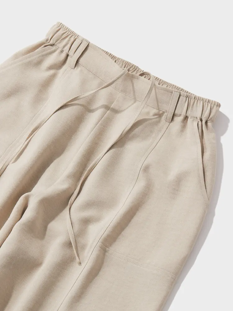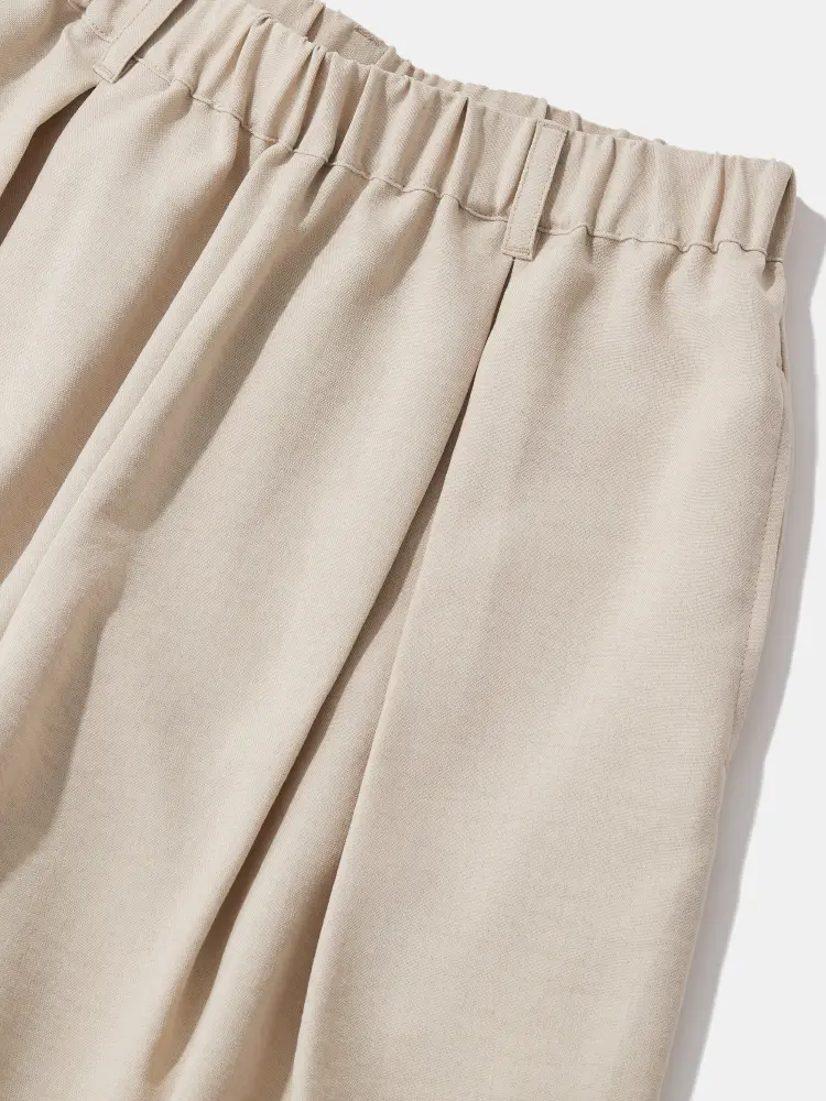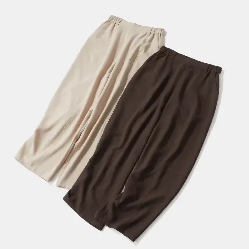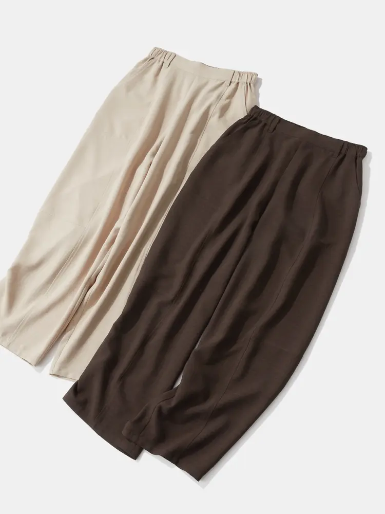 バックウエストゴムで、楽な履き心地と「きちんと感」を両立。斜めのカッティングポケットがアクセントを添えます。膝回りの絶妙な切り替えにより、コクーン特有の丸みを立体的かつスマートに表現したこだわりの一着です。
