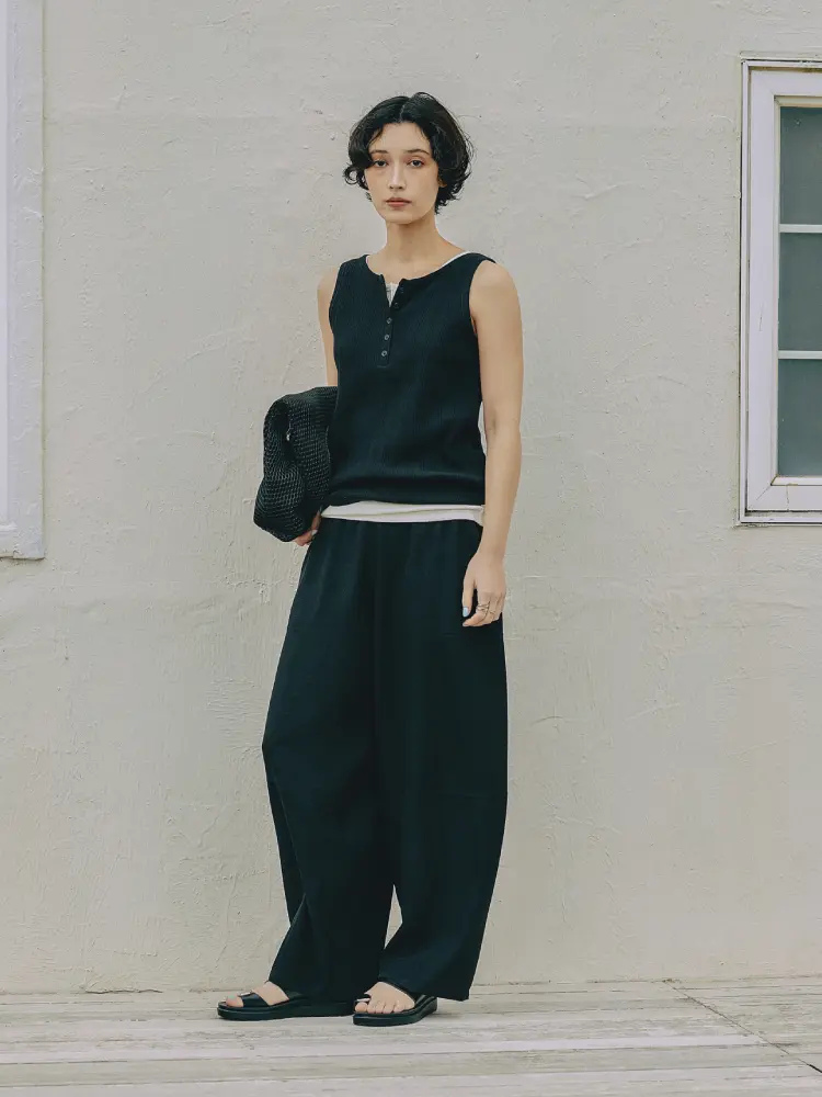 コンパクトなリブタンクと、ボリューム感のあるワイドパンツで、メリハリのある旬なバランスを構築。